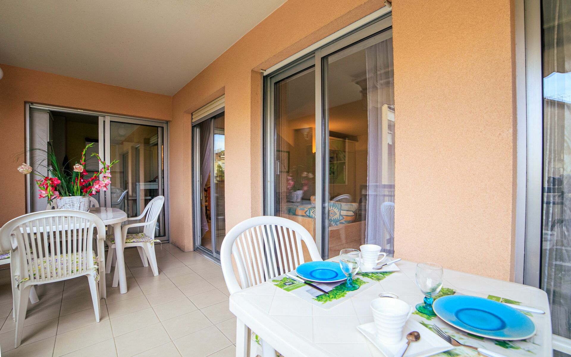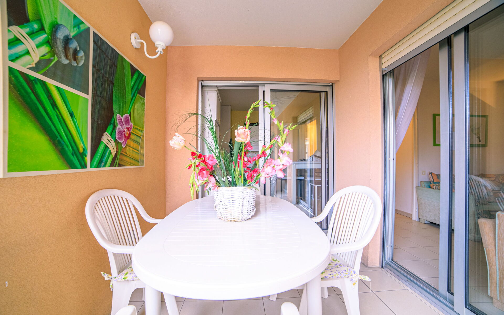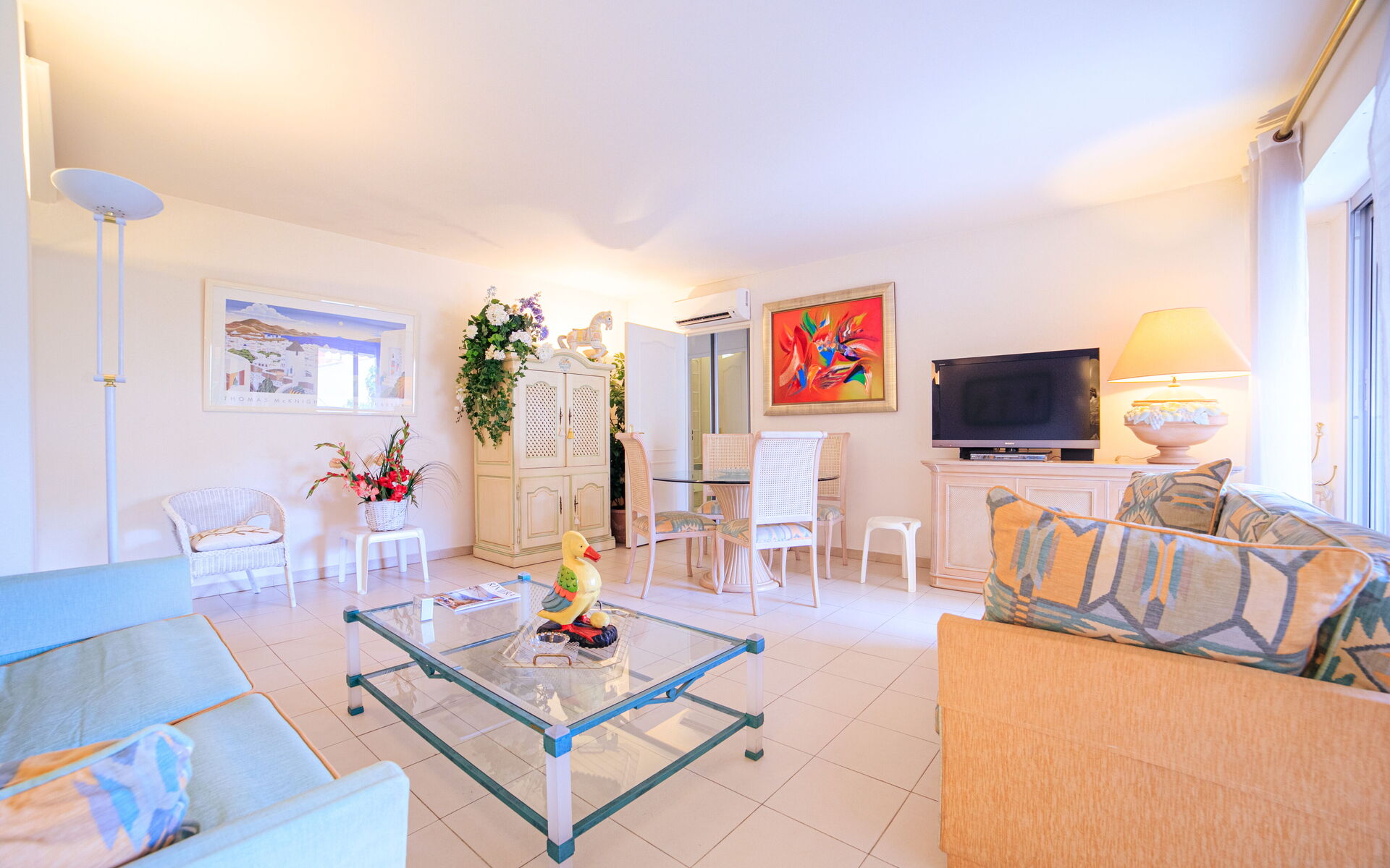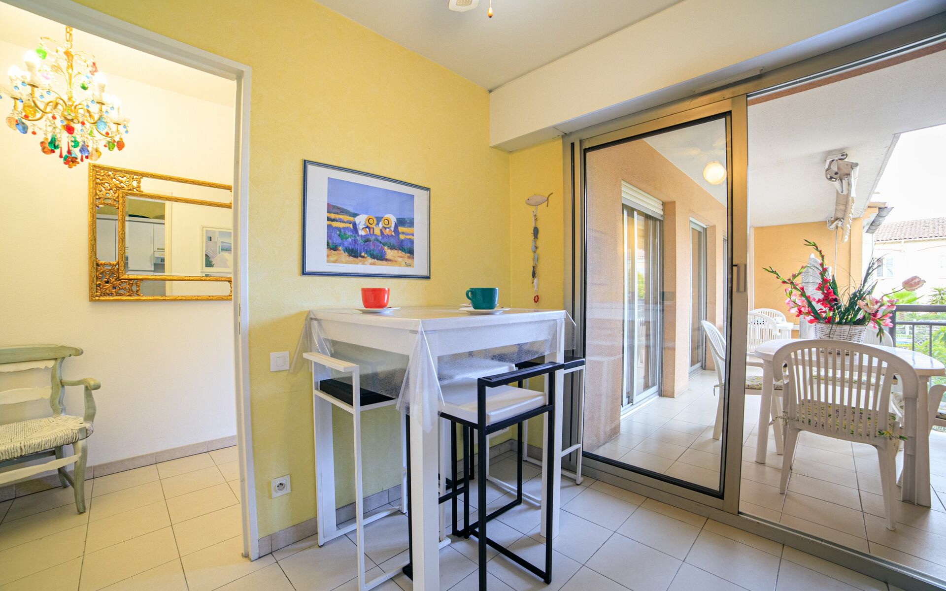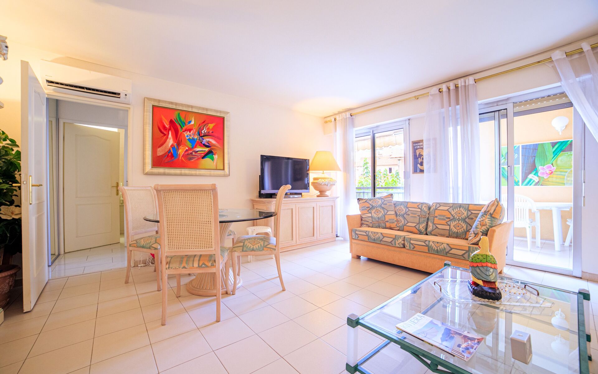 - Salon : Séjour spacieux donnant la terrasse + lit escamotable (140x190) + TV écran-plat + table pour 4 + climatisation