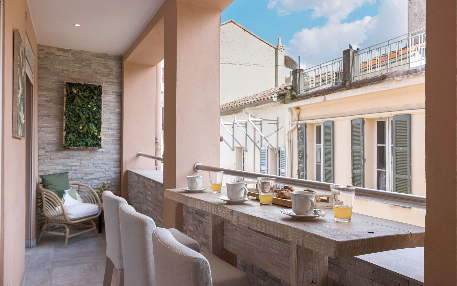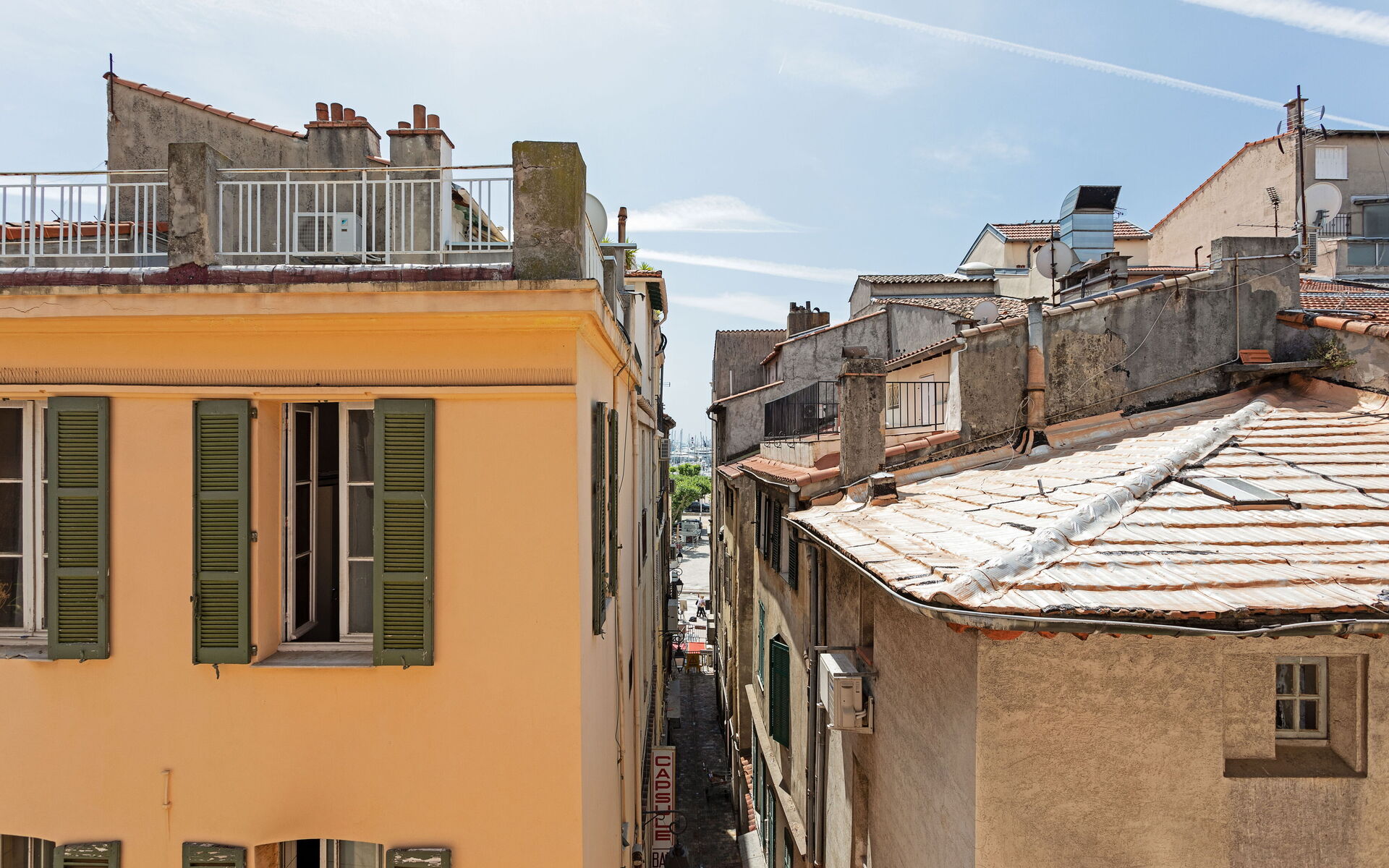 Ce spacieux appartement de 3 chambres avec climatisation et balcon, est situé au centre de Cannes, rue Meynadier au 3ème étage d'un immeuble ancien.