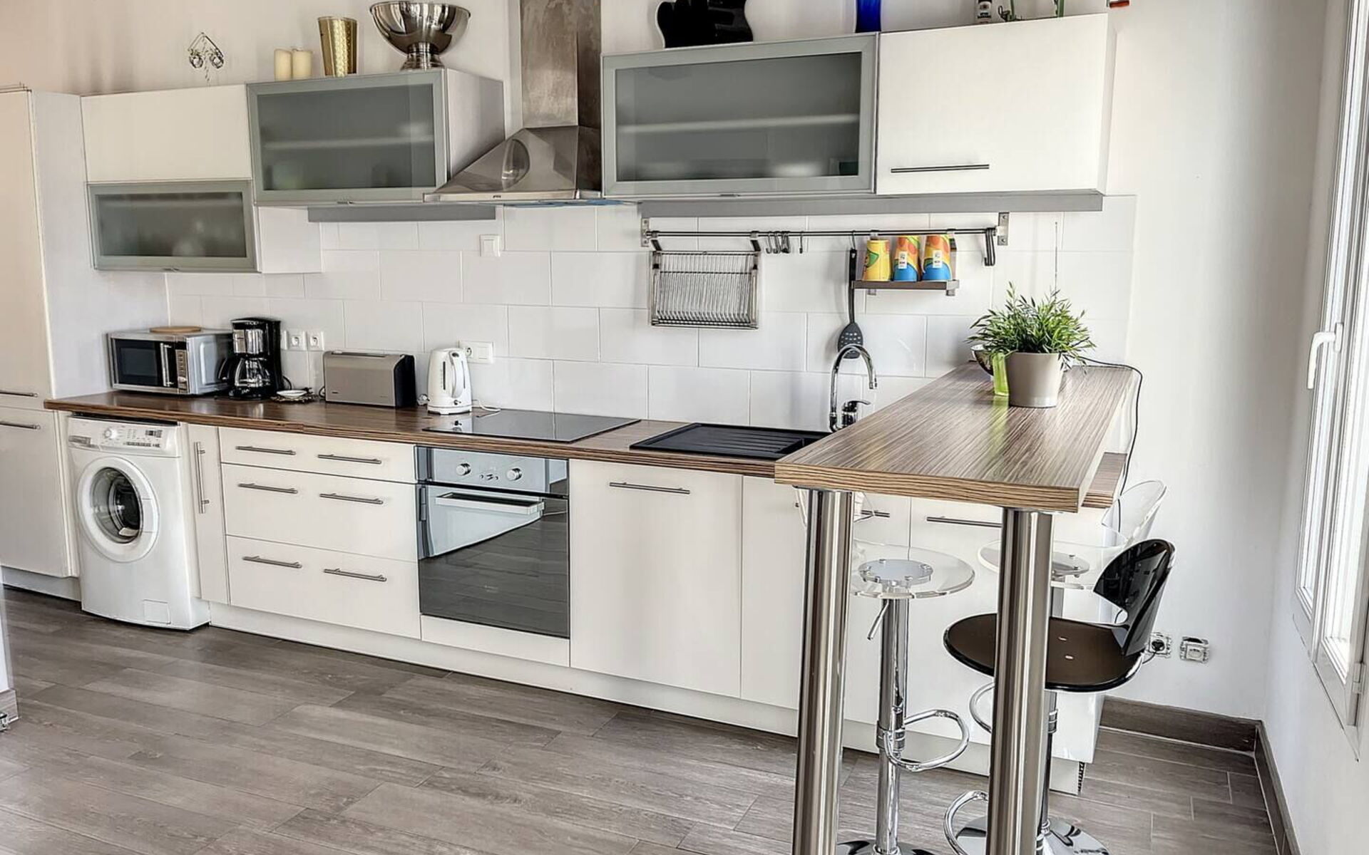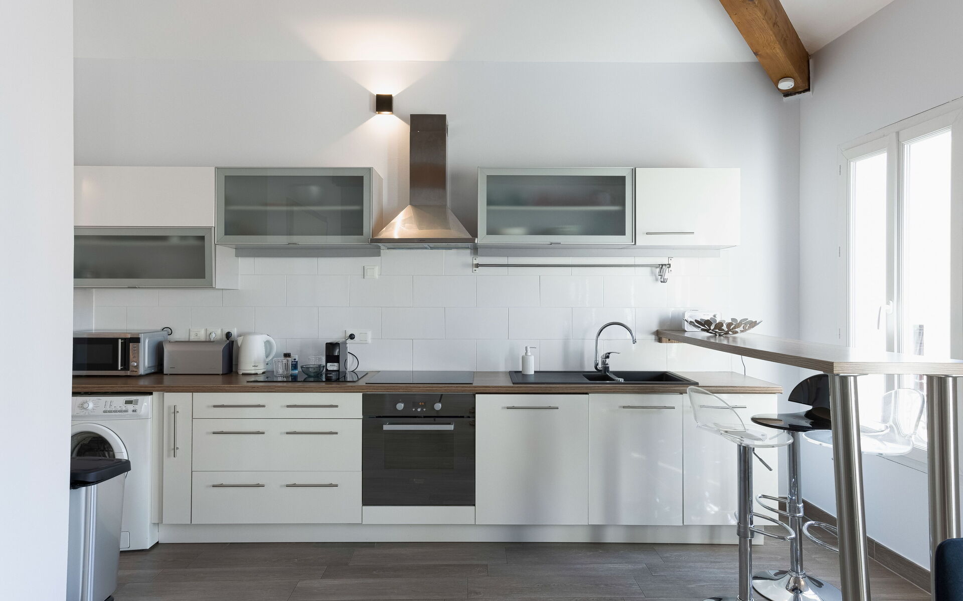 - Cuisine américaine toute équipée : frigo + bouilloire + toaster + micro-ondes + machine à café + Nespresso + lave vaisselle