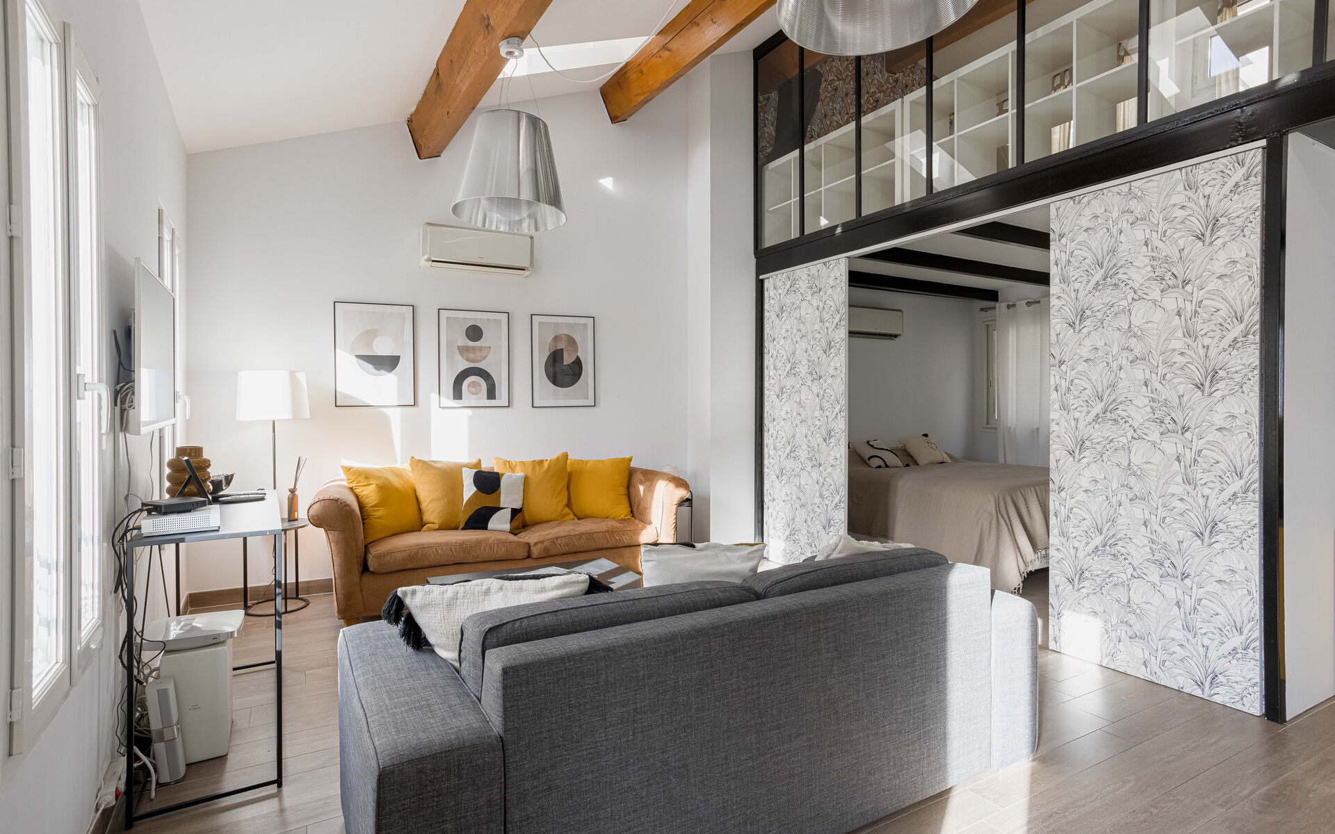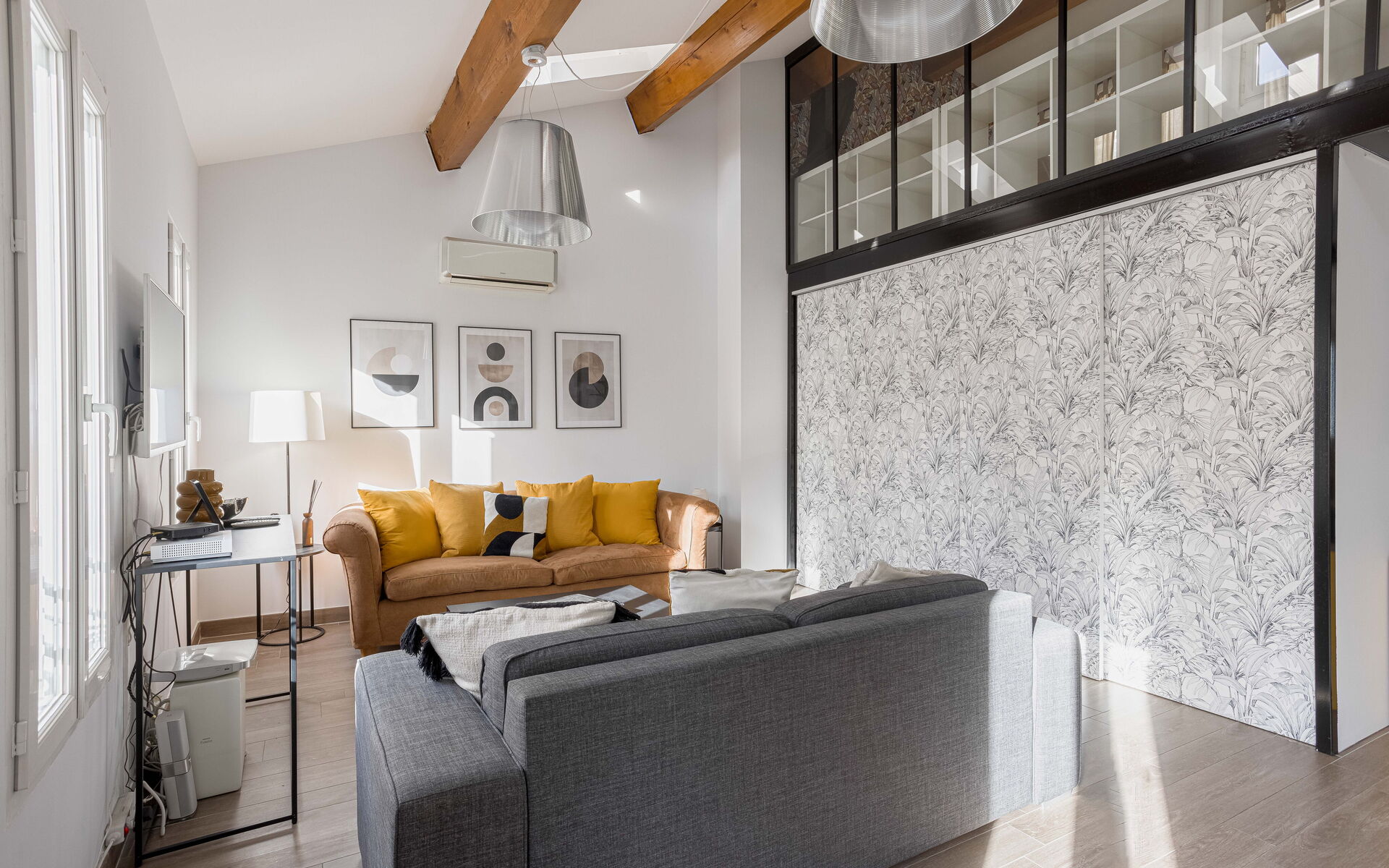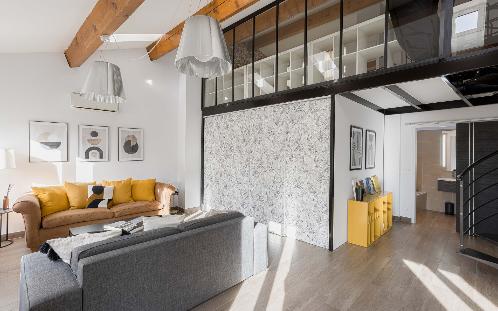 - Salon : spacieux séjour avec une belle hauteur sous plafond + TV écran plat + coin salon avec 2 canapé dont 1 convertible (140*190) + table pour 6