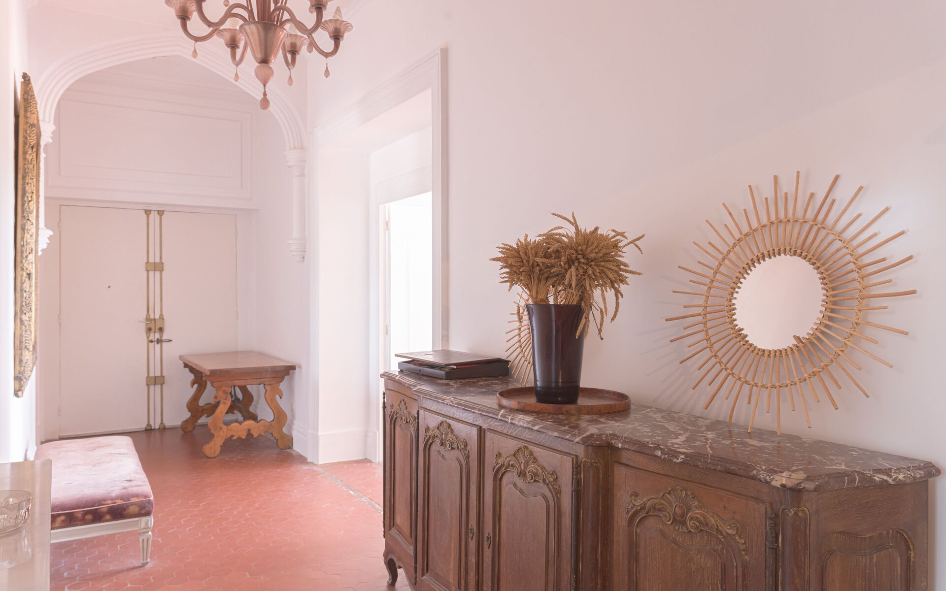 - Séjour avec belle hauteur sous plafond et tomettes au sol + salle à manger