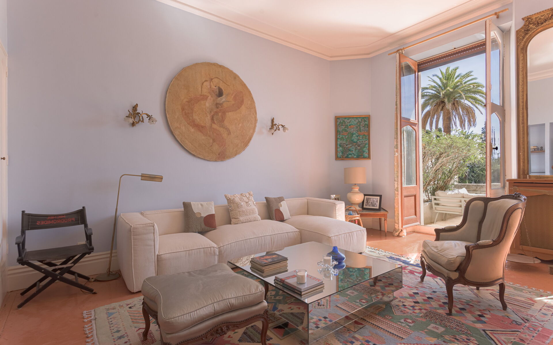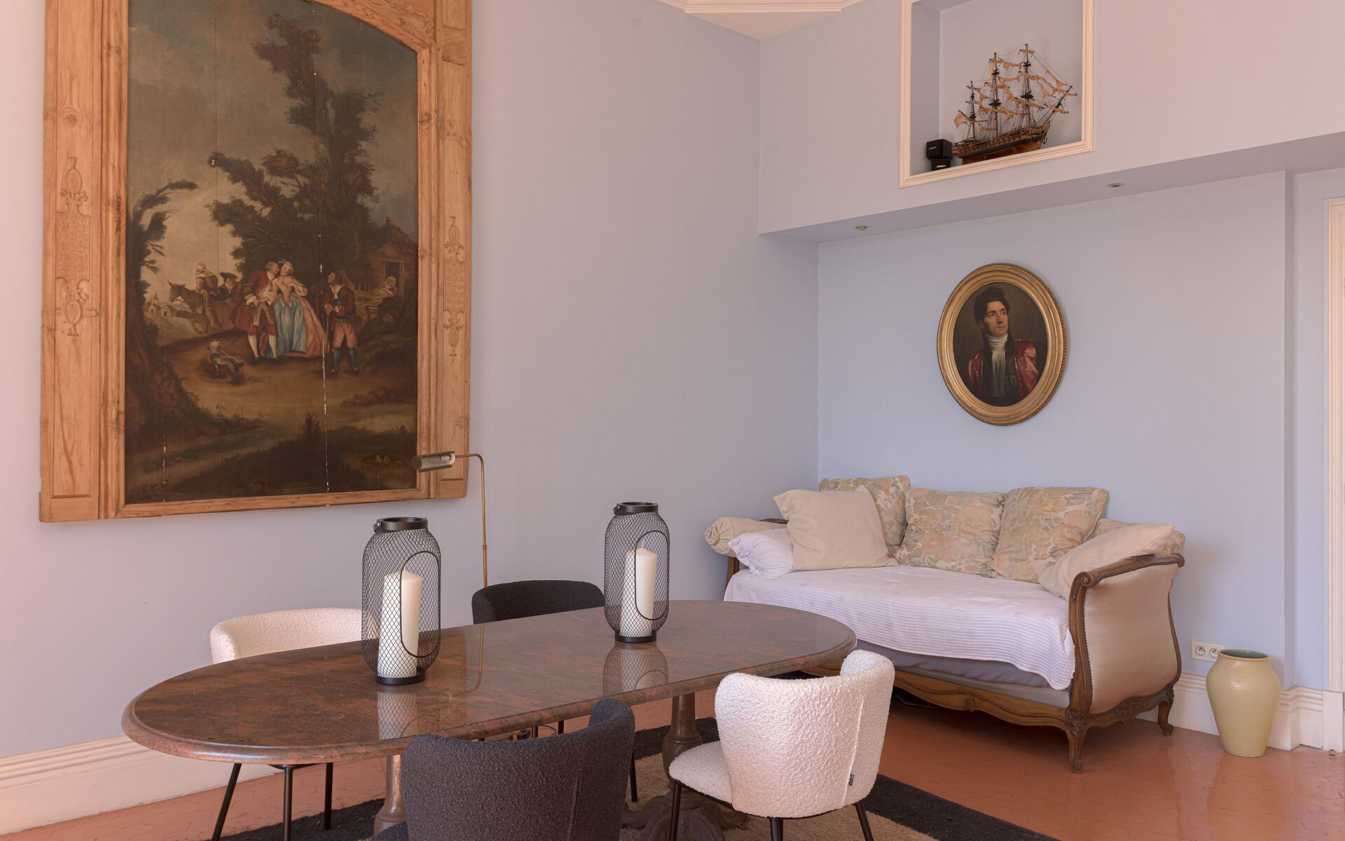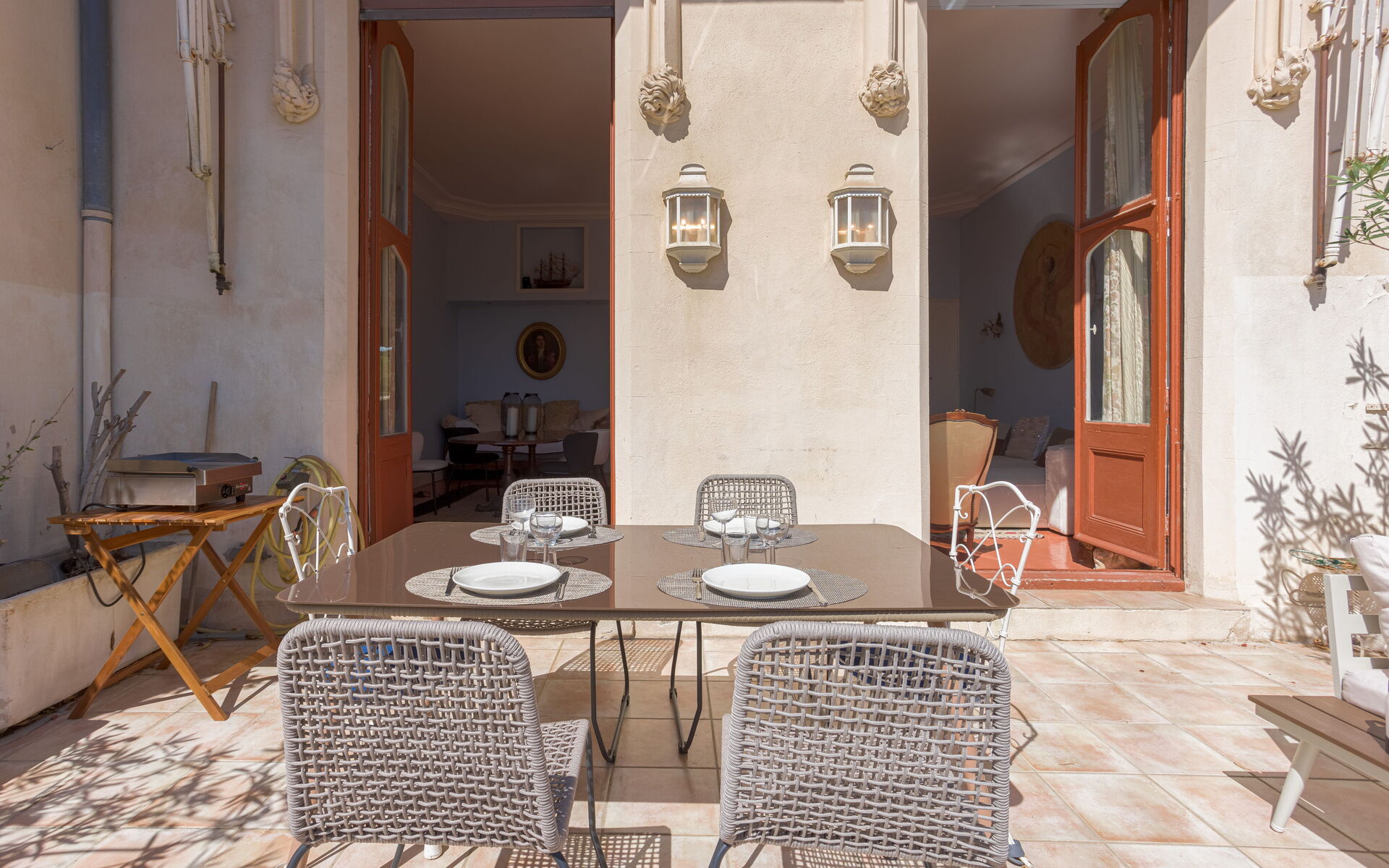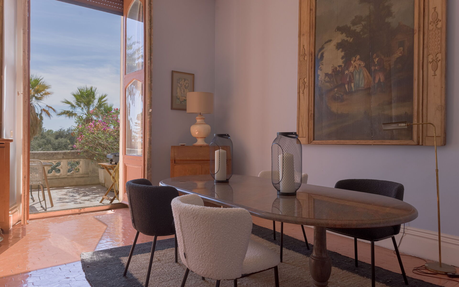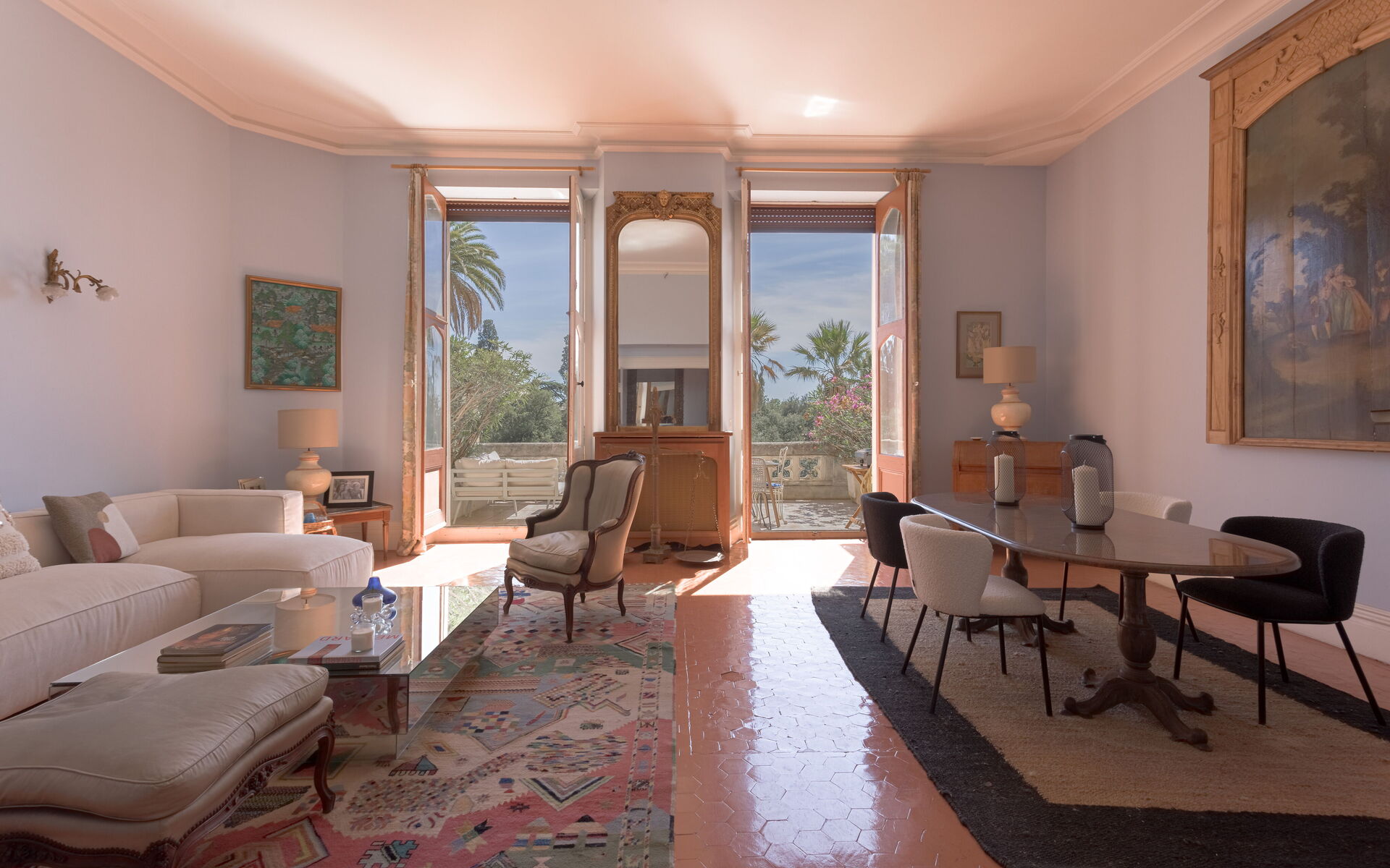 - Large living with high ceiling + dining room with dining room opening onto the terrace