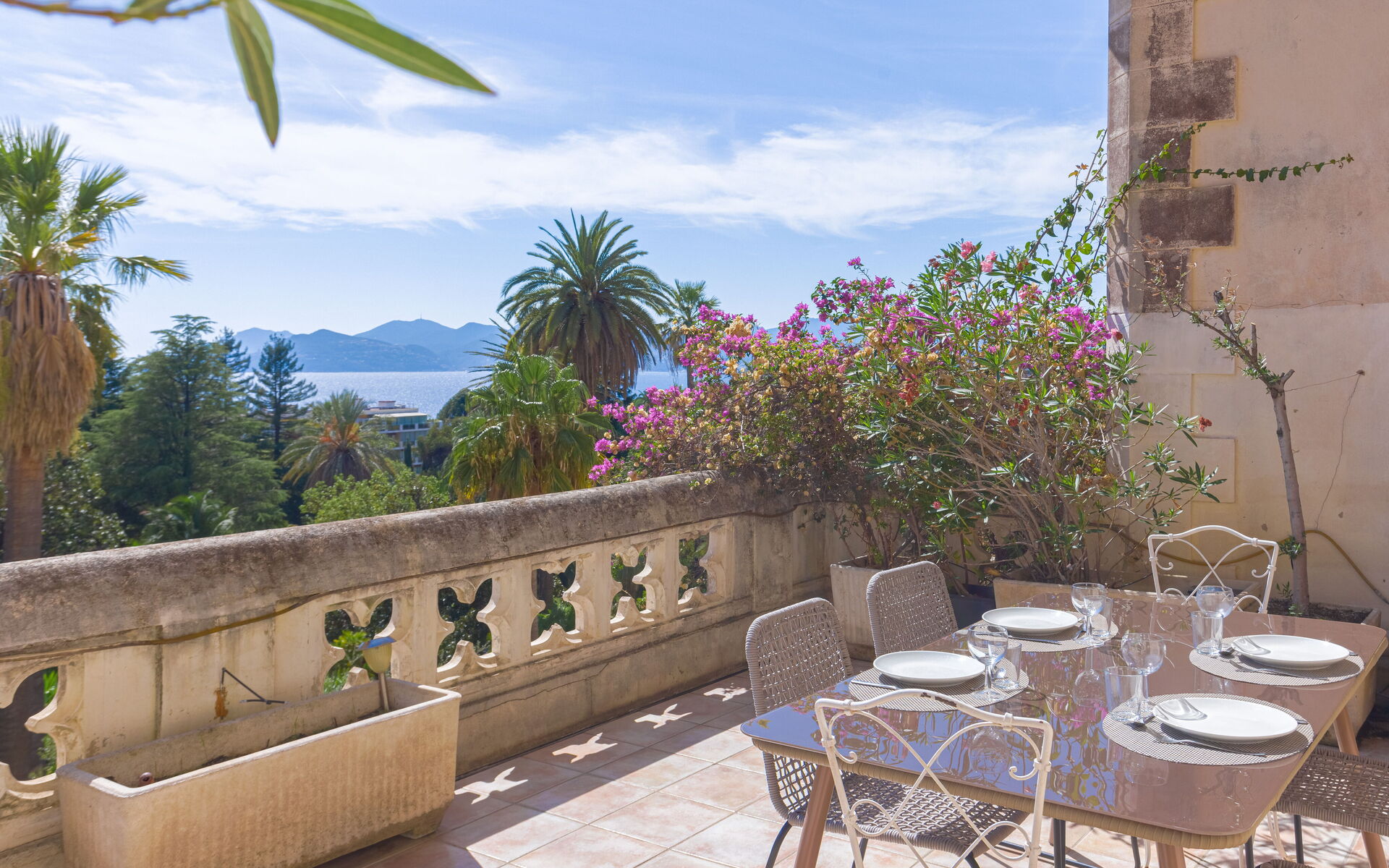 Ce luxueux appartement 5* entièrement est idéalement situé près des plages du midi et du centre de Cannes. Il possède une magnifique terrasse ensoleillée avec vue mer panoramique des Îles de Lérins jusqu'au massif de l'Esterel.