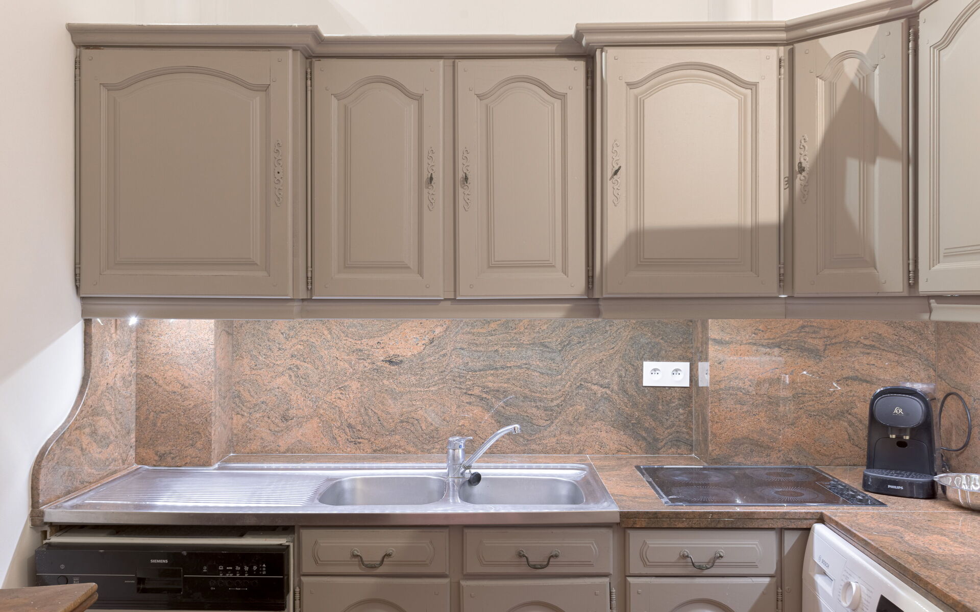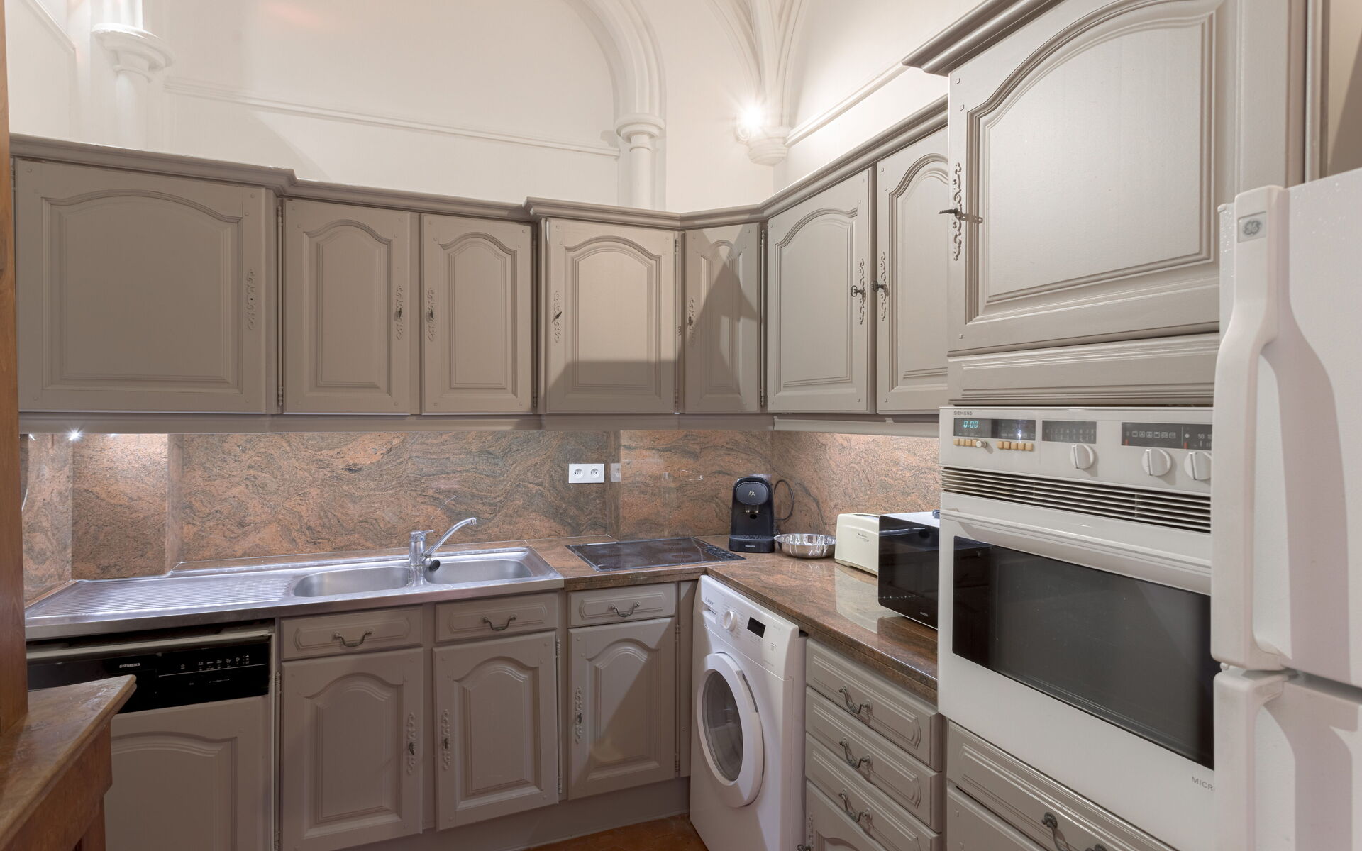 - Kitchen: fridge + kettle + toaster + oven + coffee maker + freezer + microwave + dishwasher