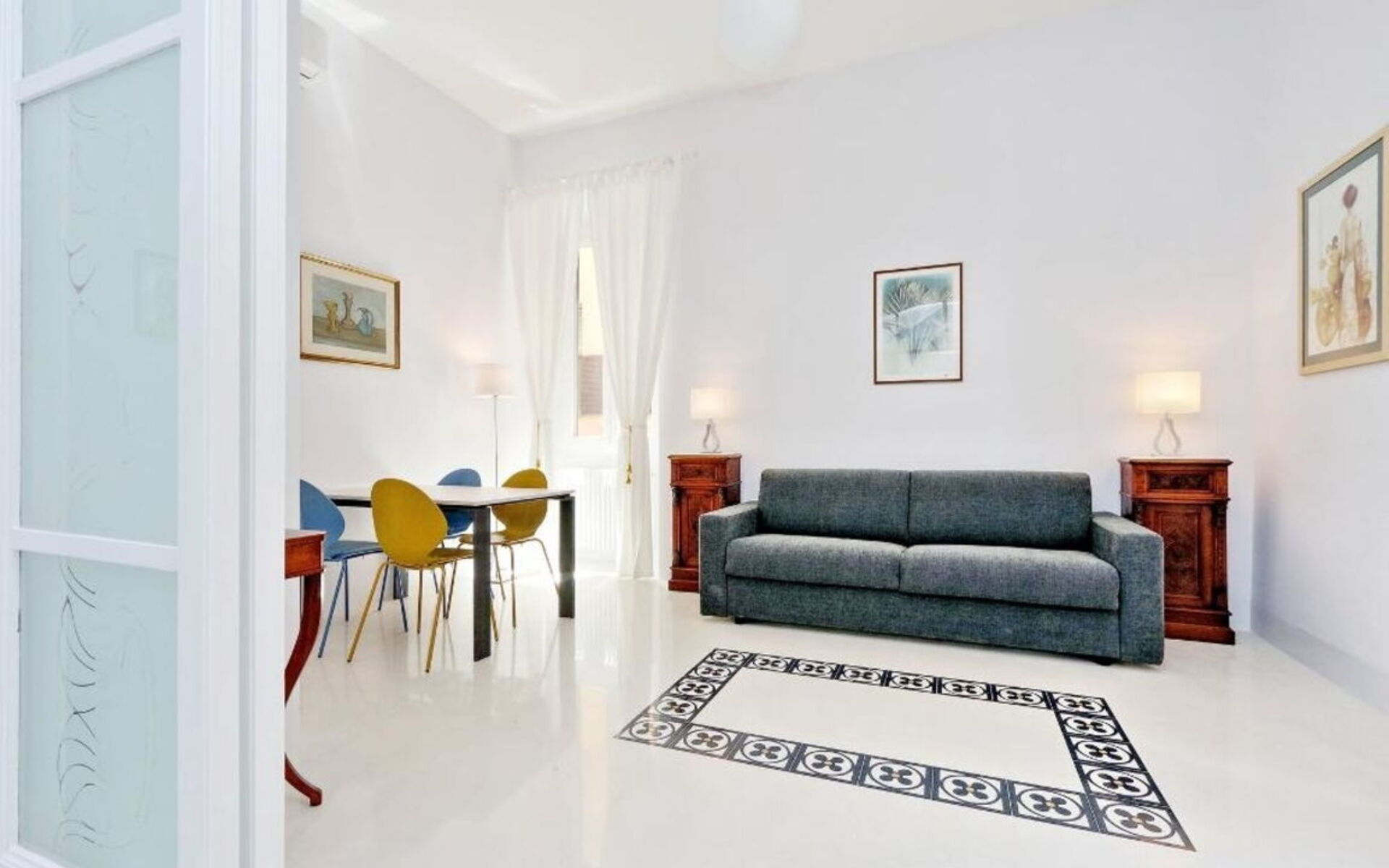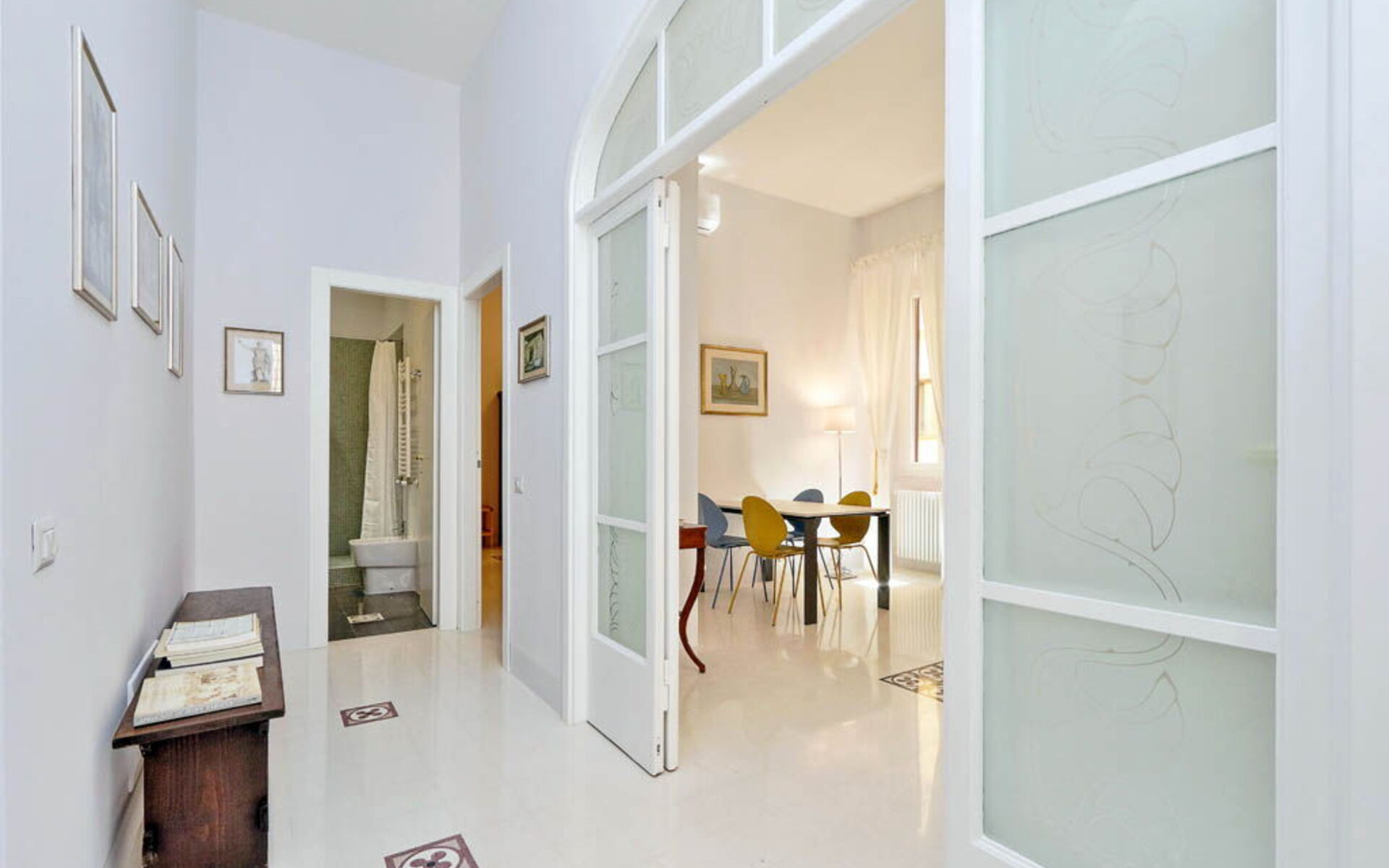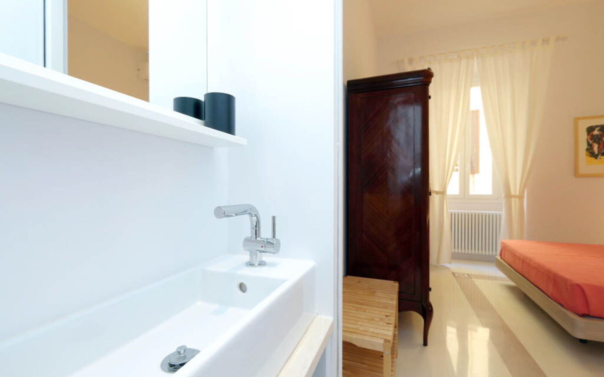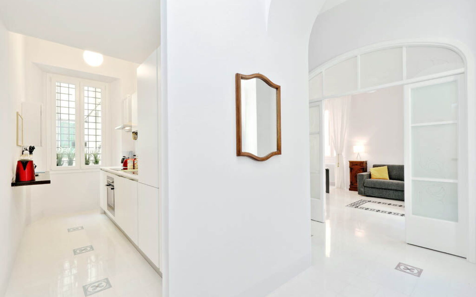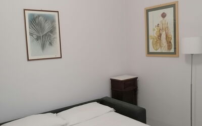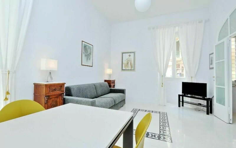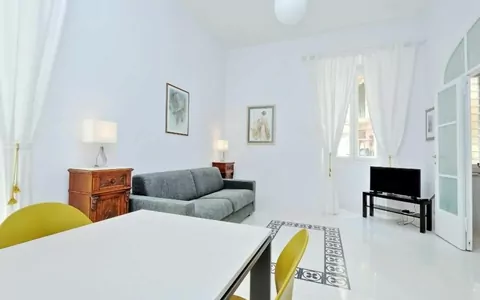 This 55 sqm apartment is located on the second floor and is provided with elevator. It consists of a bedroom, living room, two bathrooms and kitchen. The apartment has enough light and is quiet, since the windows overlook an internal courtyard. The apartment is in the Esquilino, a neighborhood located in the centre of Rome, full of history and art. The most ethnic district of central Rome, it retains the elegant architecture of the Umbertino period dating back to end of the '800, the only surviving example in Rome.