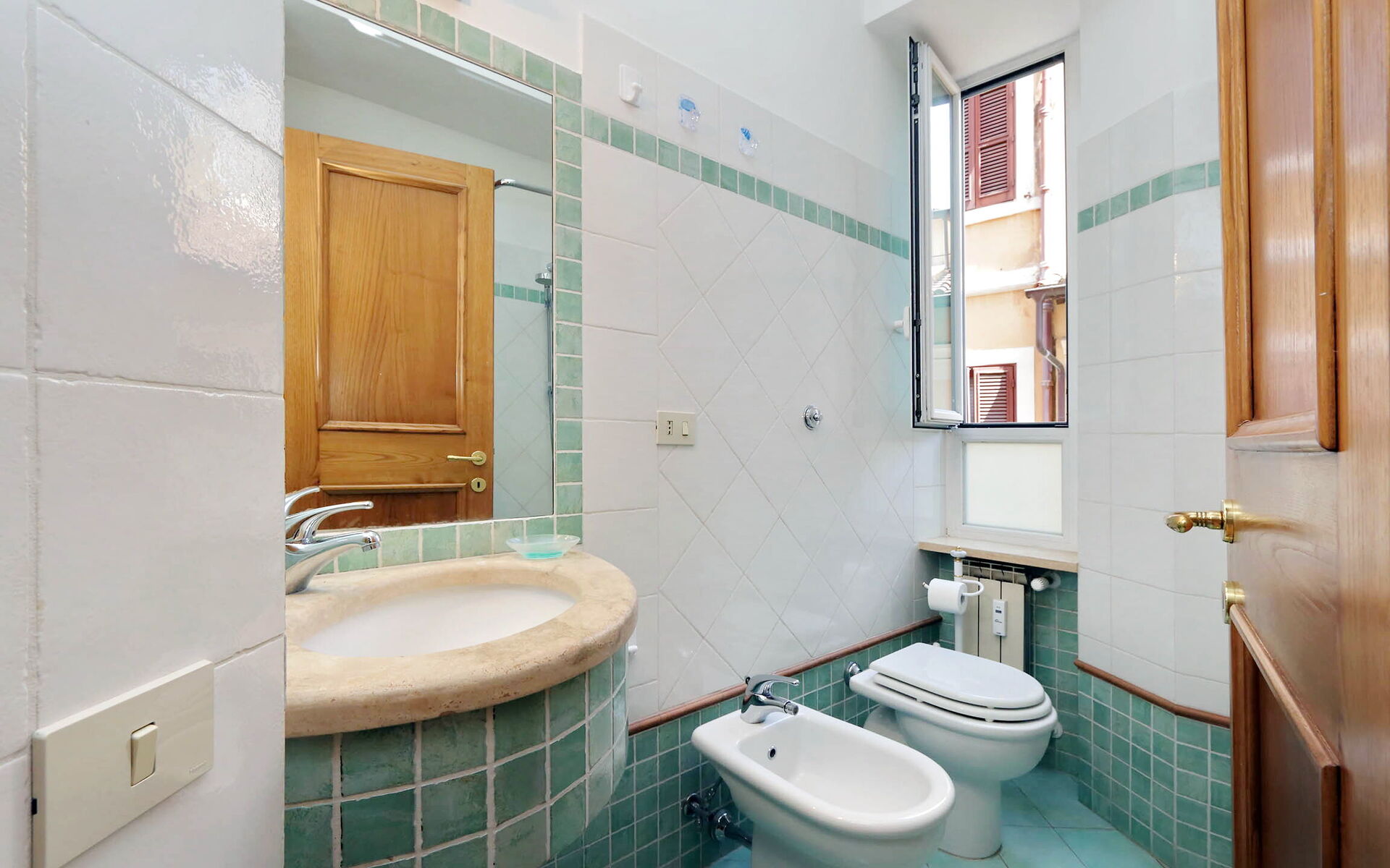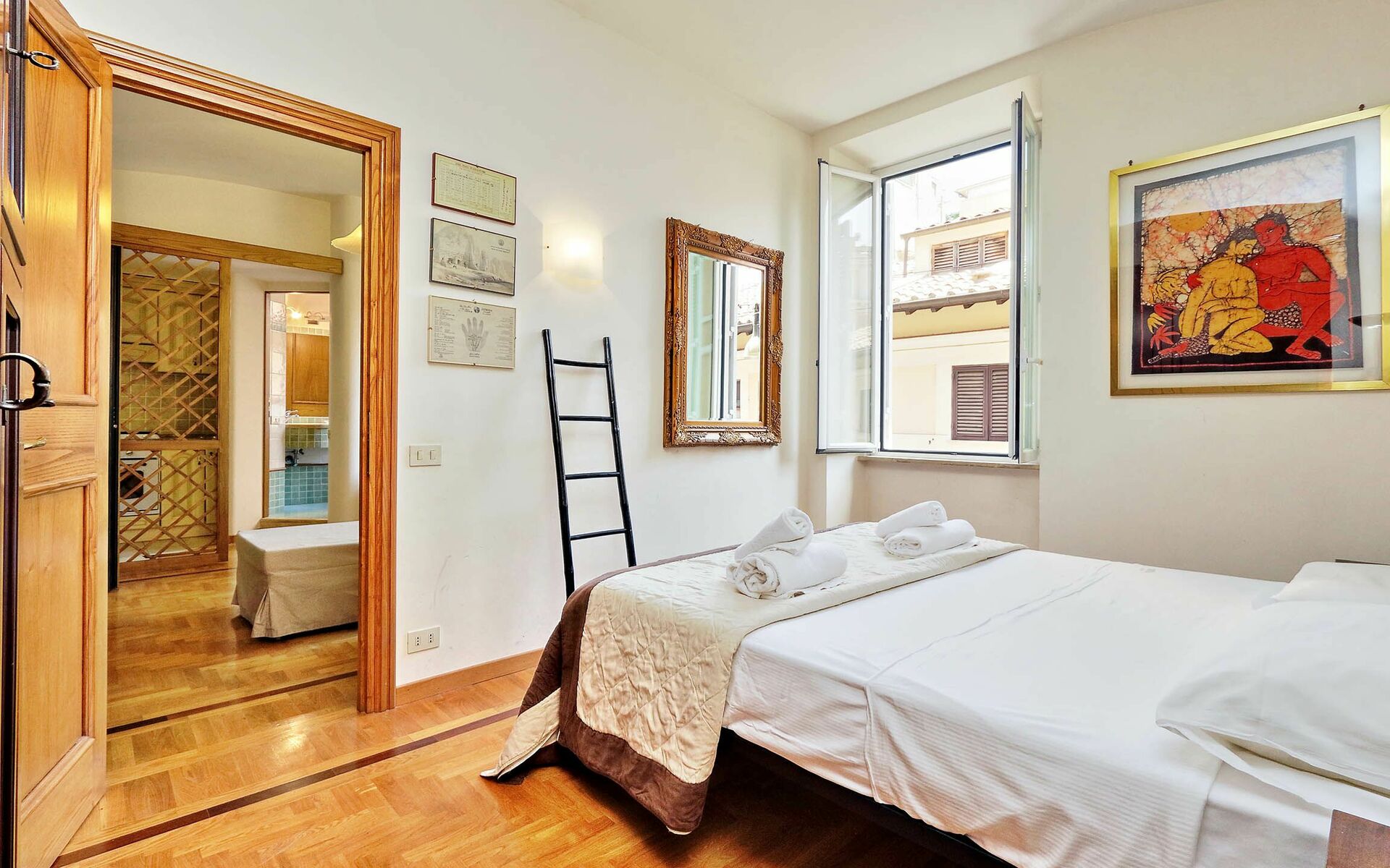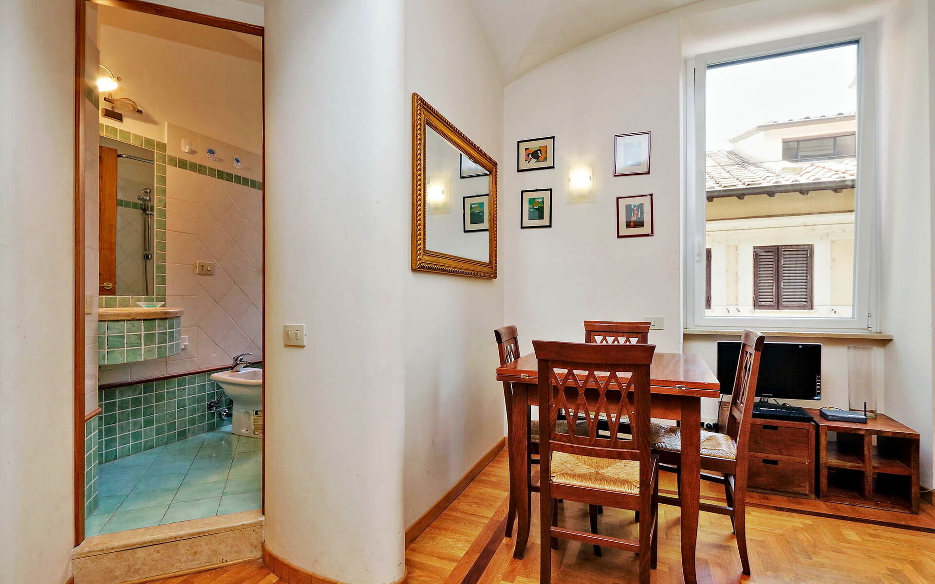 Whilst the entrance to the apartment is in an inner courtyard, the front entrance to this lovely historical building is in a characteristic street of the olden Rome, offering plenty of restaurants, cafés and boutiques.