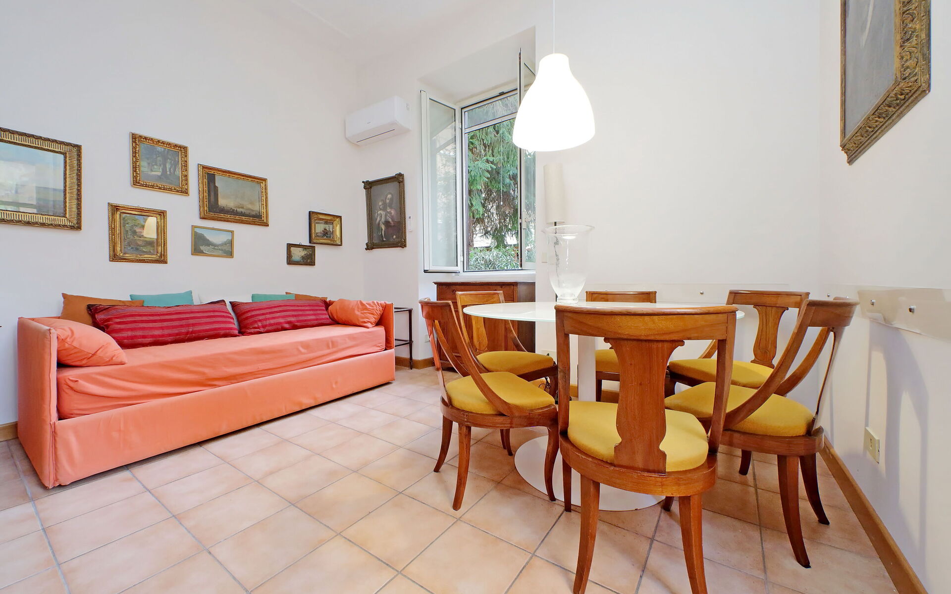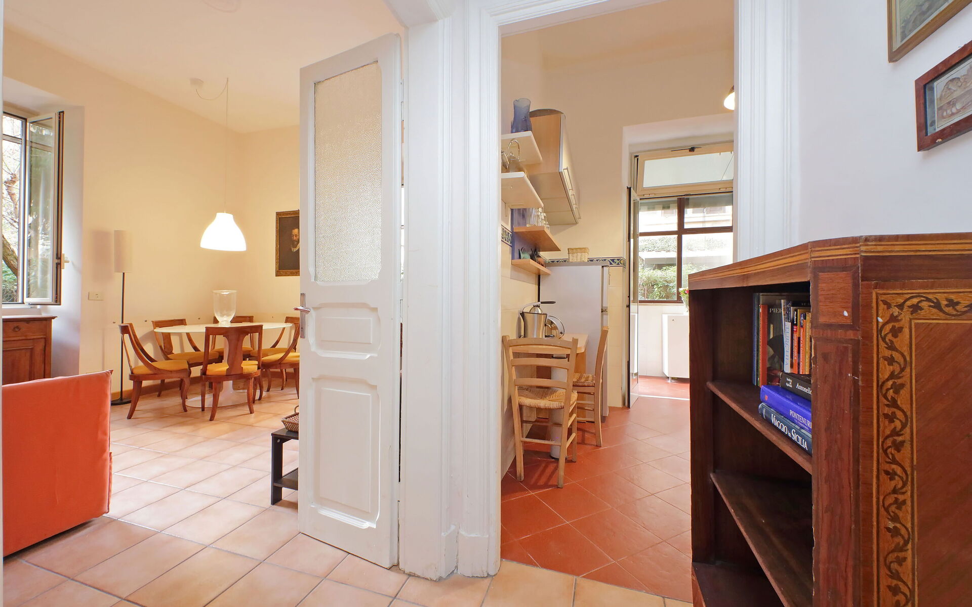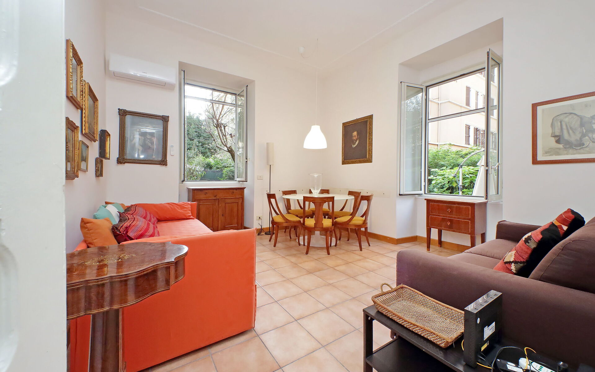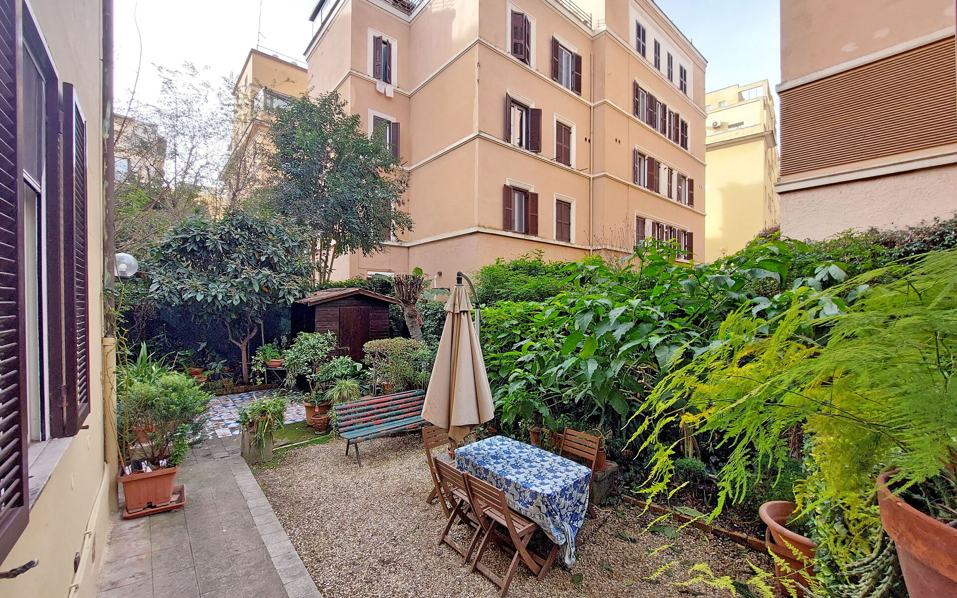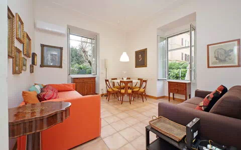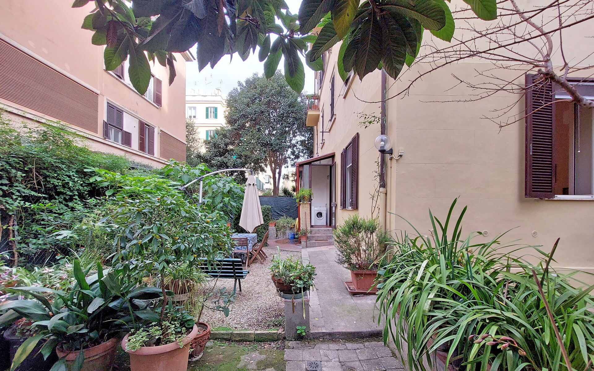 Two-room apartment of about 60sqm with private garden located on the ground floor in a period building in the Delle Vittorie neighbourhood. The underground station Ottaviano (1.5km) is a 20-minute walk away. The Vatican City and the Prati neighbourhood is only a 40-minute walk or 30 minutes by public transport.