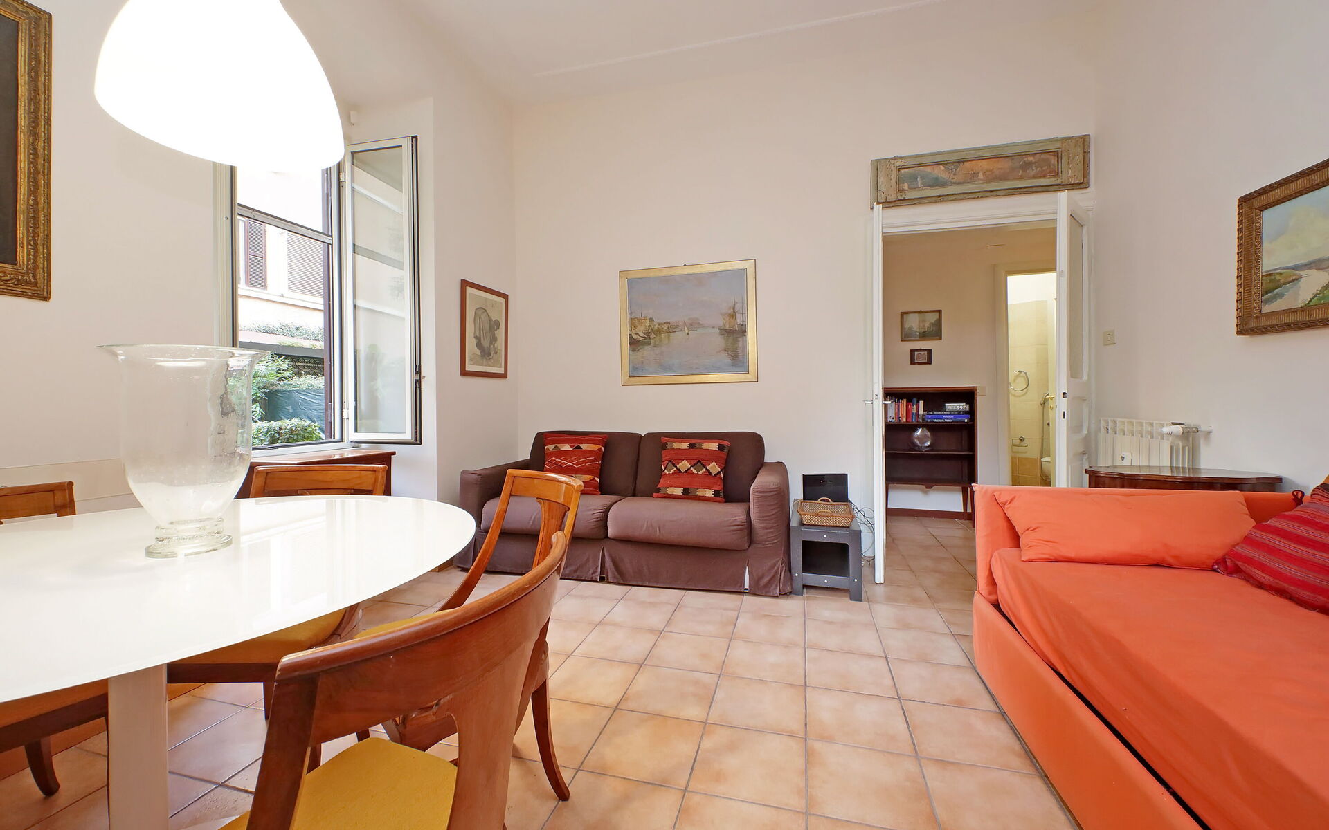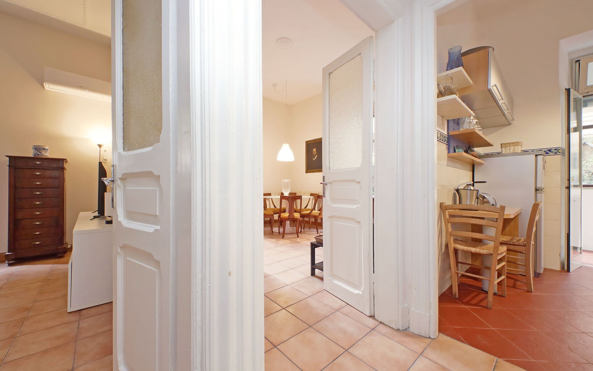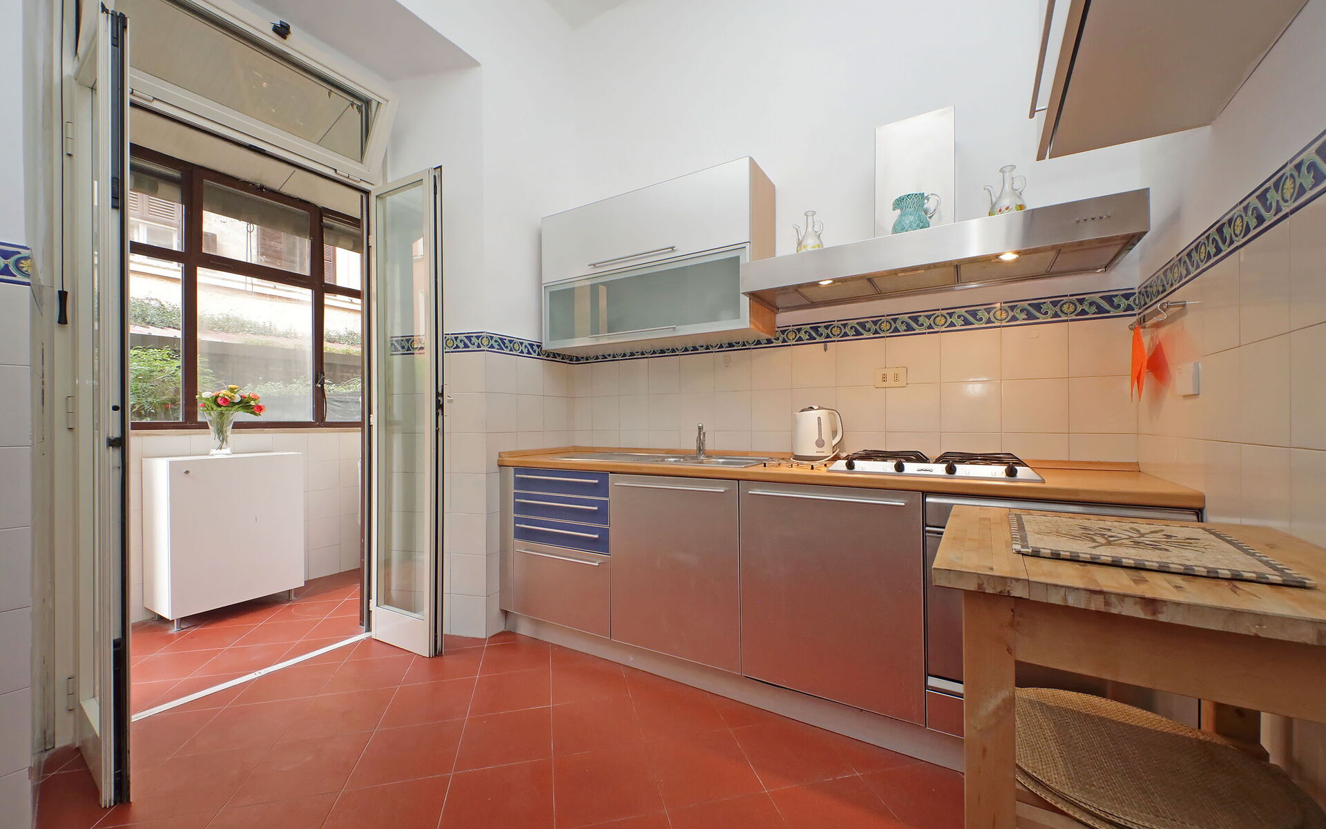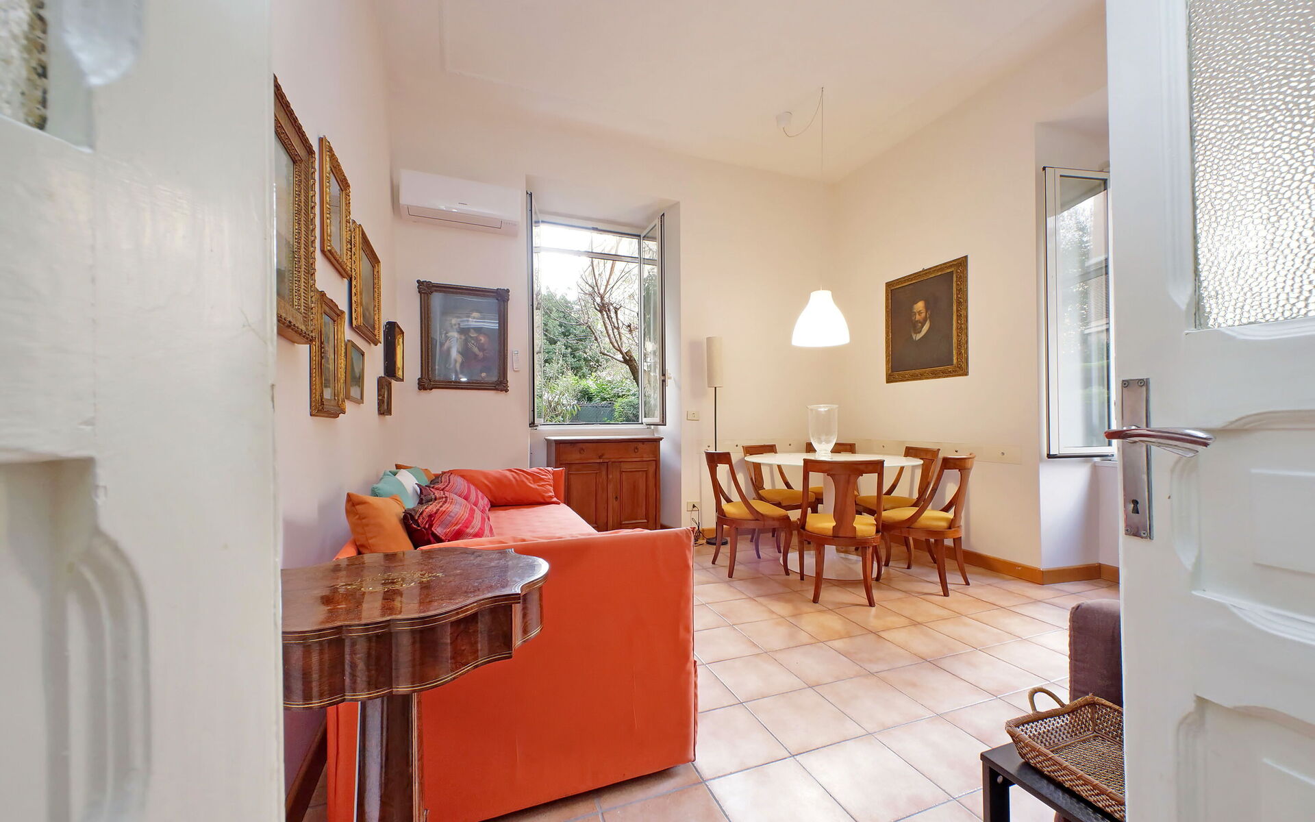Two-room apartment of about 60sqm with private garden located on the ground floor in a period building in the Delle Vittorie neighbourhood. The underground station Ottaviano (1.5km) is a 20-minute walk away. The Vatican City and the Prati neighbourhood is only a 40-minute walk or 30 minutes by public transport.