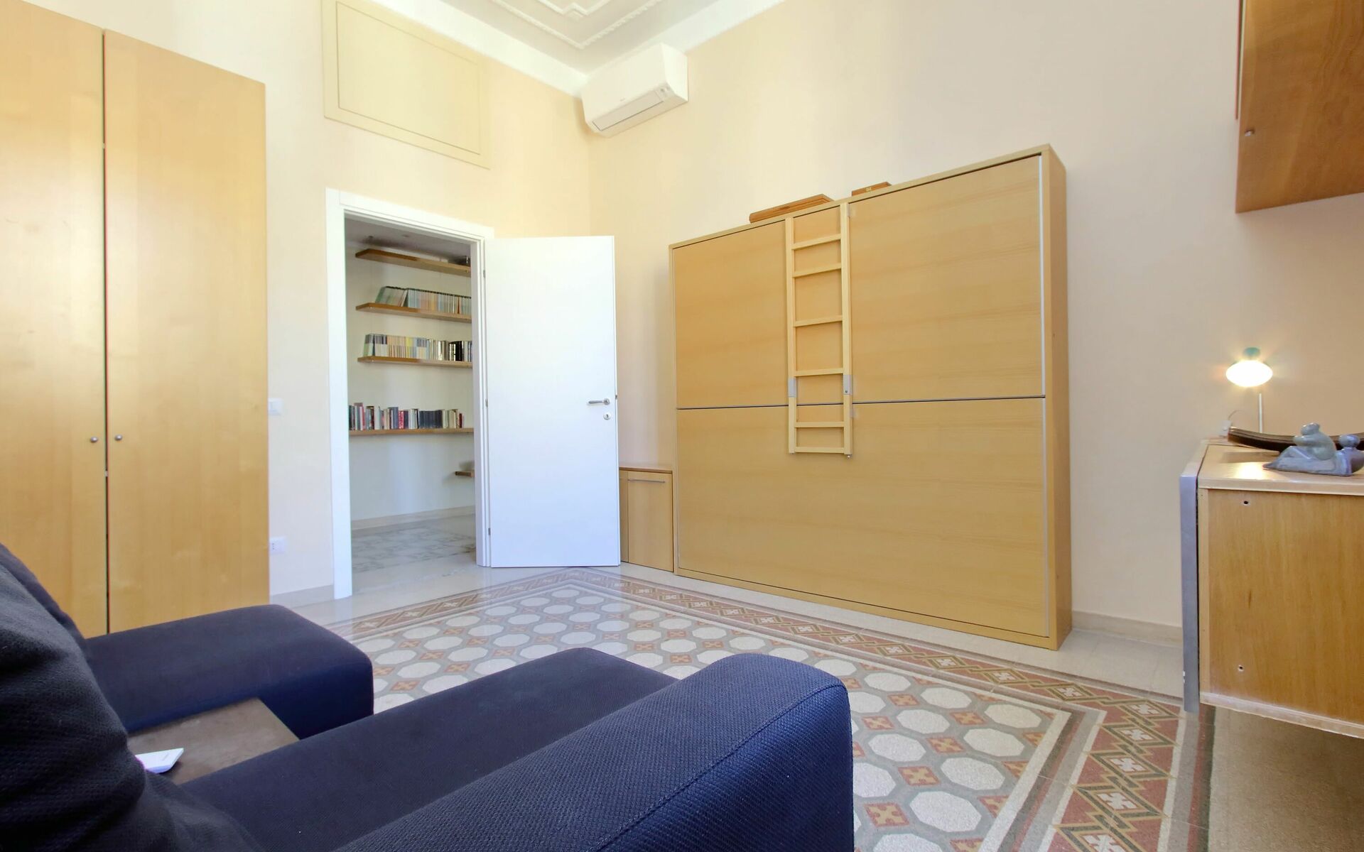 The second bedroom has 2 pull out single bunk beds, a wardrobe, a sofa and a bookshelf.