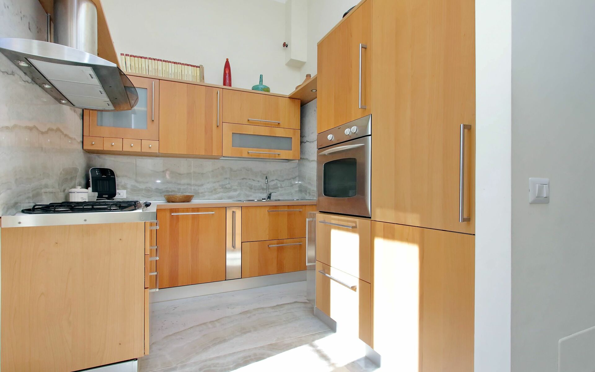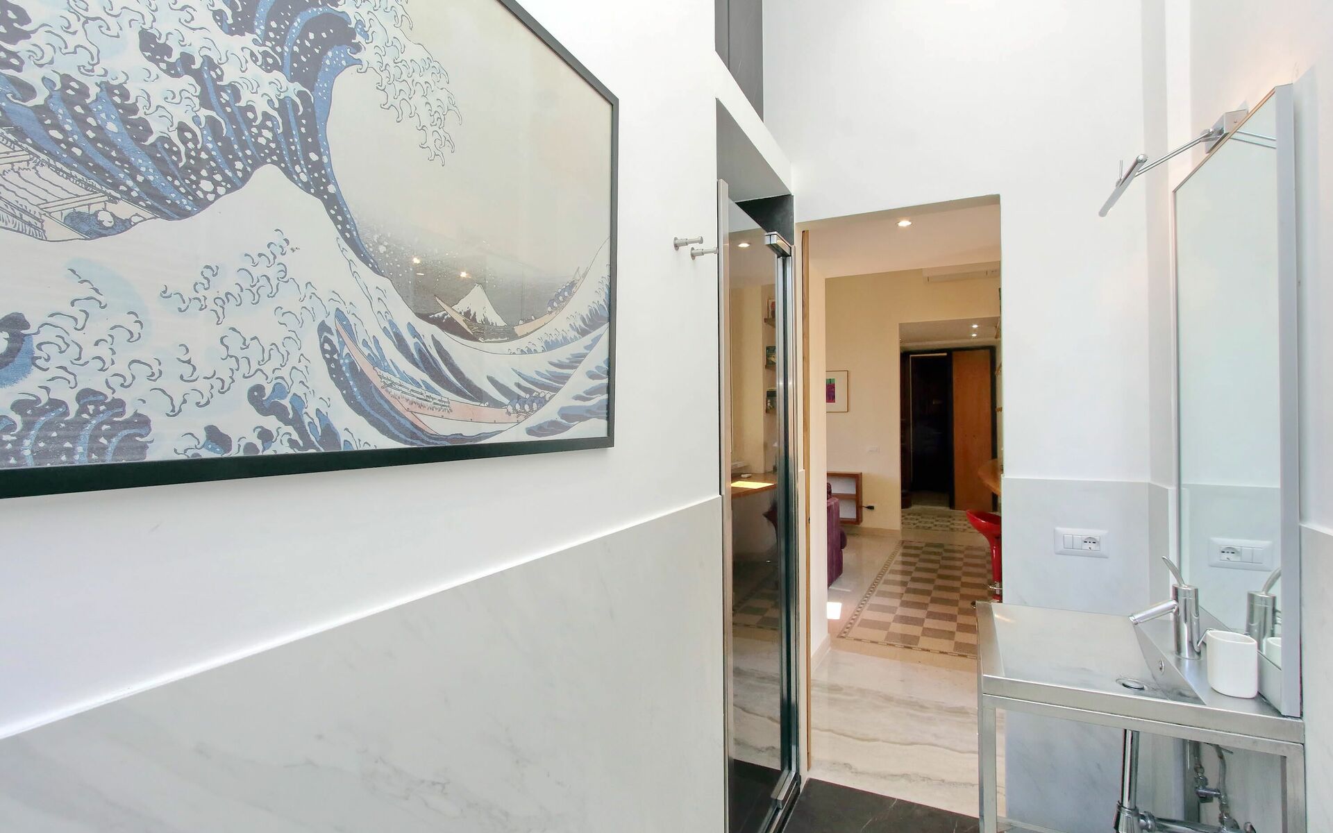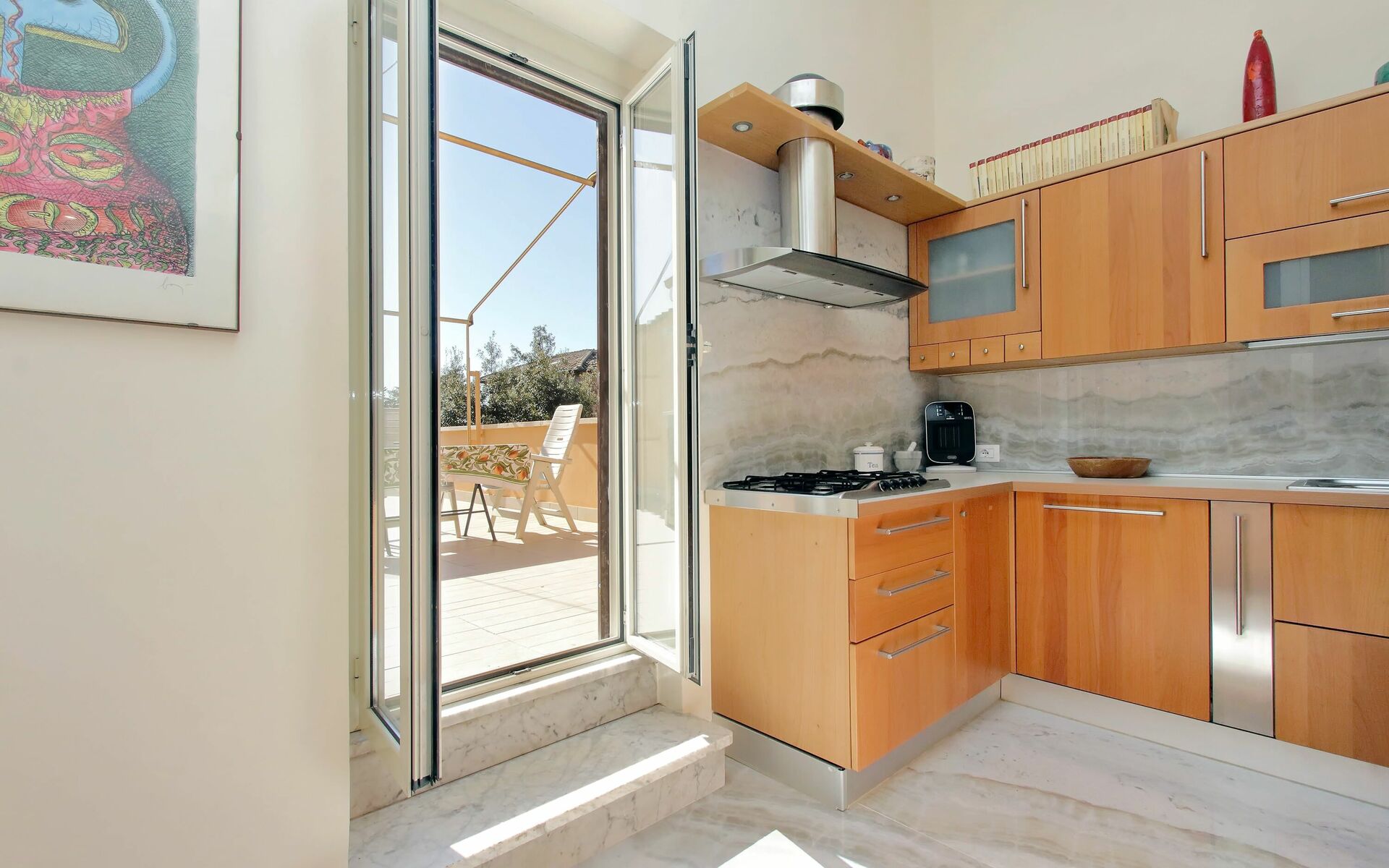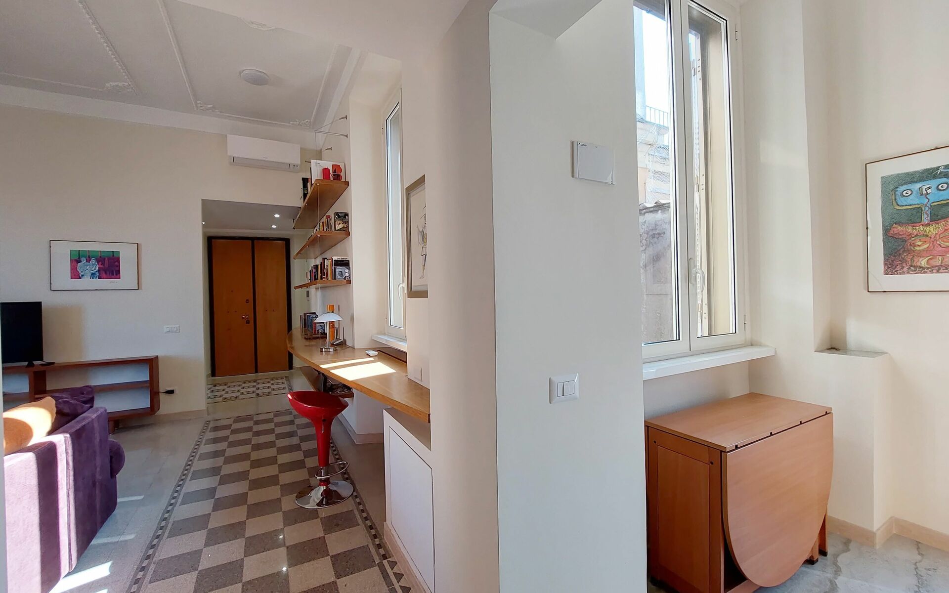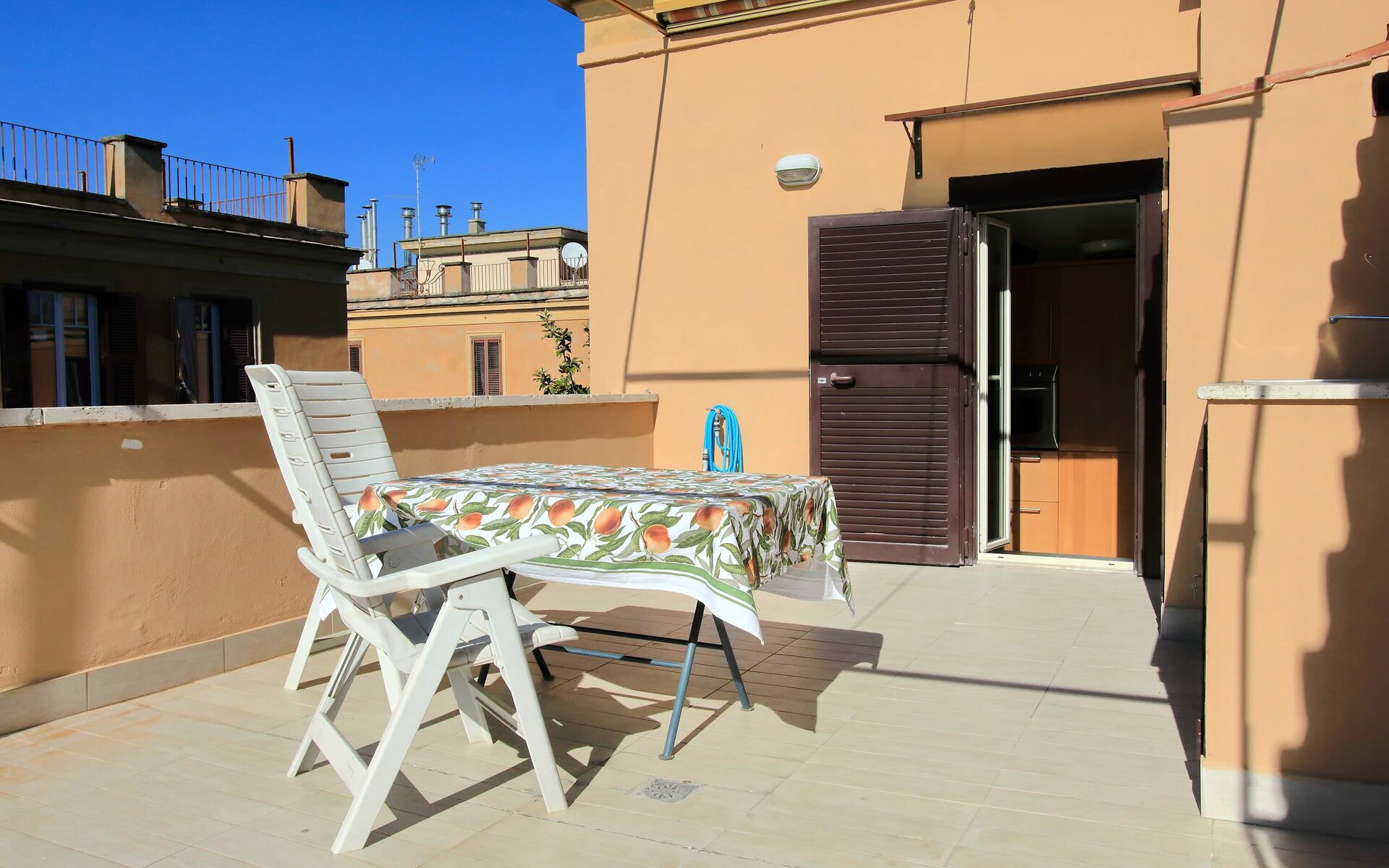Newly renovated 110 sqm apartment with a terrace in a twentieth century, Baroque style building in a wonderful condominium in the Pinciano (Parioli) neighbourhood. The condominium is located 3.5 km north east of the historic centre of Rome and only a 12 minute walk from Villa Borghese. The condominium has a large garden and there is a 5 minute walk and stairs(30) to do from the entrance to the building to the apartment.