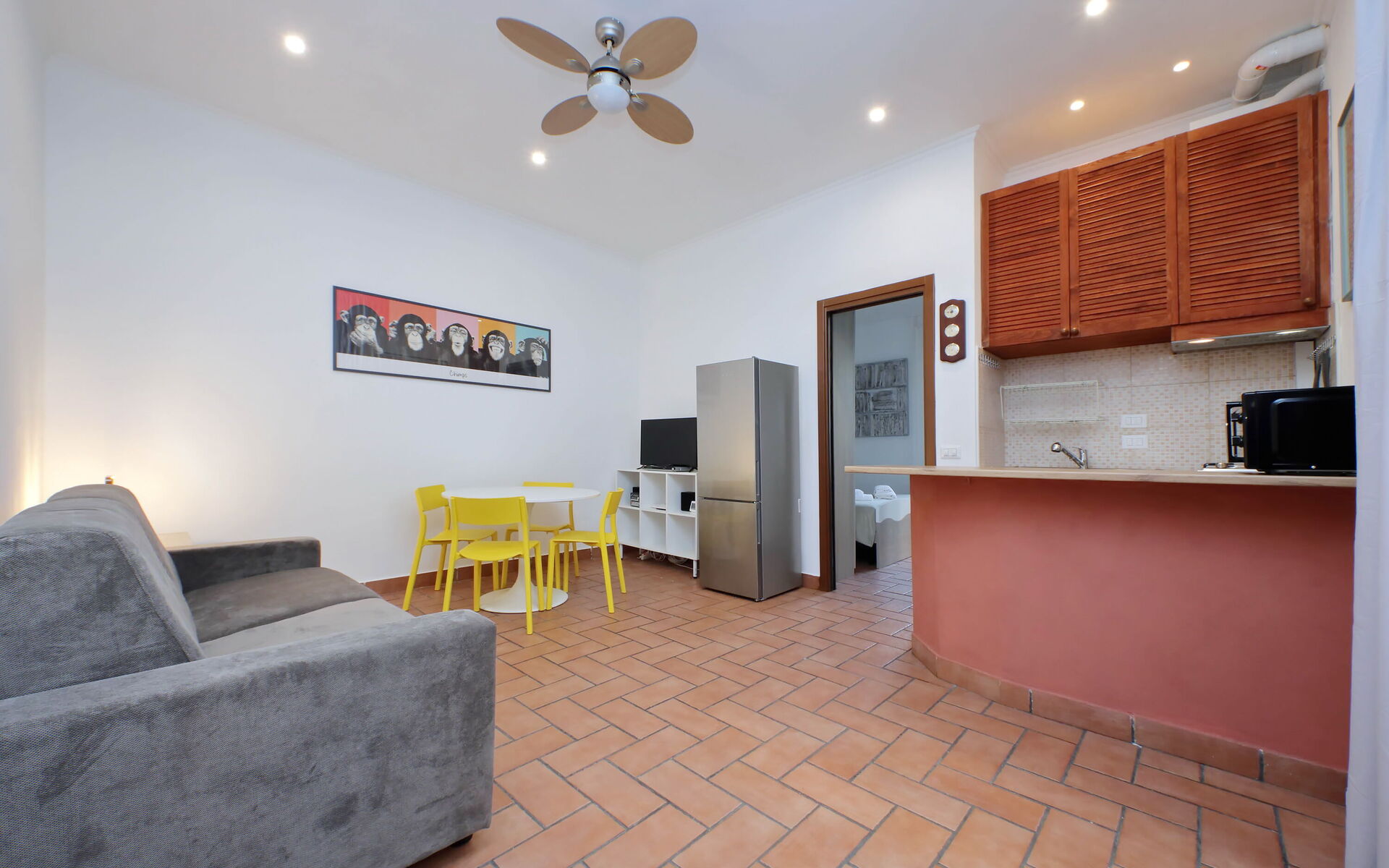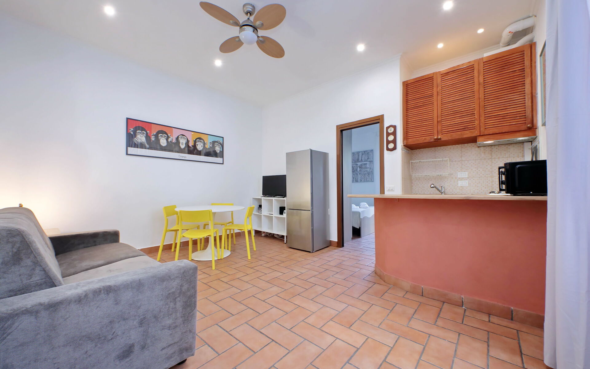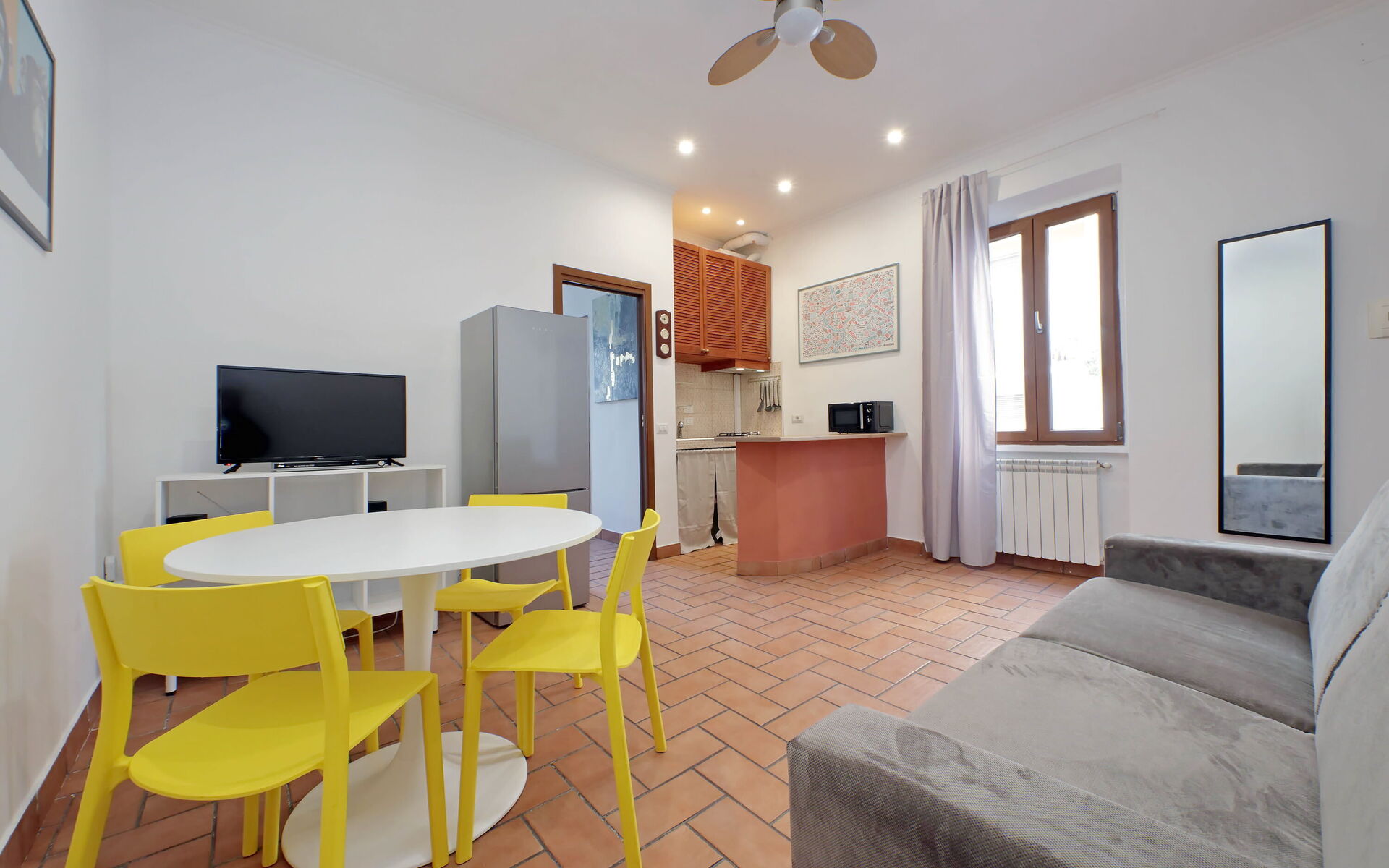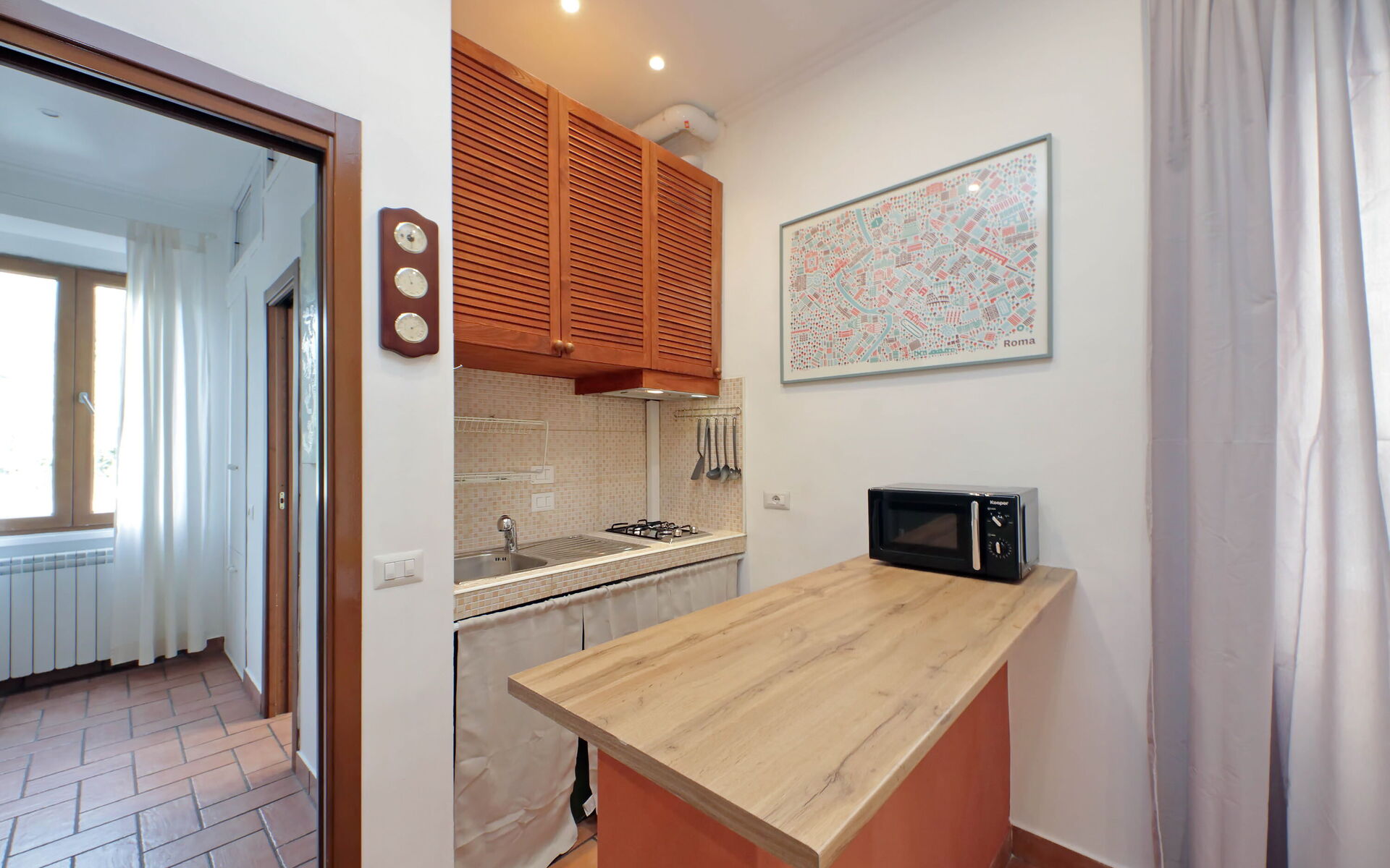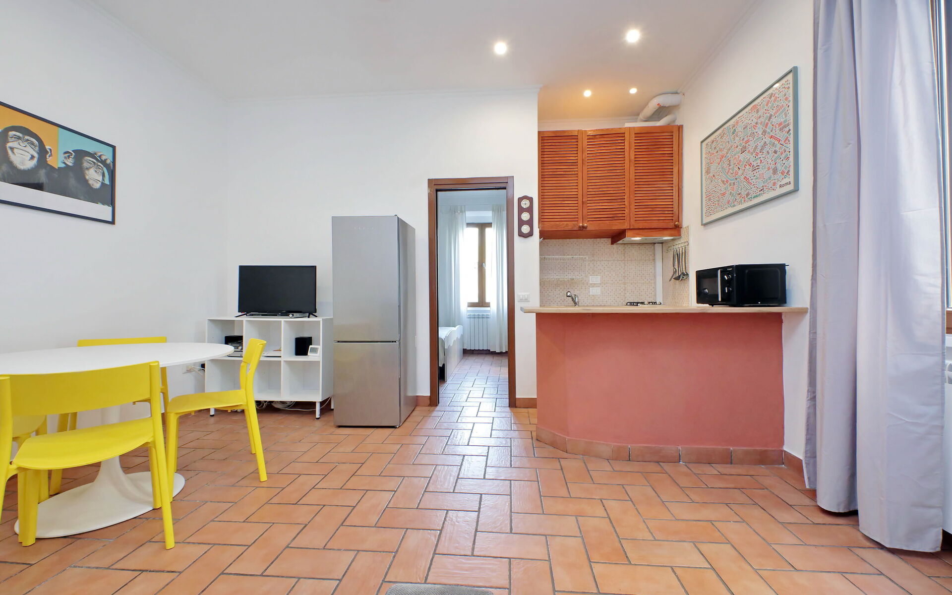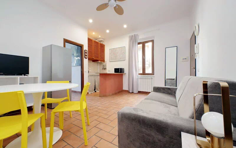 A minimal and comfortable apartment of approximately 45sqm ideal for business, study and holiday stays in Via Homs in the Trieste/Africano neighbourhood, one that seems like a village despite being among the smallest neighbourhoods in Rome. This street dates back to 1922 and was dedicated to the city of Homs in Libya and is just a few steps away from the famous Devil's Chair which in medieval times was believed to be a demonic place and the throne of Satan. The underground line B, Viale Libia station is a 10-minute walk away. The apartment is located on the first floor (no lift/18 steps) and consists of a living room with kitchenette and a bedroom with ensuite bathroom.