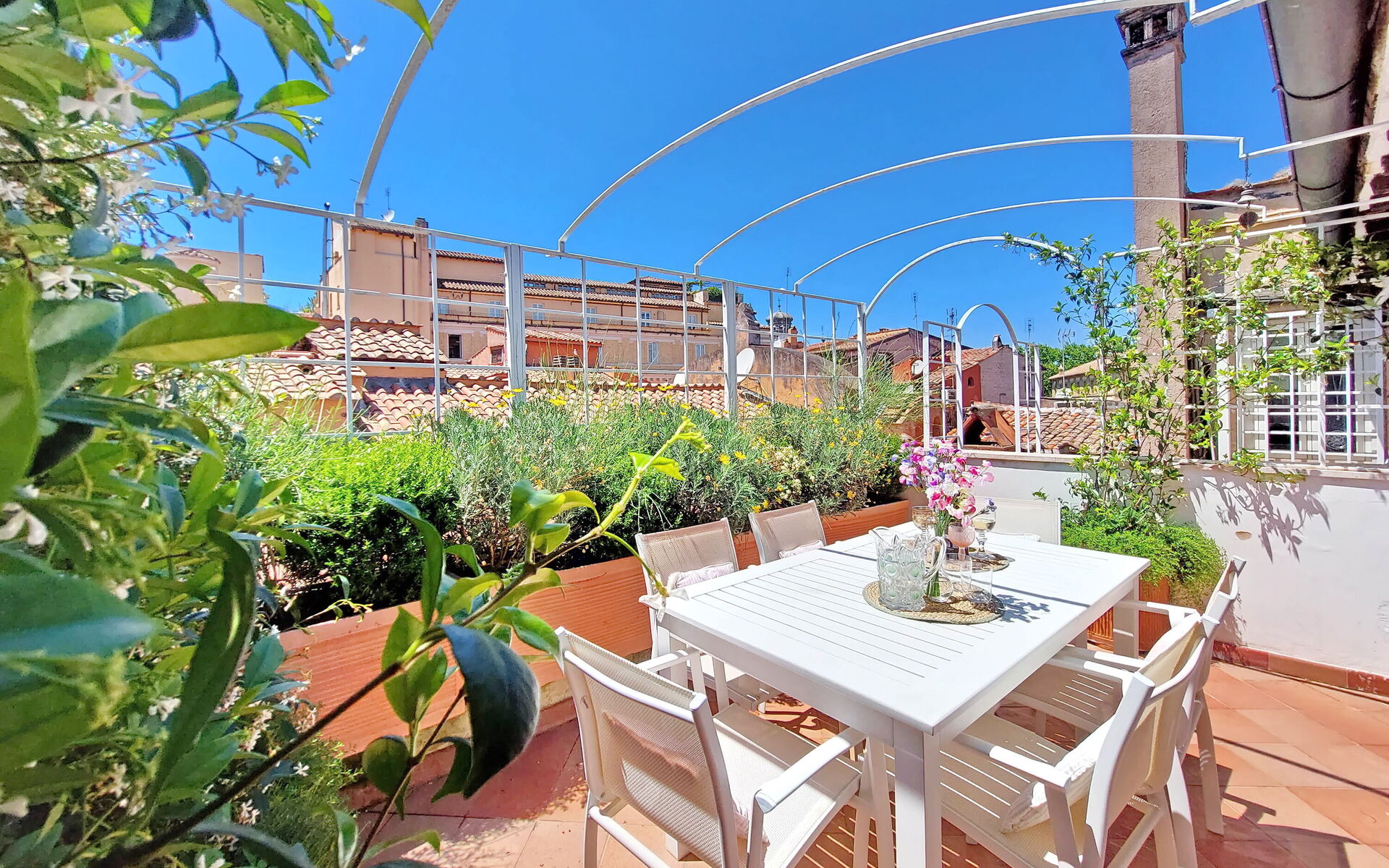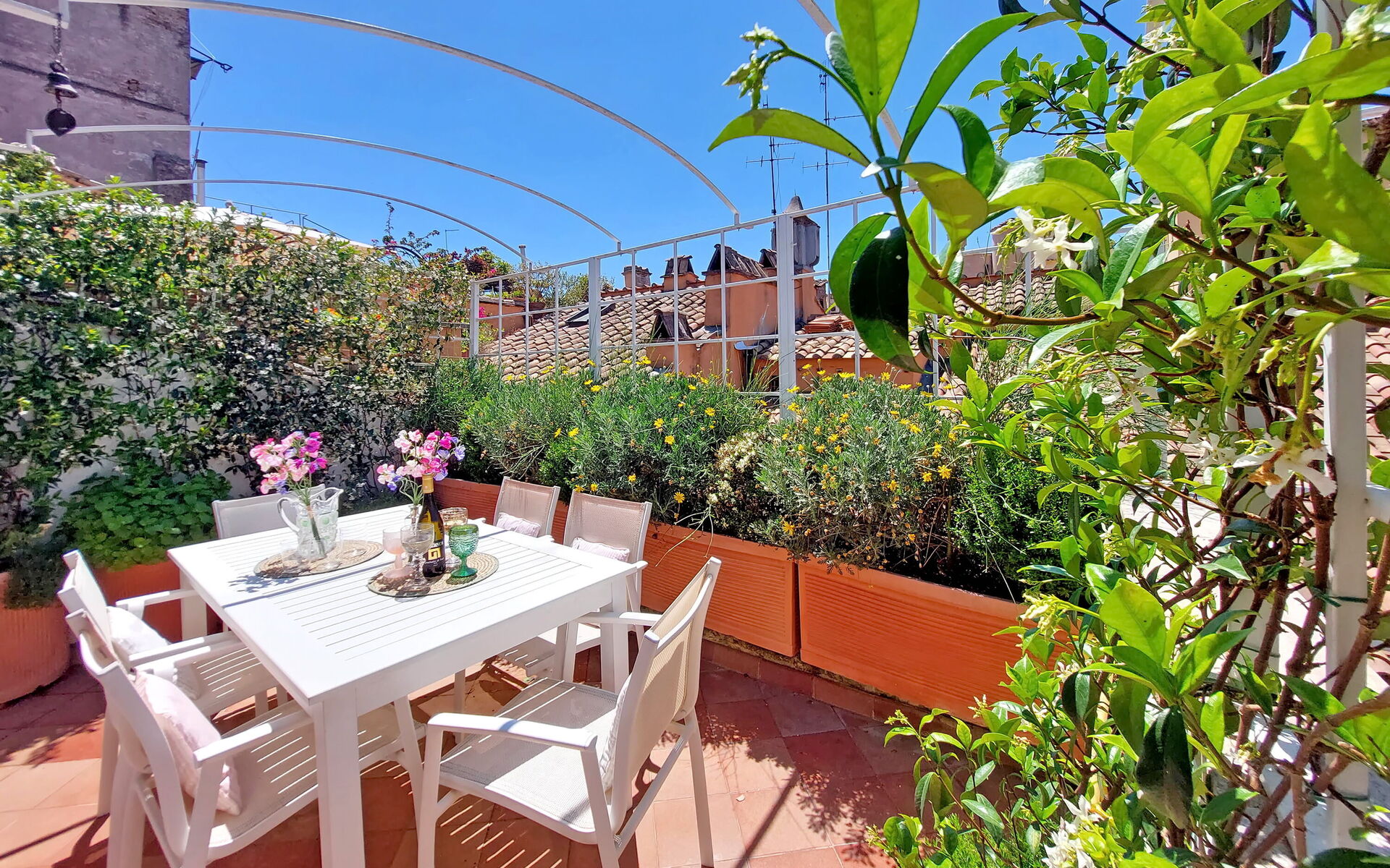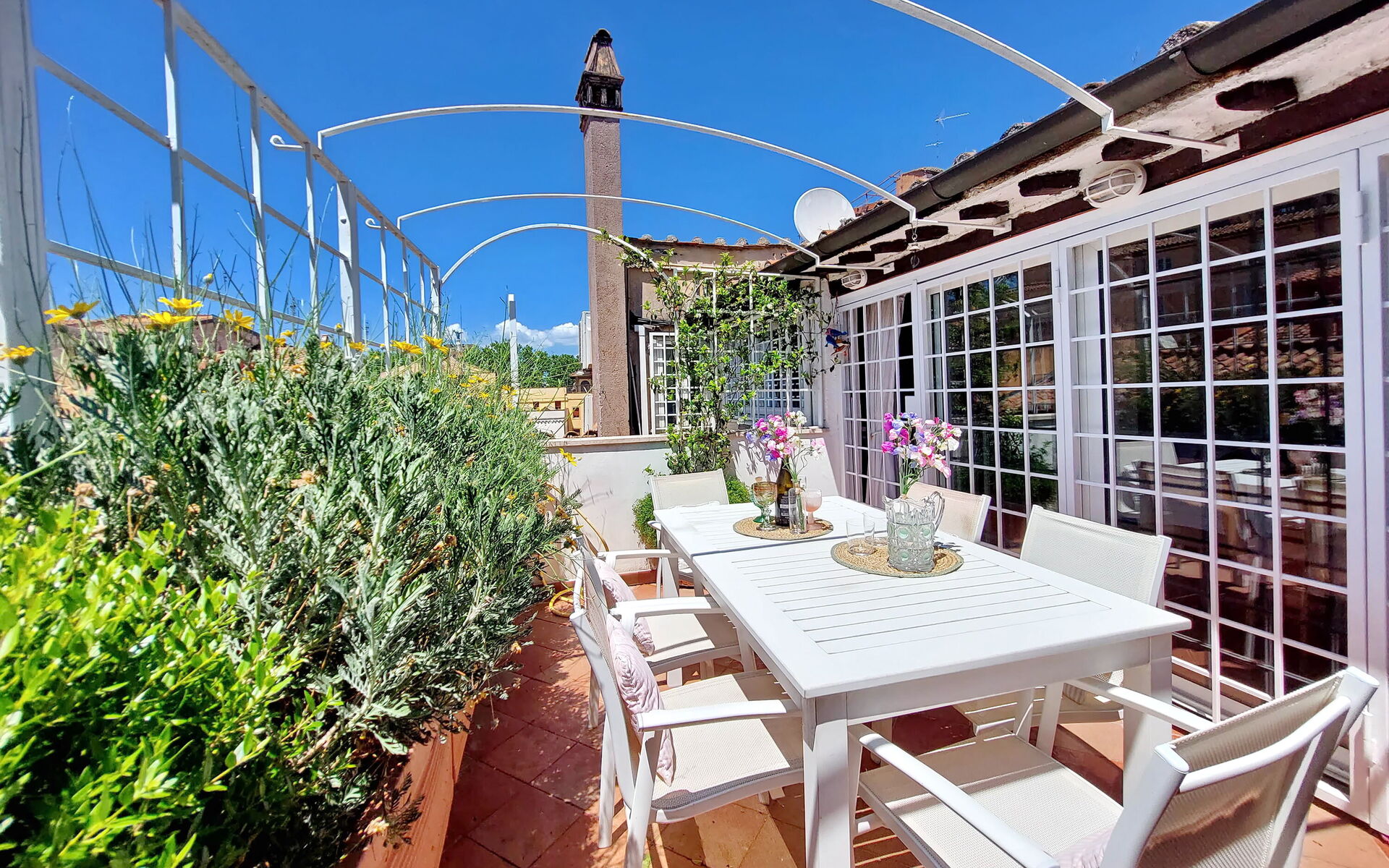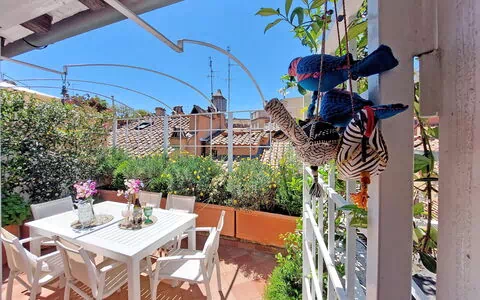 Wonderful large duplex with a terrace located on the third and fourth floor with an elevator in the heart of the historic center of Rome. Spacious, cozy, and comfortable, ideal for a medium-long or short stay, for work or to fully experience the capital's tourism and where to enjoy a glass of wine while admiring the ups and downs of Rome's rooftops. A house with a personality dedicated to art and culture. The apartment has two bedrooms and two bathrooms, one en-suite on the first floor, a kitchen, a living room, and a sunny and beautiful terrace on the second floor. The city's major tourist attractions are within walking distance or by public transportation. You can visit Piazza Navona, Campo dei Fiori, and Castel Sant'Angelo in a few minutes. The Vatican City and Largo di Torre Argentina are only a 15-minute walk away.