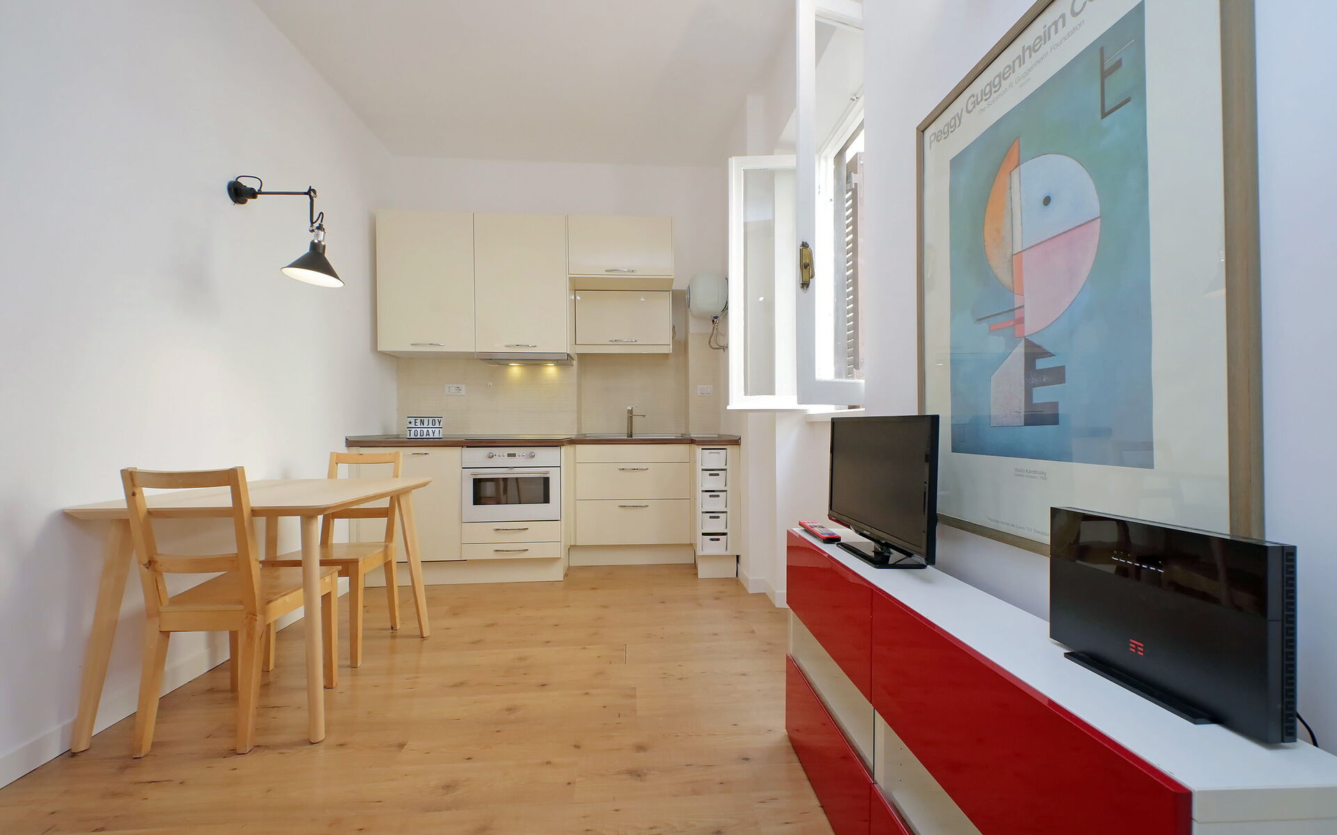 This apartment is located on the first floor with no elevator(22 steps) , it opens onto the living area with the kitchenette, to the right there is the bedroom with the ensuite bathroom.