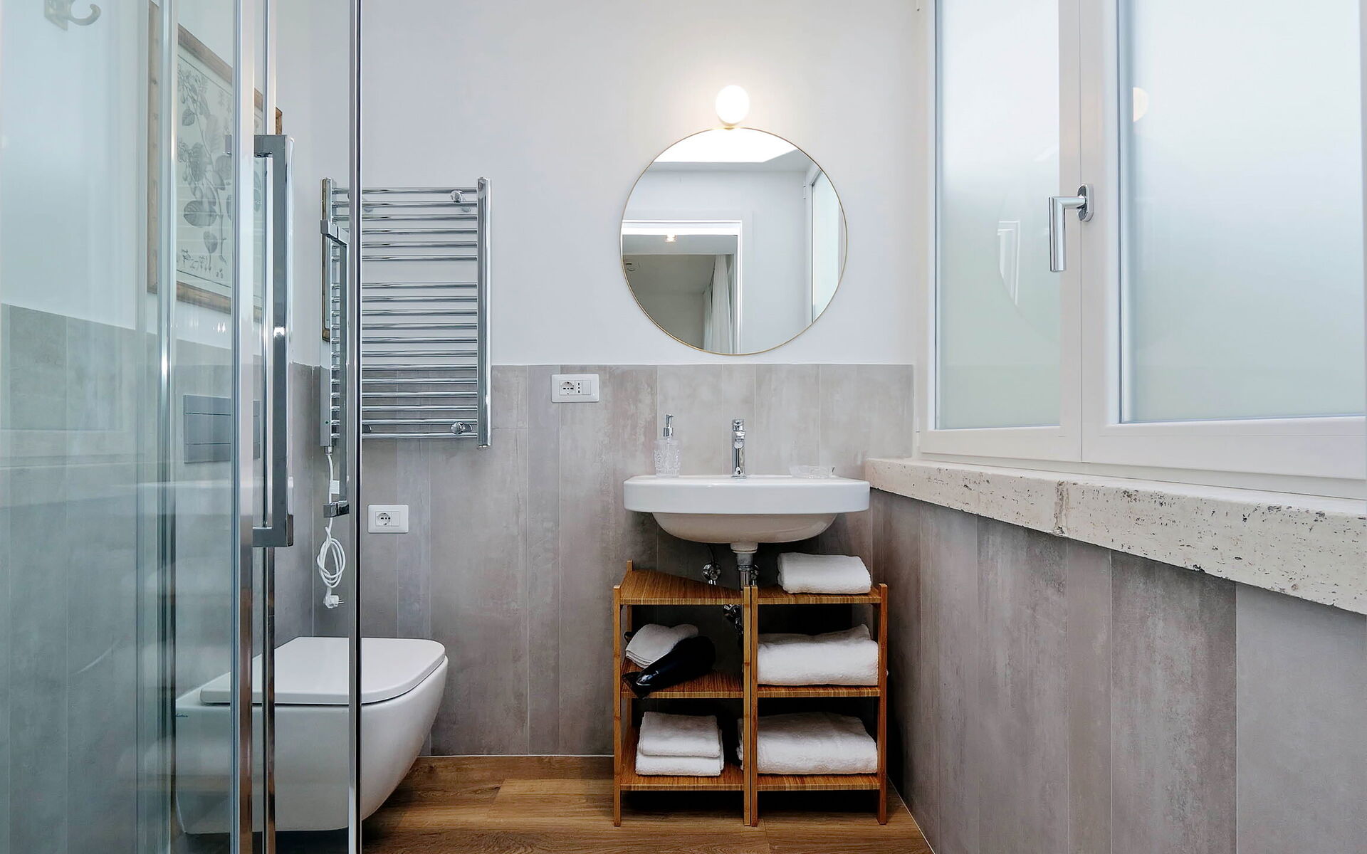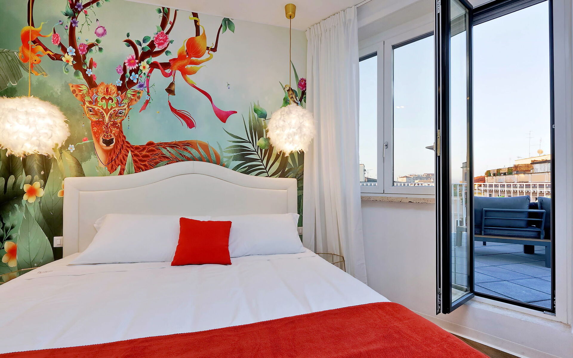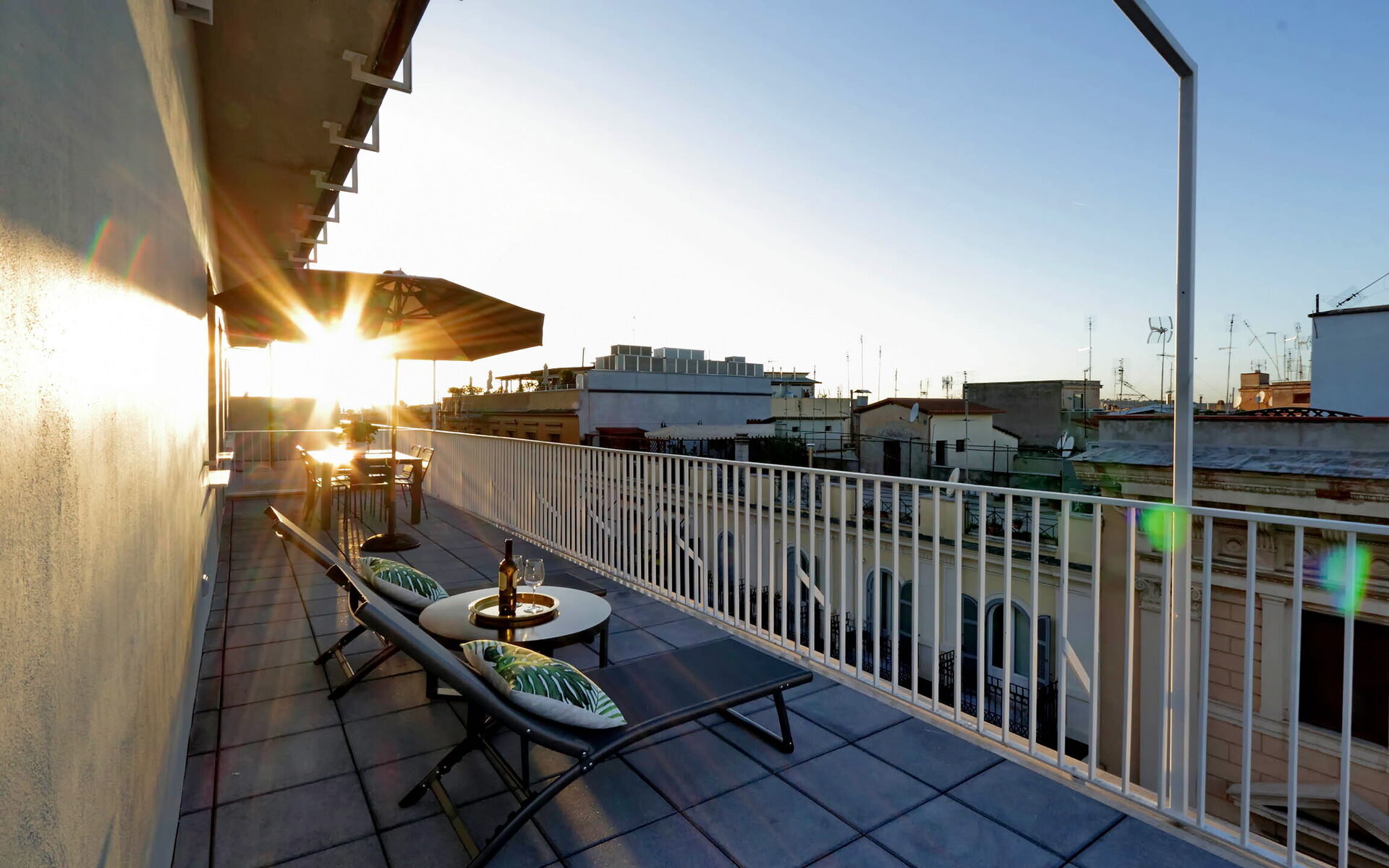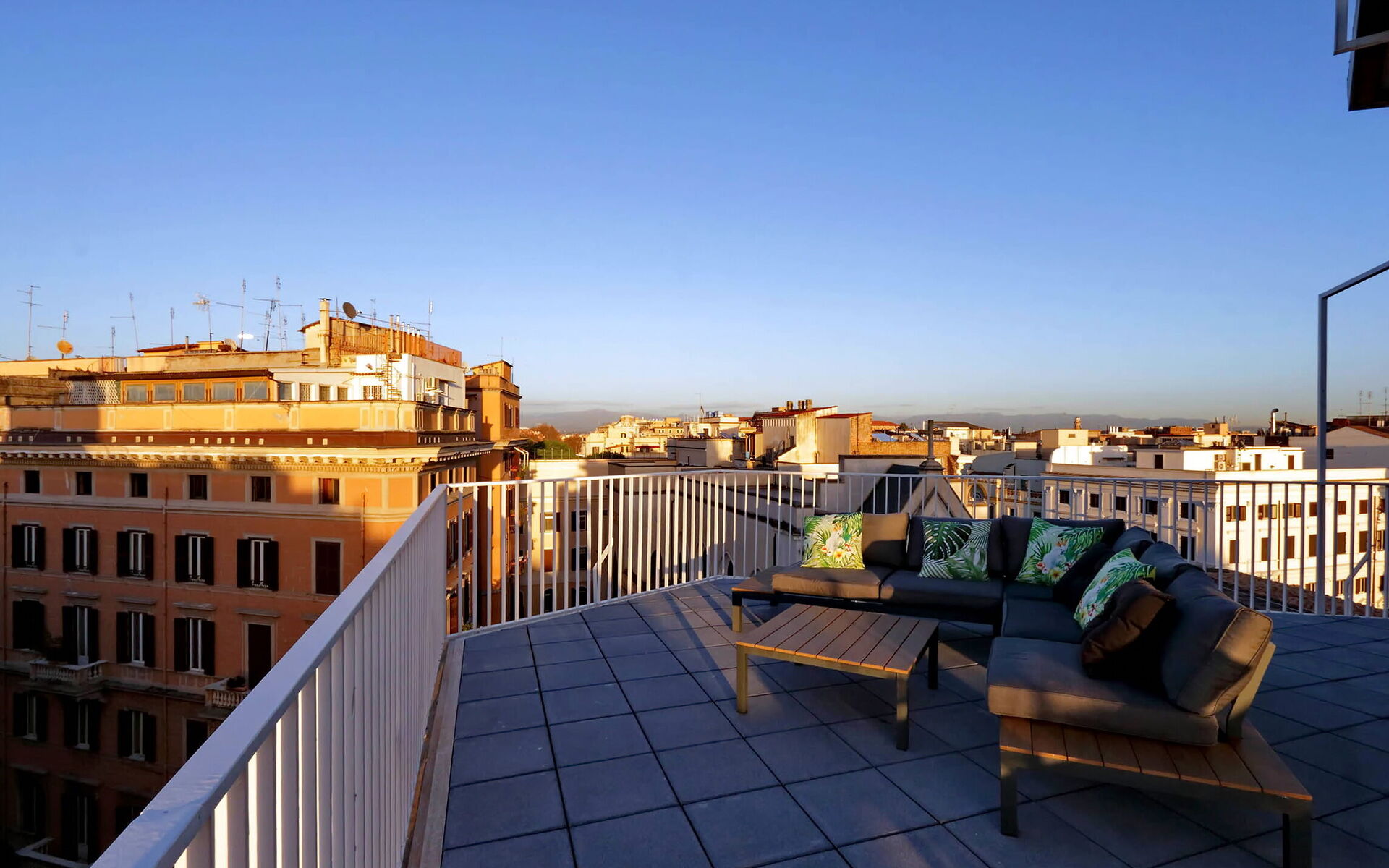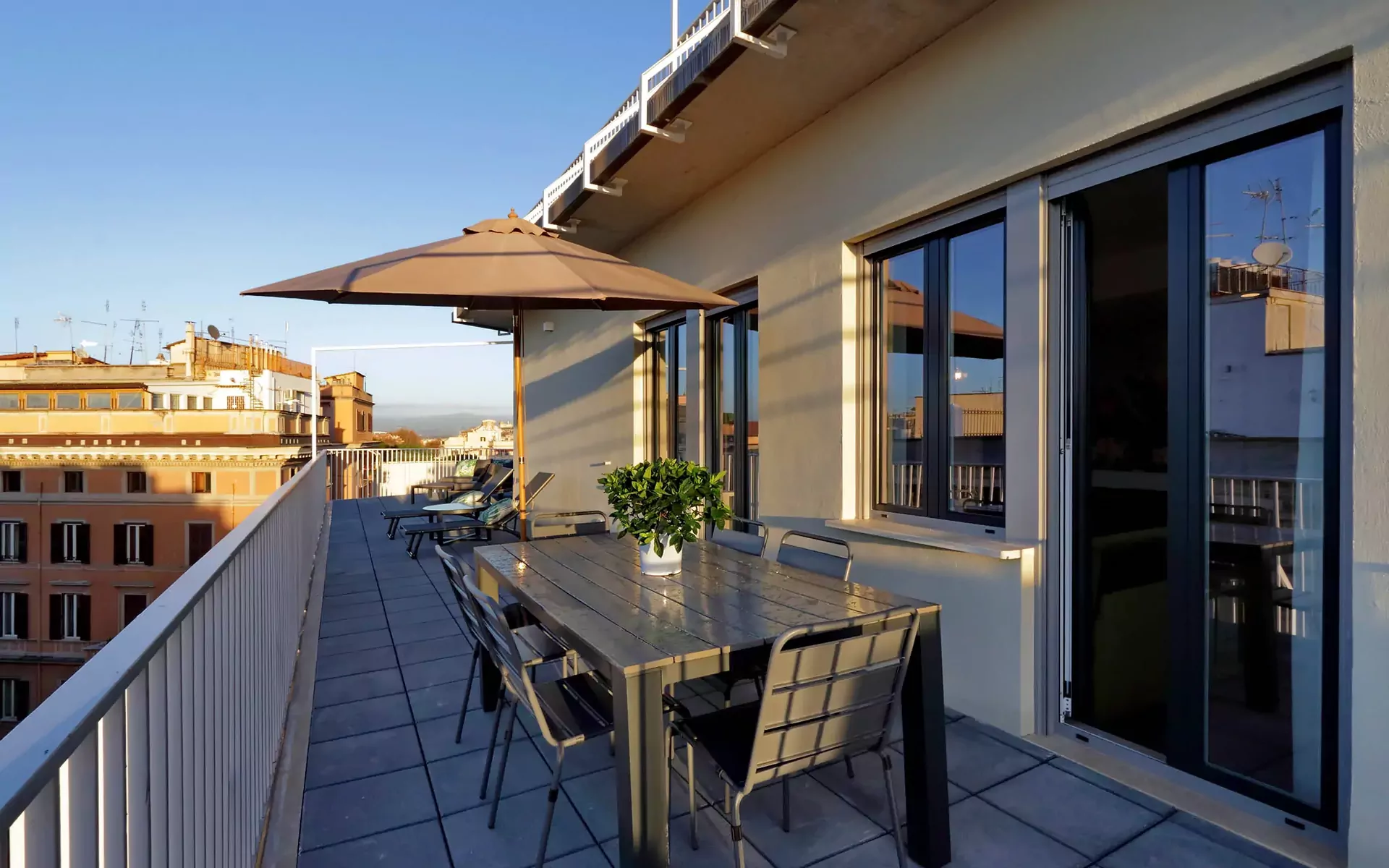 The property opens onto the day area featuring a wonderful view through glass windows and doors with an exit to the terrace and a stunning view of Rome and its surroundings. The terrace is furnished with tables, chairs, deck chairs, sofa The heating and air conditioning system is centralized with ceiling fan coils with an individual room thermostat. The building was built in 1949 and designed by Architect Angelo di Castro and was totally renovated in late 2019. The architectural particularity and a careful choice of furniture highlight its brightness and modernism.