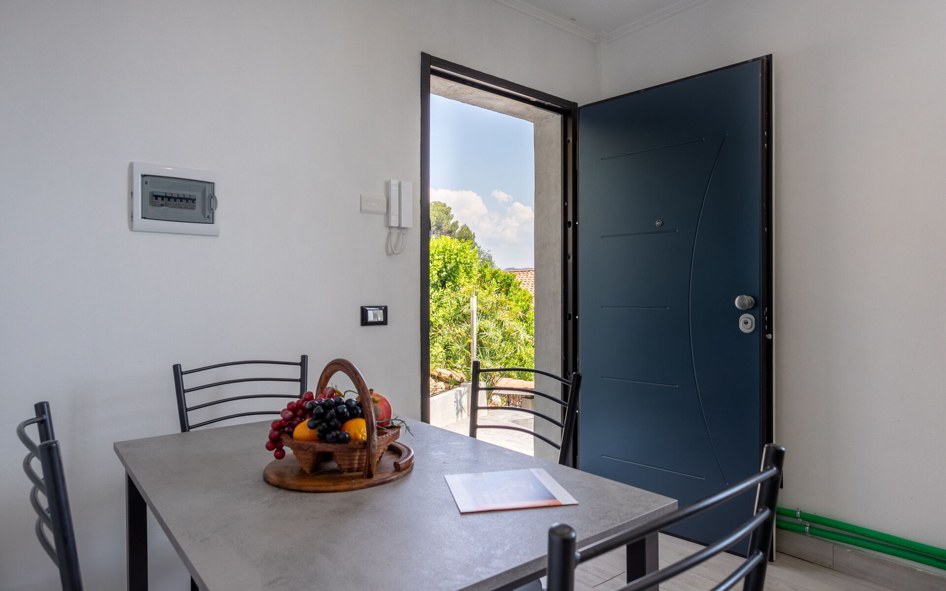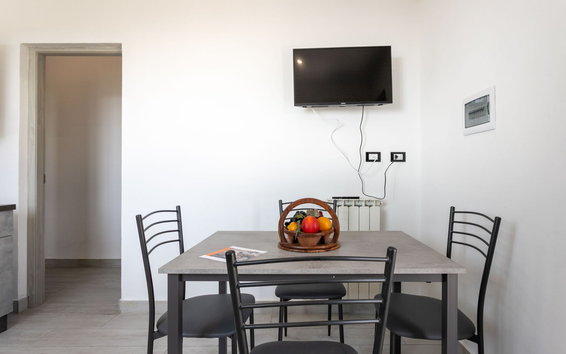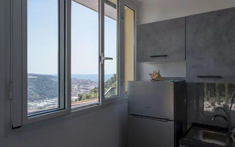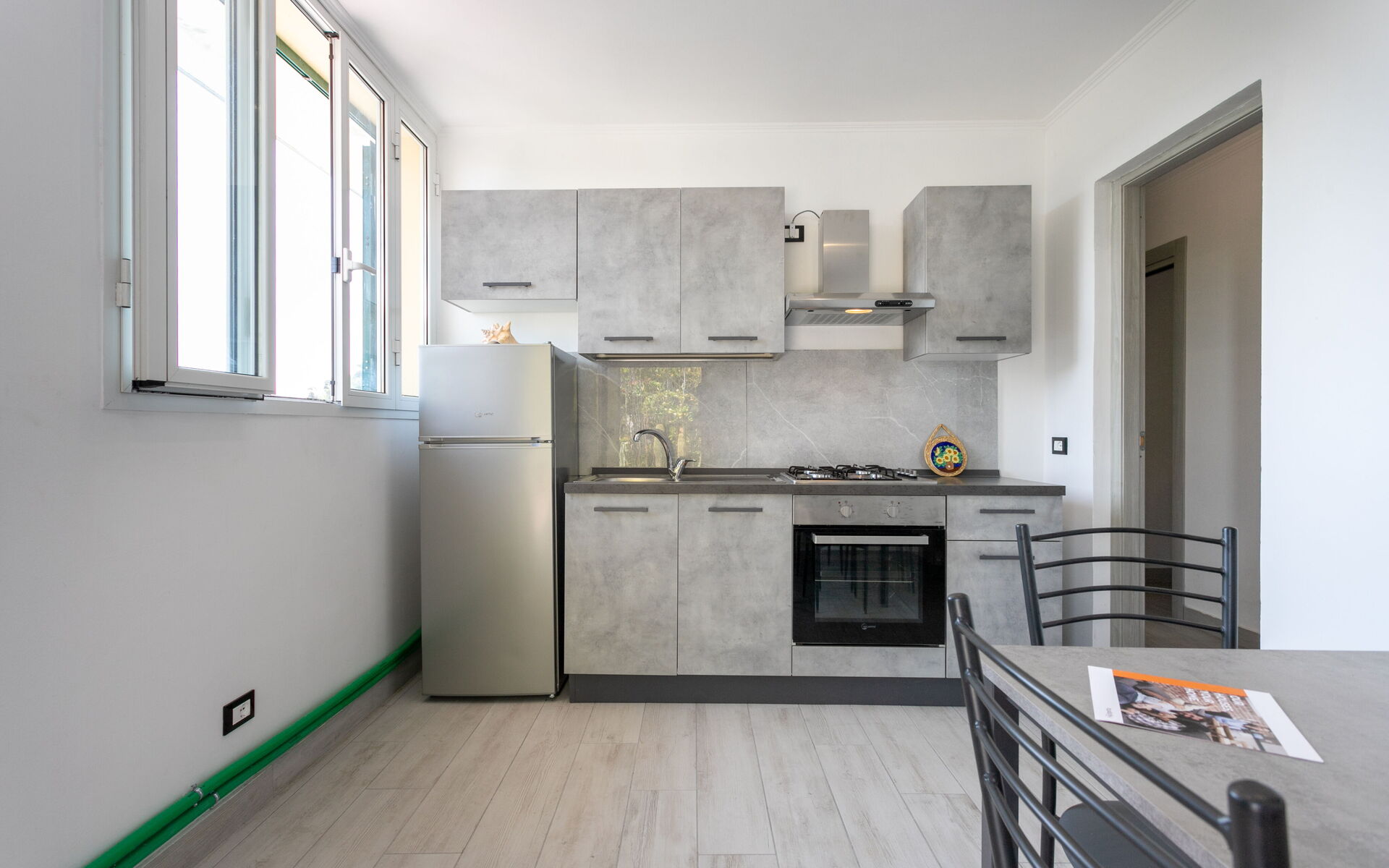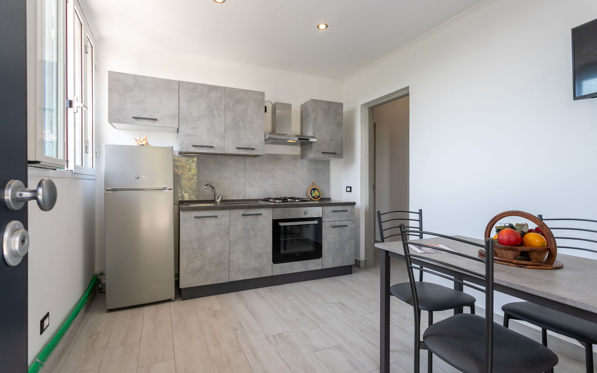 Entering the apartment you find the living area with a table for 4 people, smart TV, open kitchen equipped with fridge, freezer, oven, hob with 4 burners.