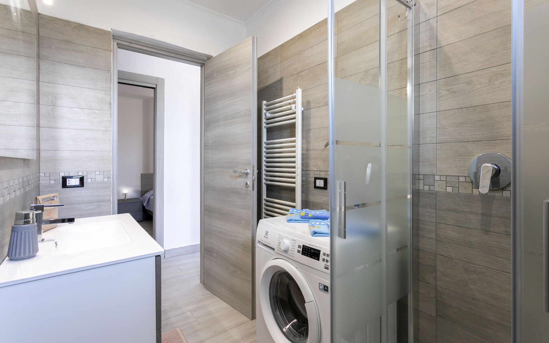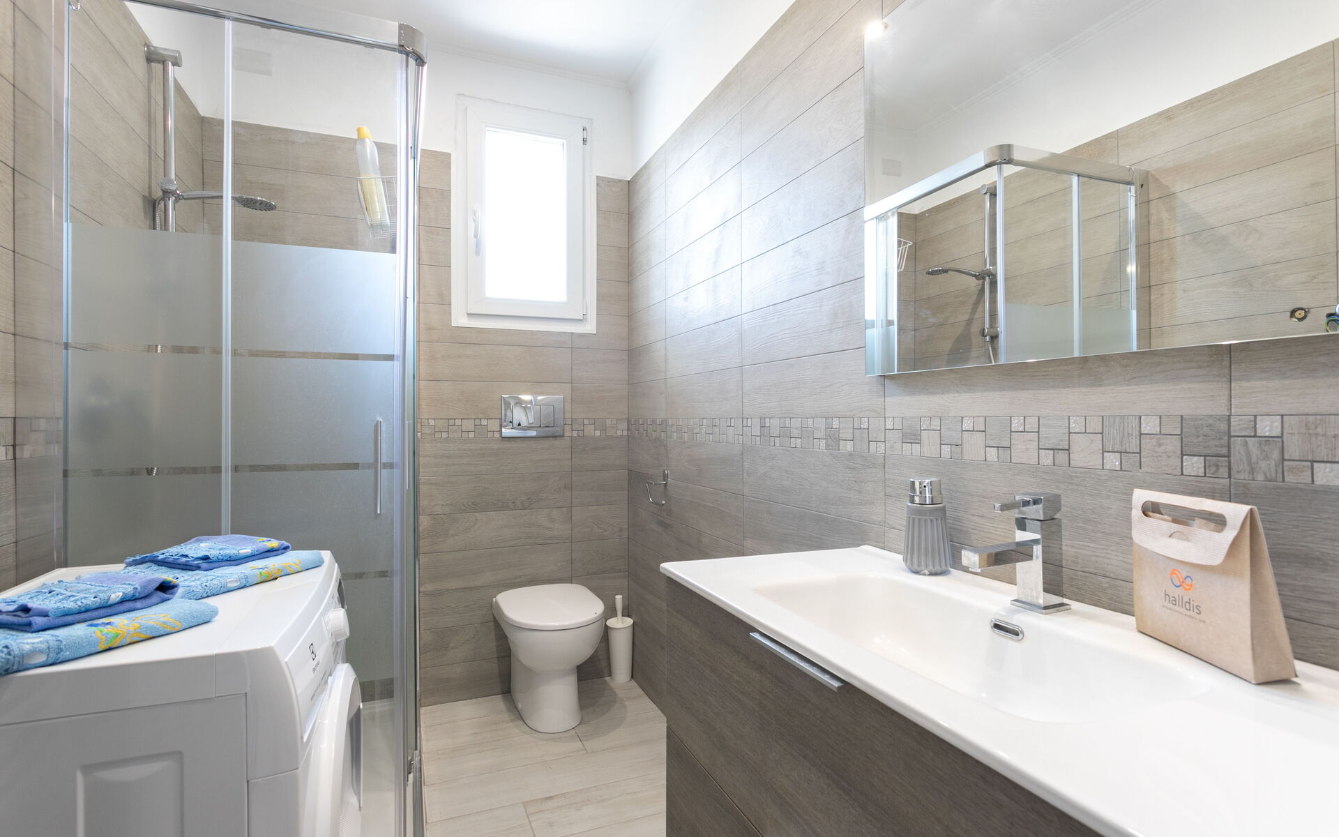 Then we find the bathroom with window with shower, sink, toilet and washing machine.