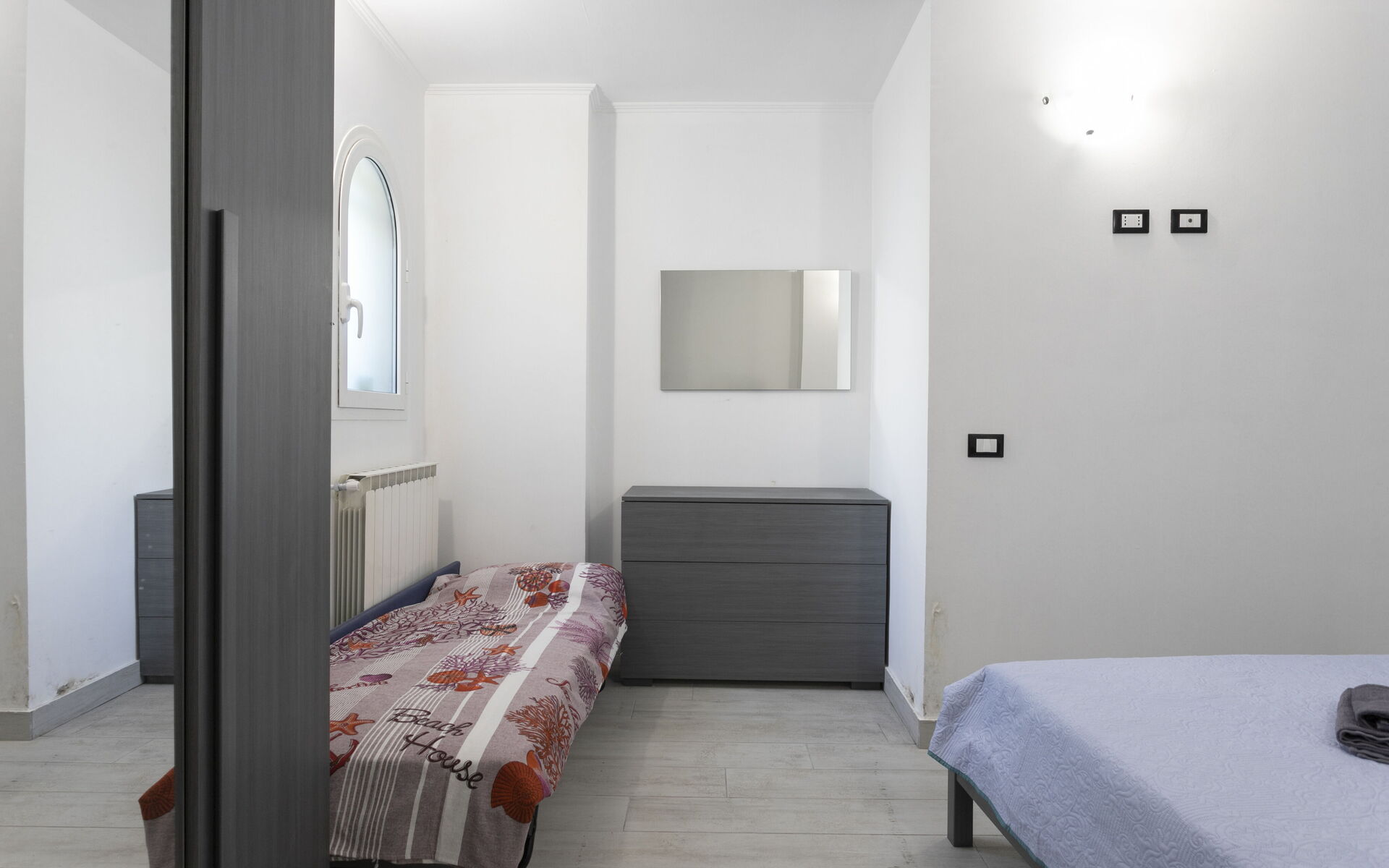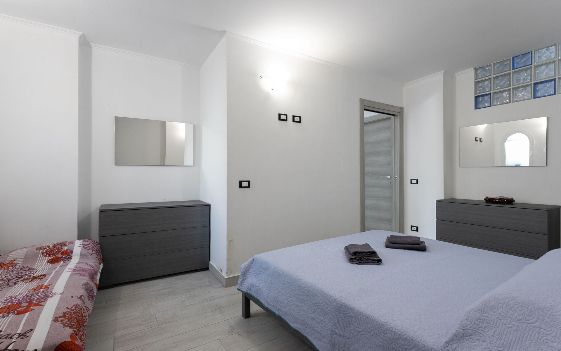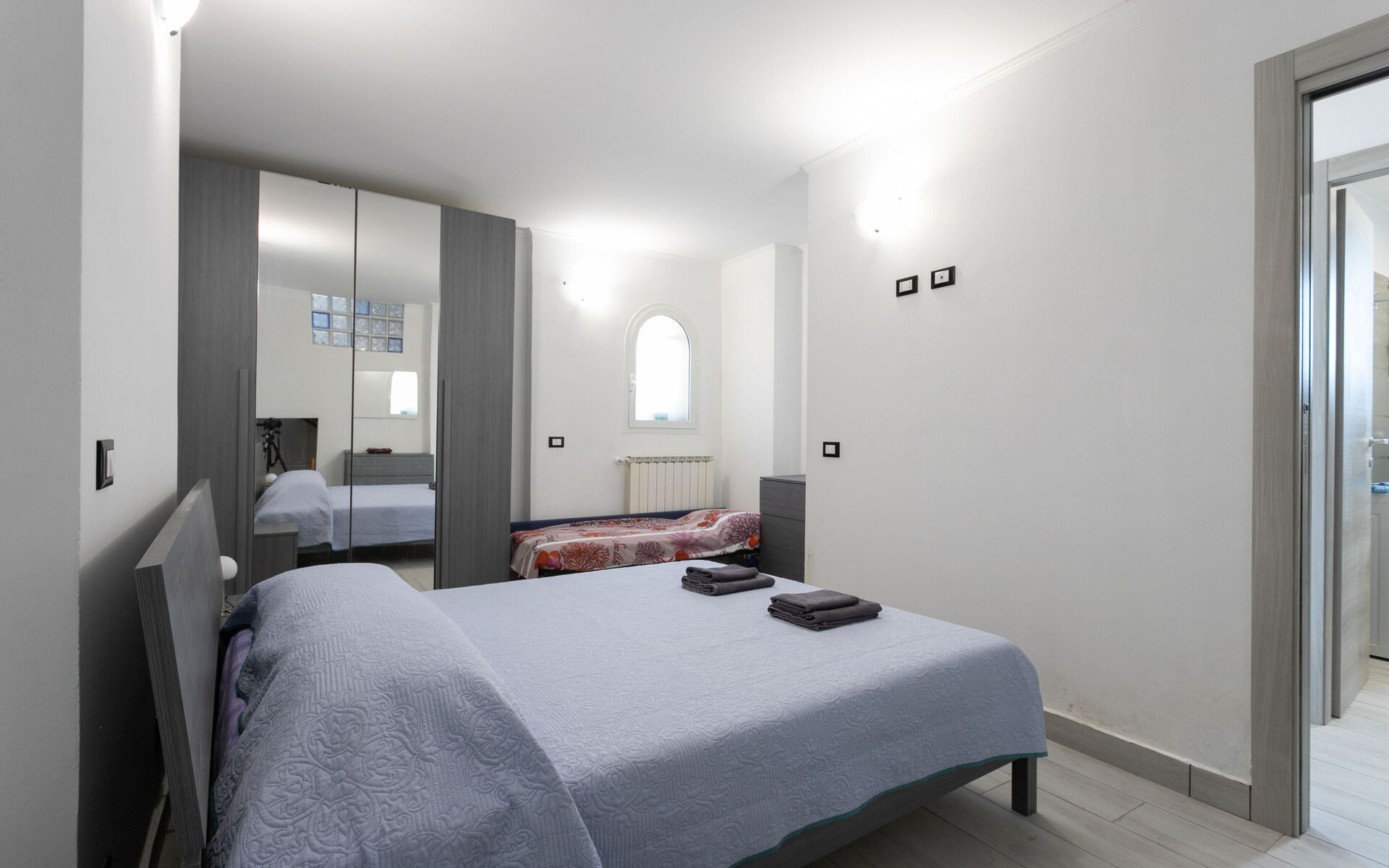 The bedroom is complete with a double bed, bedside tables, a four-door wardrobe, two comfortable chests of drawers, a single bed and communicates with a small closet.