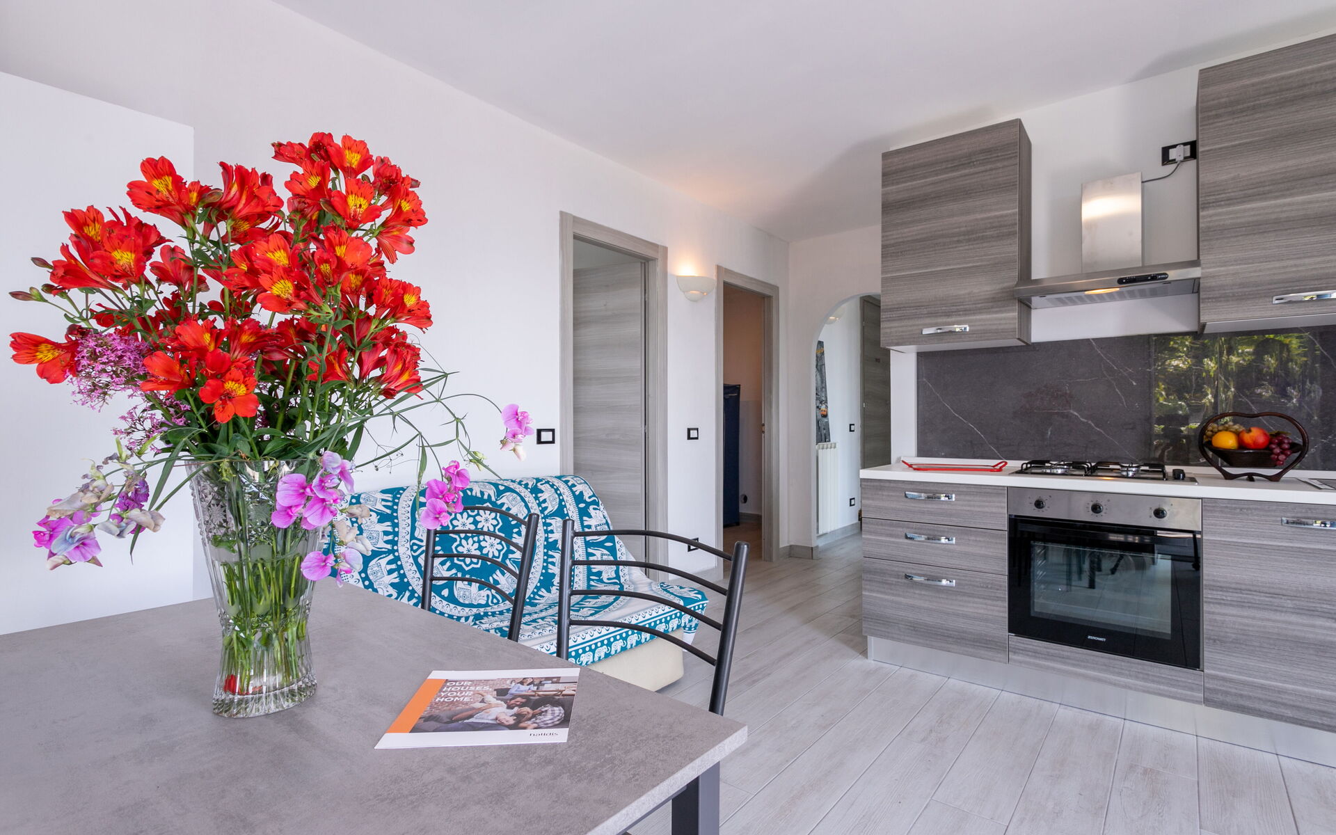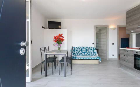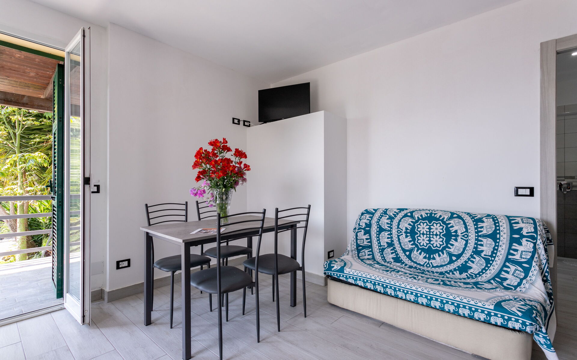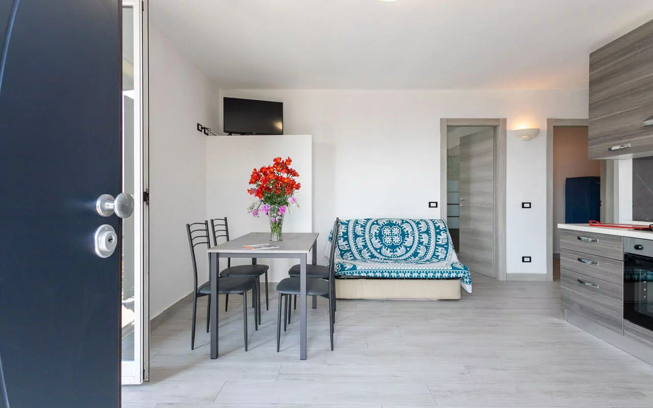 Entering the apartment we find a table for 4 people, the TV area and a single sofa bed with two seats.