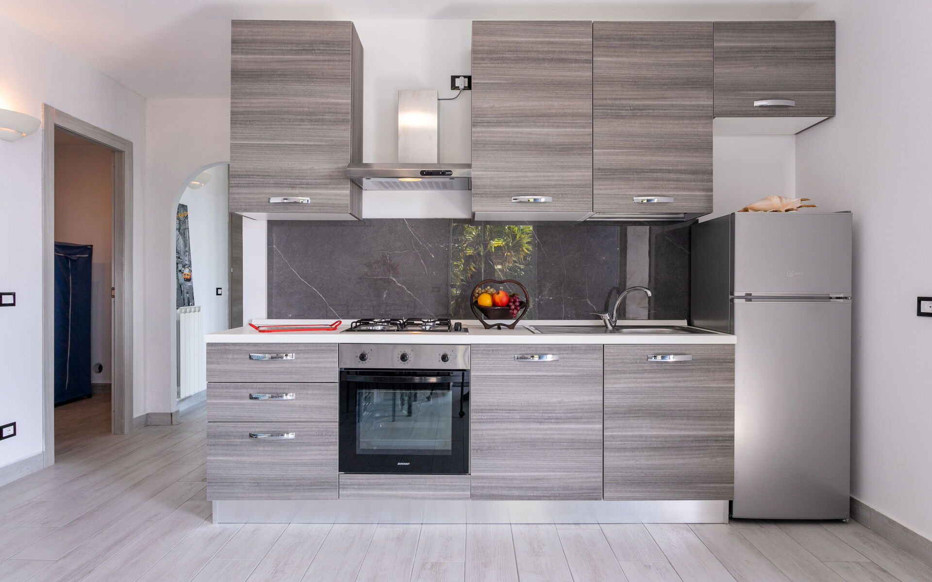 Then we have the open kitchen set up with a fridge, freezer, four-burner hob and oven.