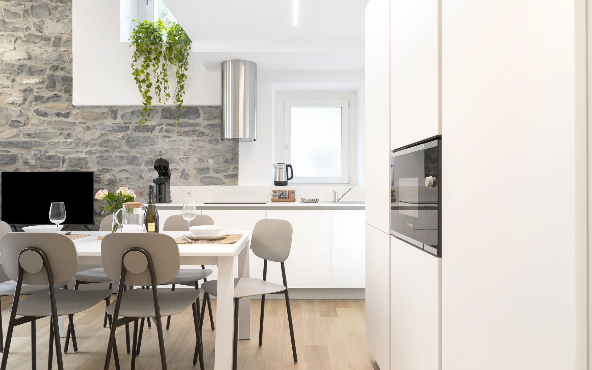 The table can accommodate up to six people, and the living area, illuminated by large windows, is equipped with a comfortable sofa and equipped with a 43" Smart TV.