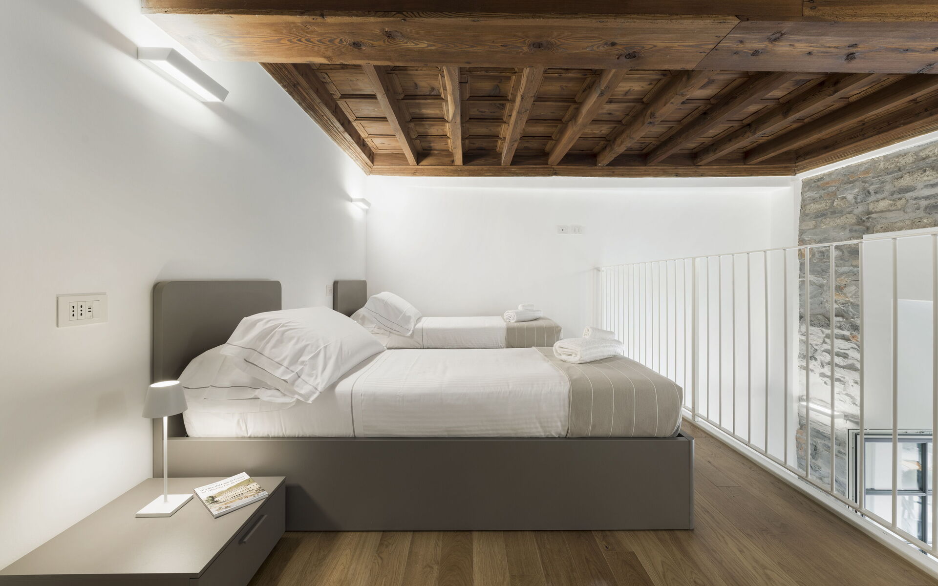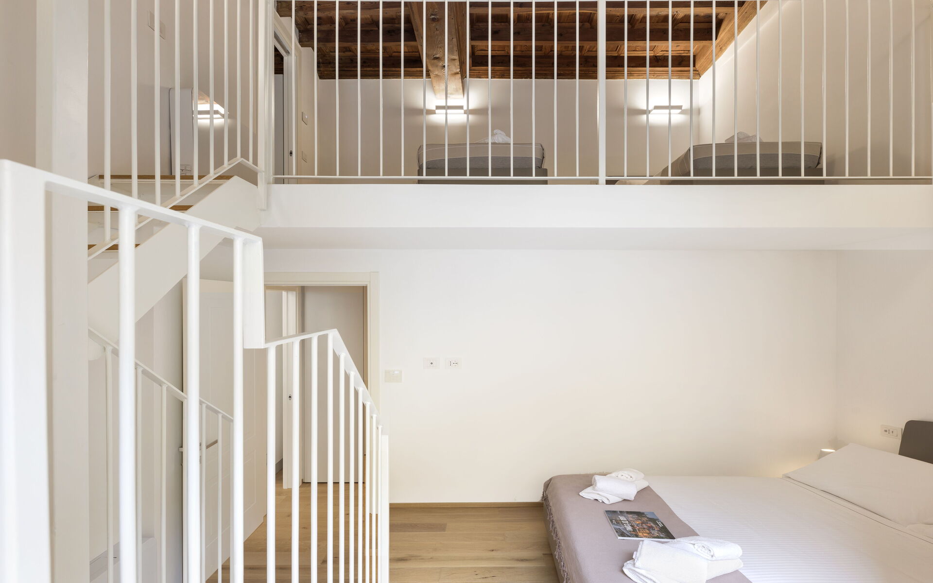 In the mezzanine, there is a bedroom with two single beds, a wardrobe, and a bathroom with a window, with a shower, sink, and toilet.