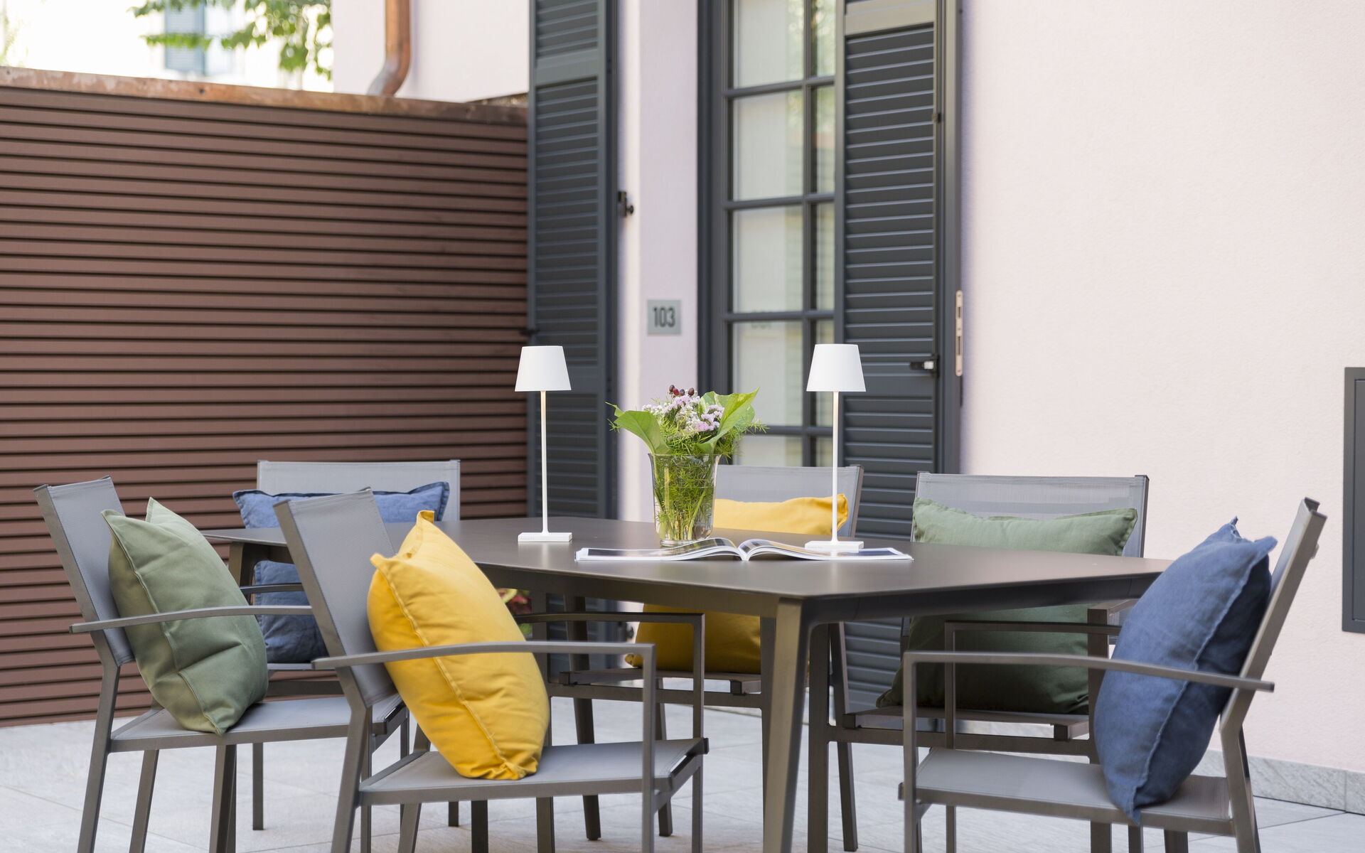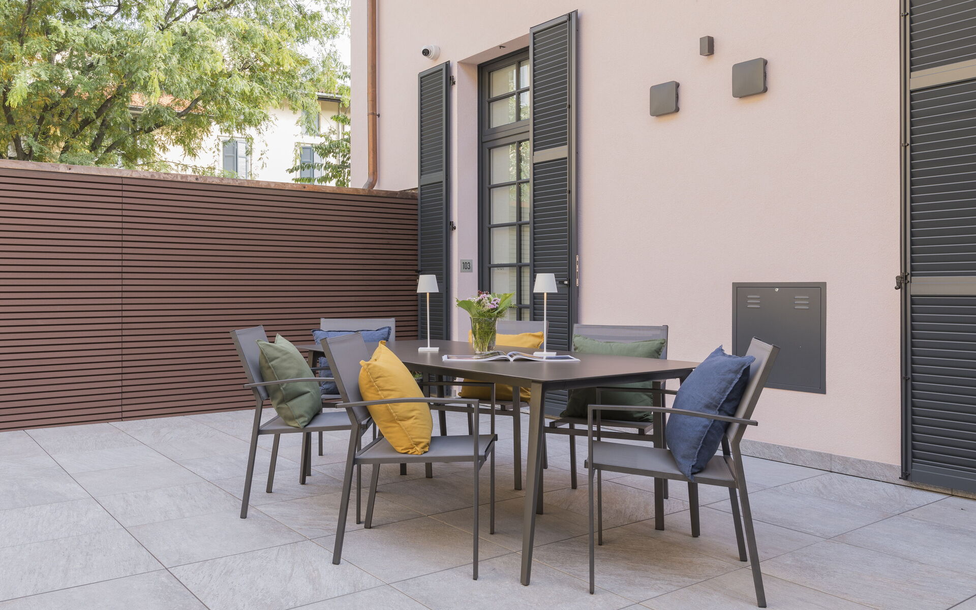 The apartment has a private terrace furnished with tables and chairs.