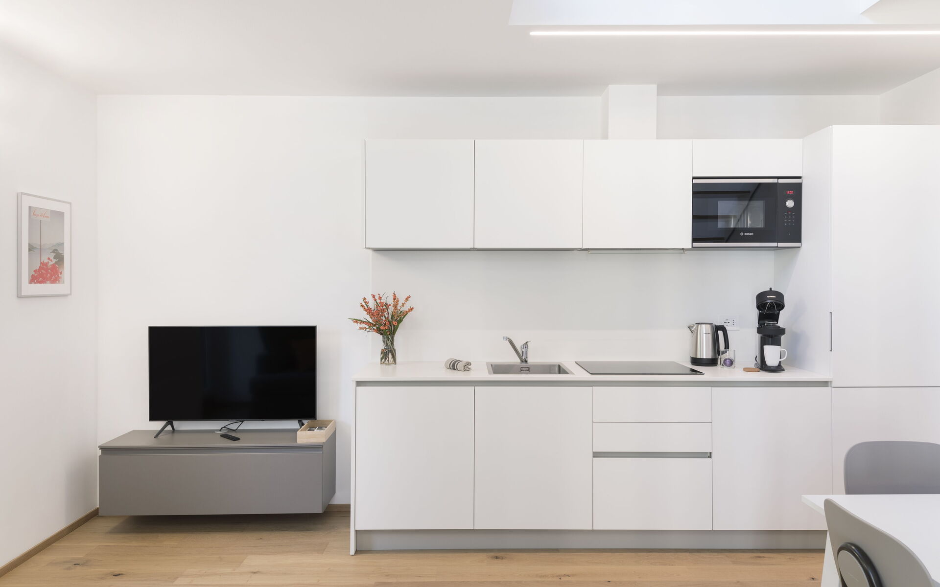 The table can accommodate up to four people, and the living area with a sofa is equipped with a 43" Smart TV.