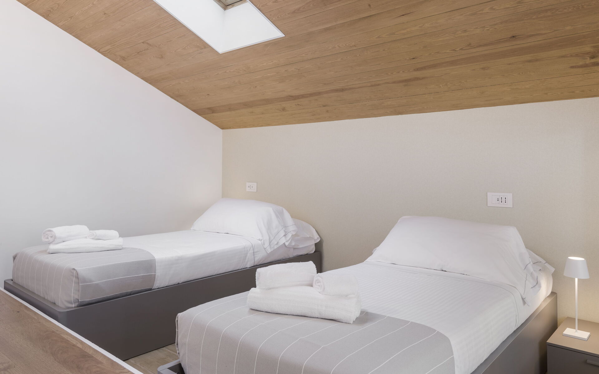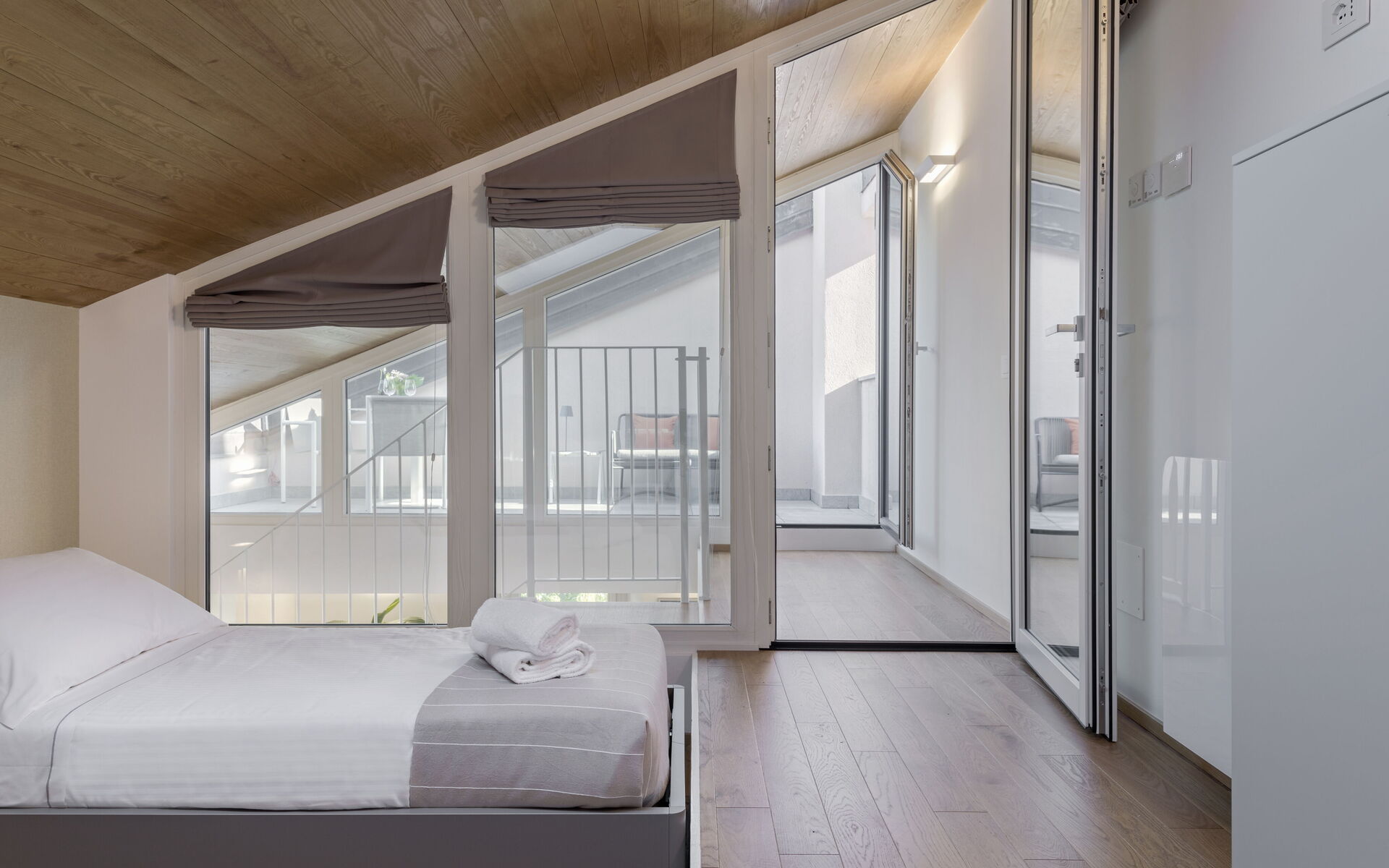 On the upper floor, there is access to a bedroom with two single beds and a terrace furnished with a table and chairs.