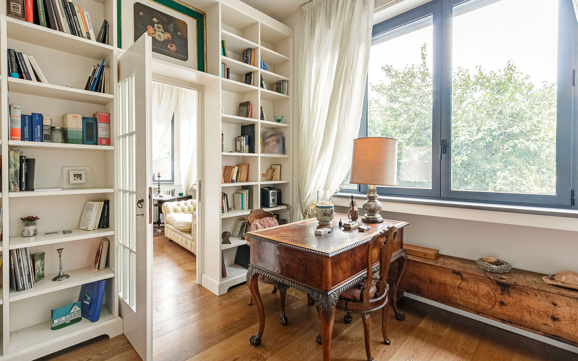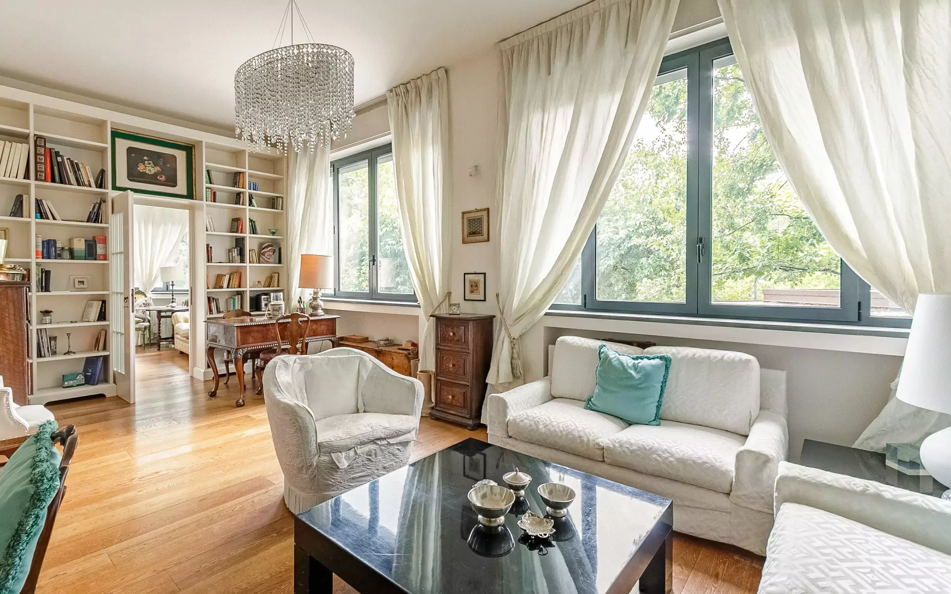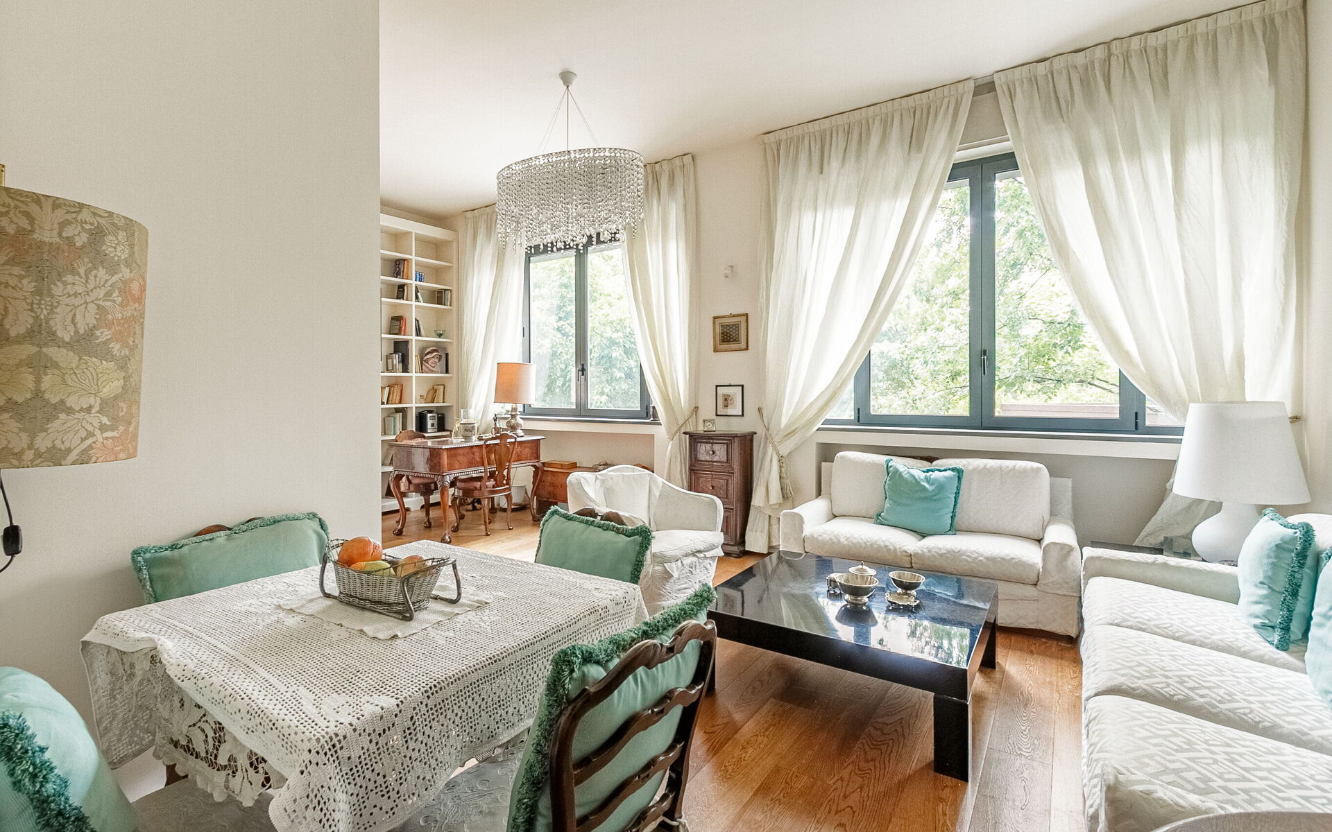 Continuing we enter the very spacious living area where we find two comfortable sofas, a television area, a desk, a large bookcase and a table for 4 people.
