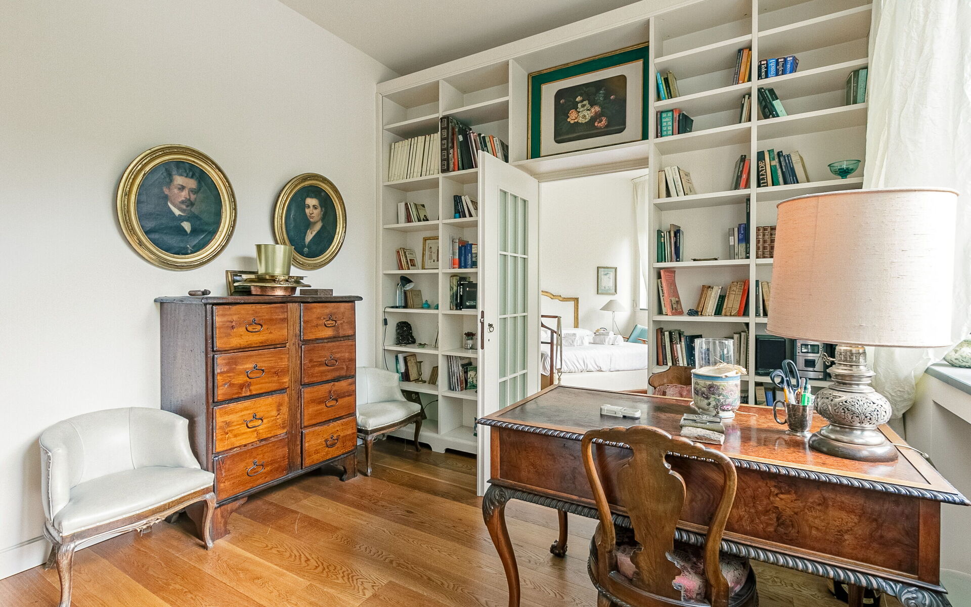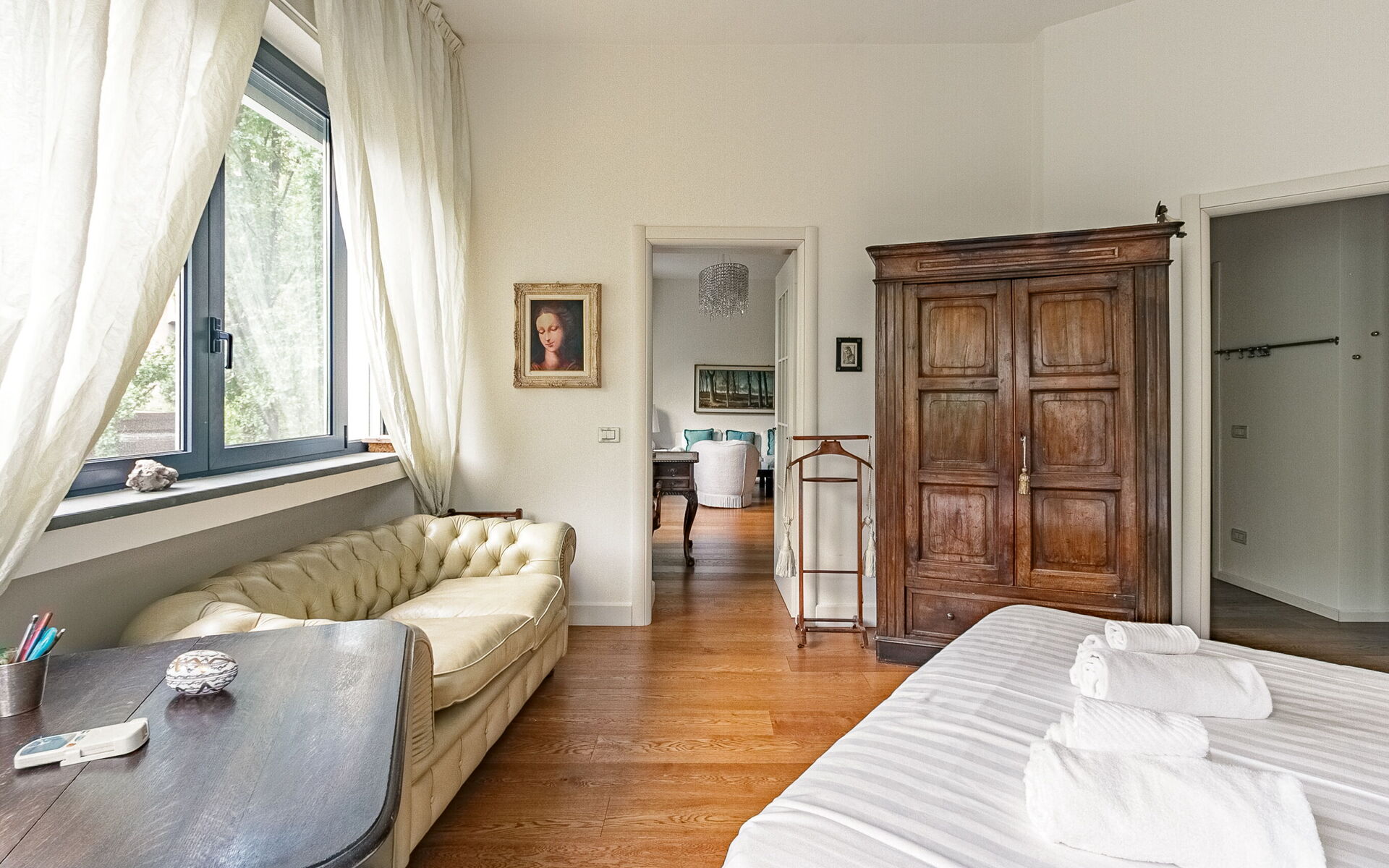 Then we find the sleeping area consisting of a large bedroom with double bed, bedside tables, two-door wardrobe and sofa and a wardrobe room with two 4-door wardrobes.