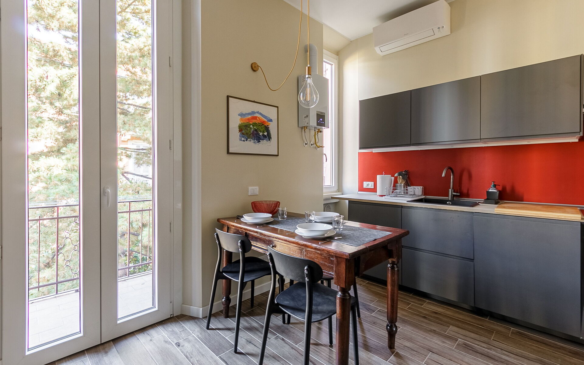 - The living area which includes a French double sofa bed (200cm x 140cm); a 50-inch smart TV, a table for four and a fully equipped and equipped kitchen which includes a washing machine, a dishwasher and a microwave oven. The living area also includes a balcony overlooking the green of the internal courtyard.