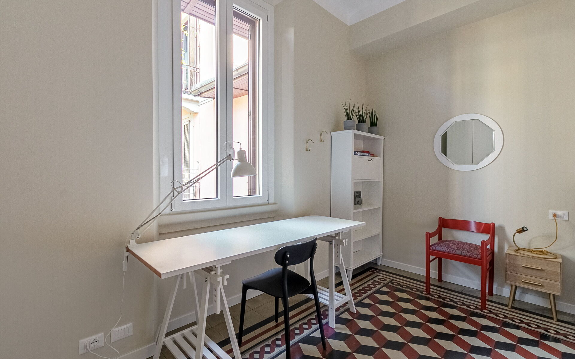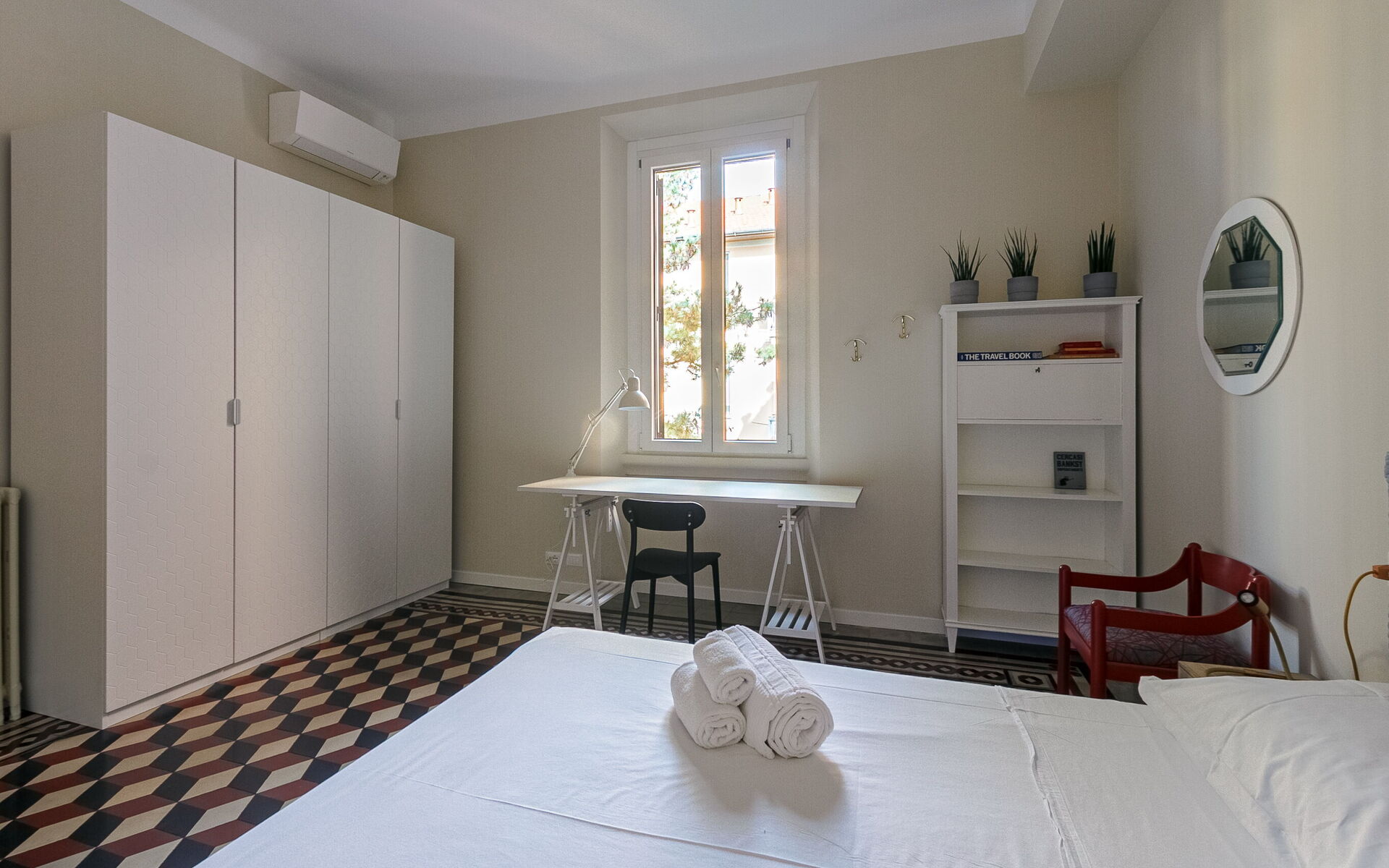 - A bedroom that includes a double bed (190cmx160cm), a wardrobe with four doors, a desk and a small bookcase.