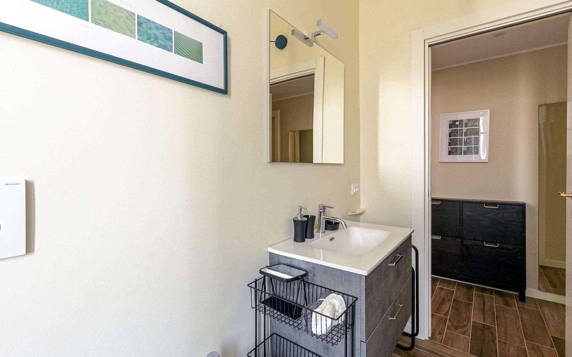 The flooring is in wood-effect porcelain stoneware in the living room, corridor and bathroom.
