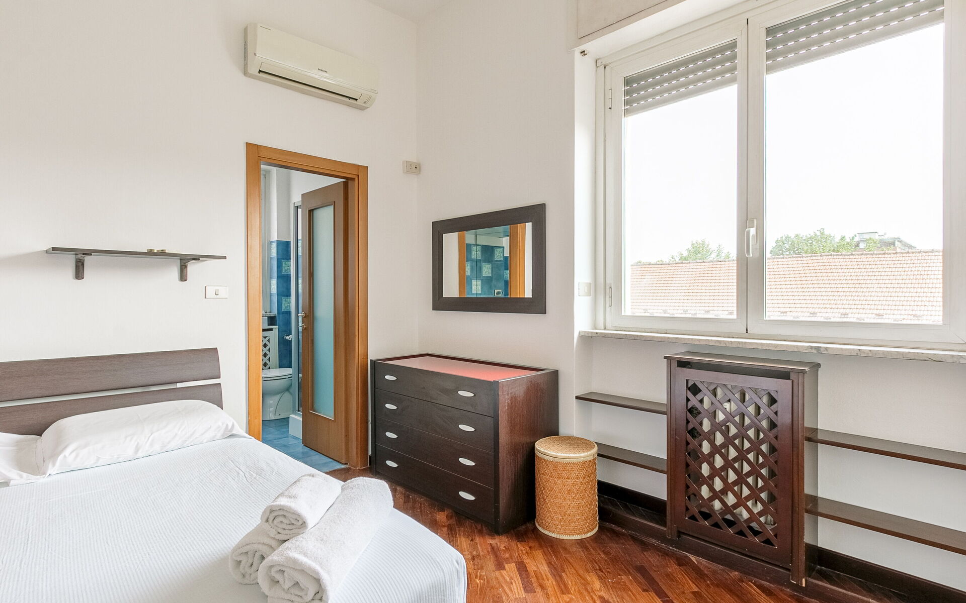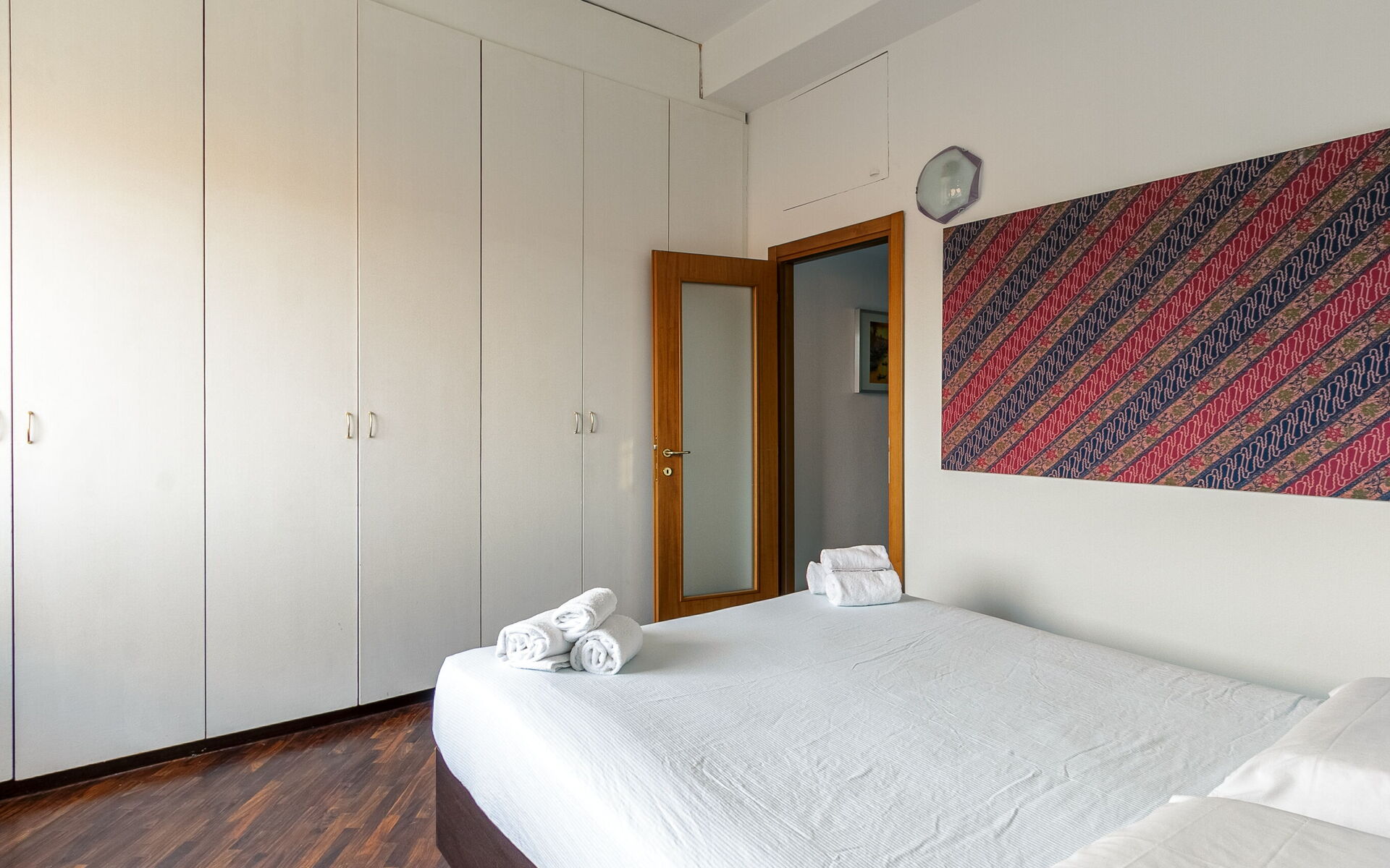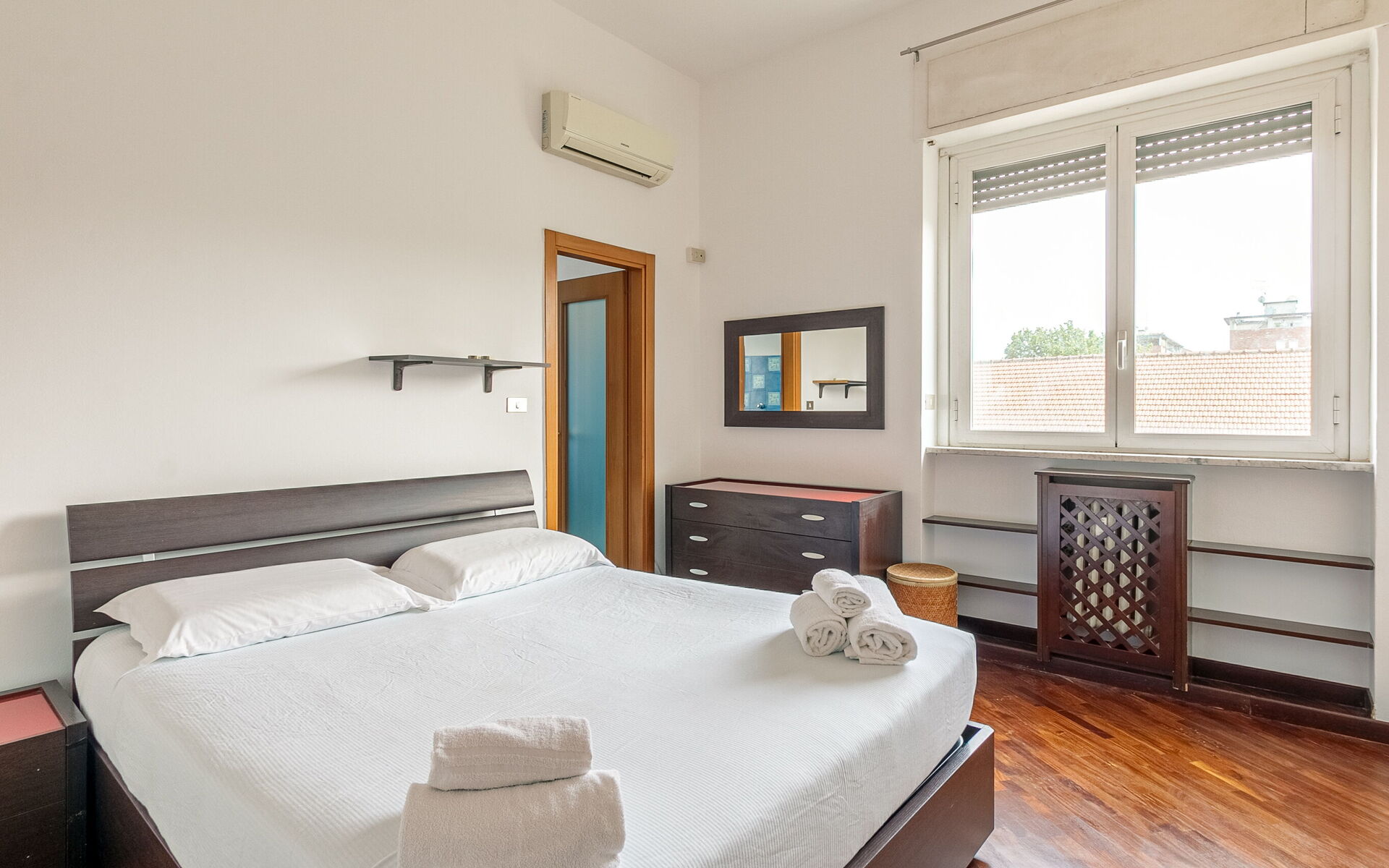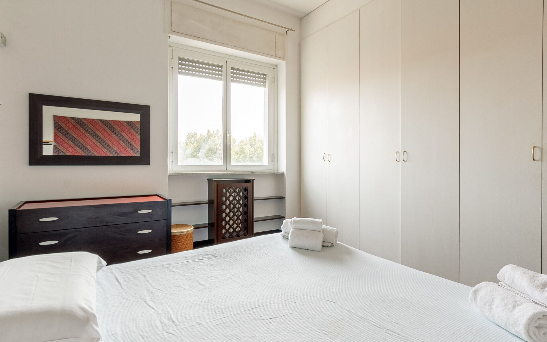 In the bedroom we find a large 7-door wardrobe, a double bed and a chest of drawers.