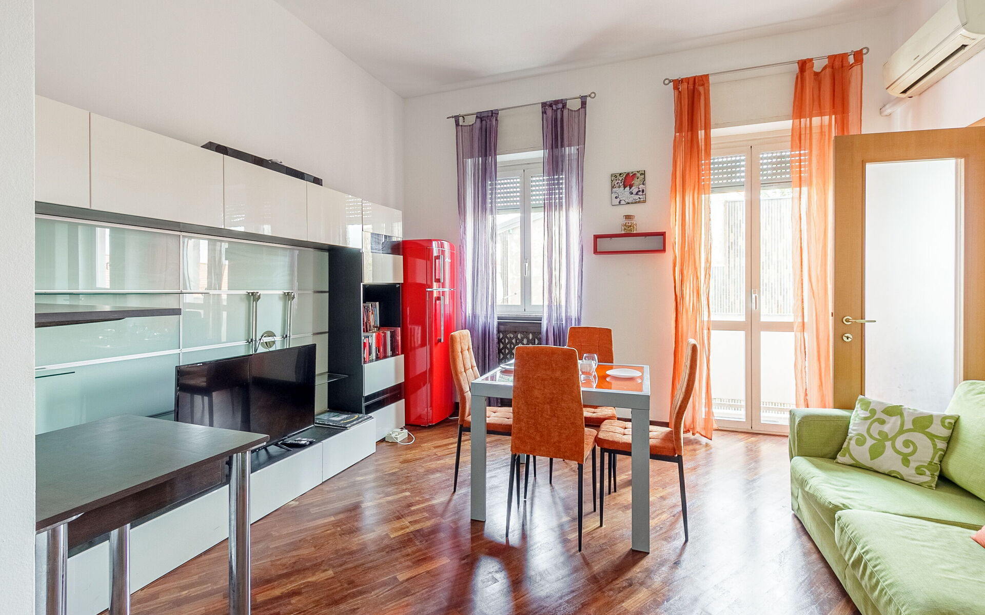 Upon entering we find the living area with a large 4-door wardrobe, a spacious closet, the living area with a 3-seater double sofa bed, 43-inch smart TV, table for 4 people, desk, fridge and freezer.