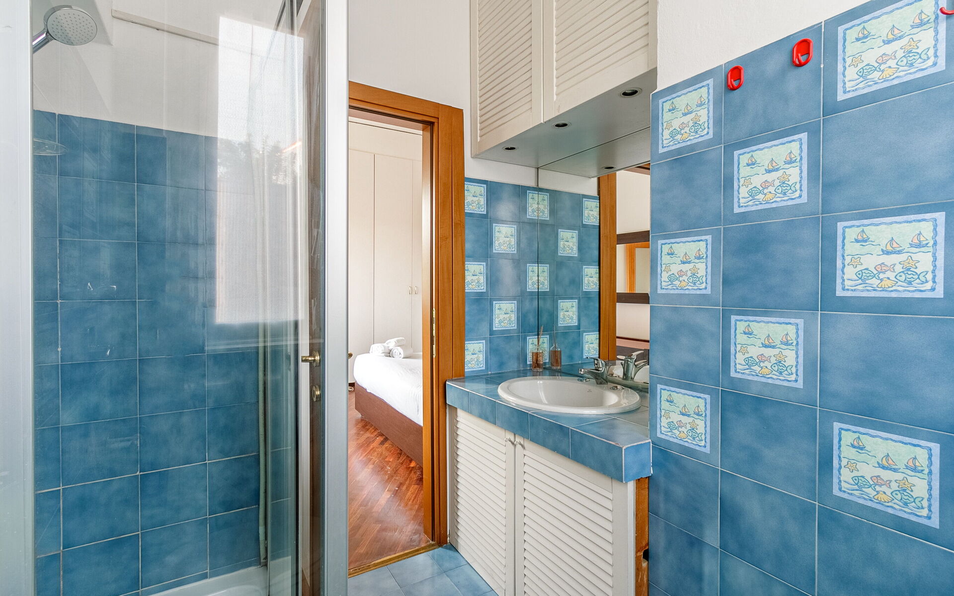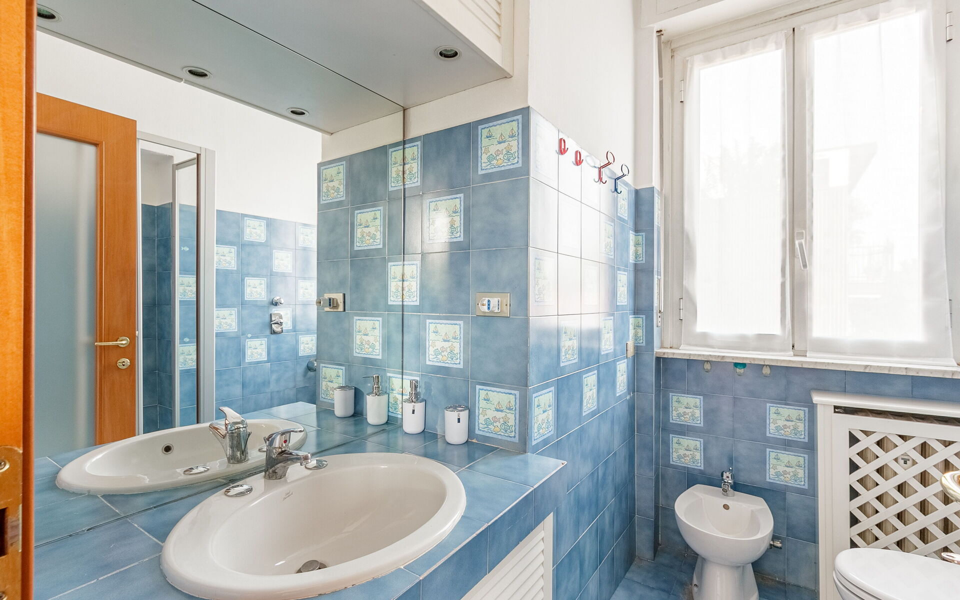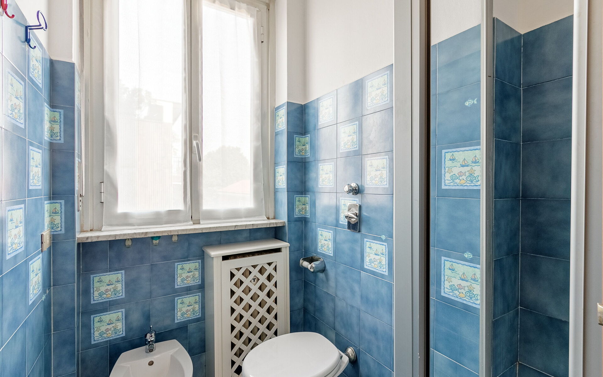Finally we find the bathroom with toilet, bidet, sink, shower.