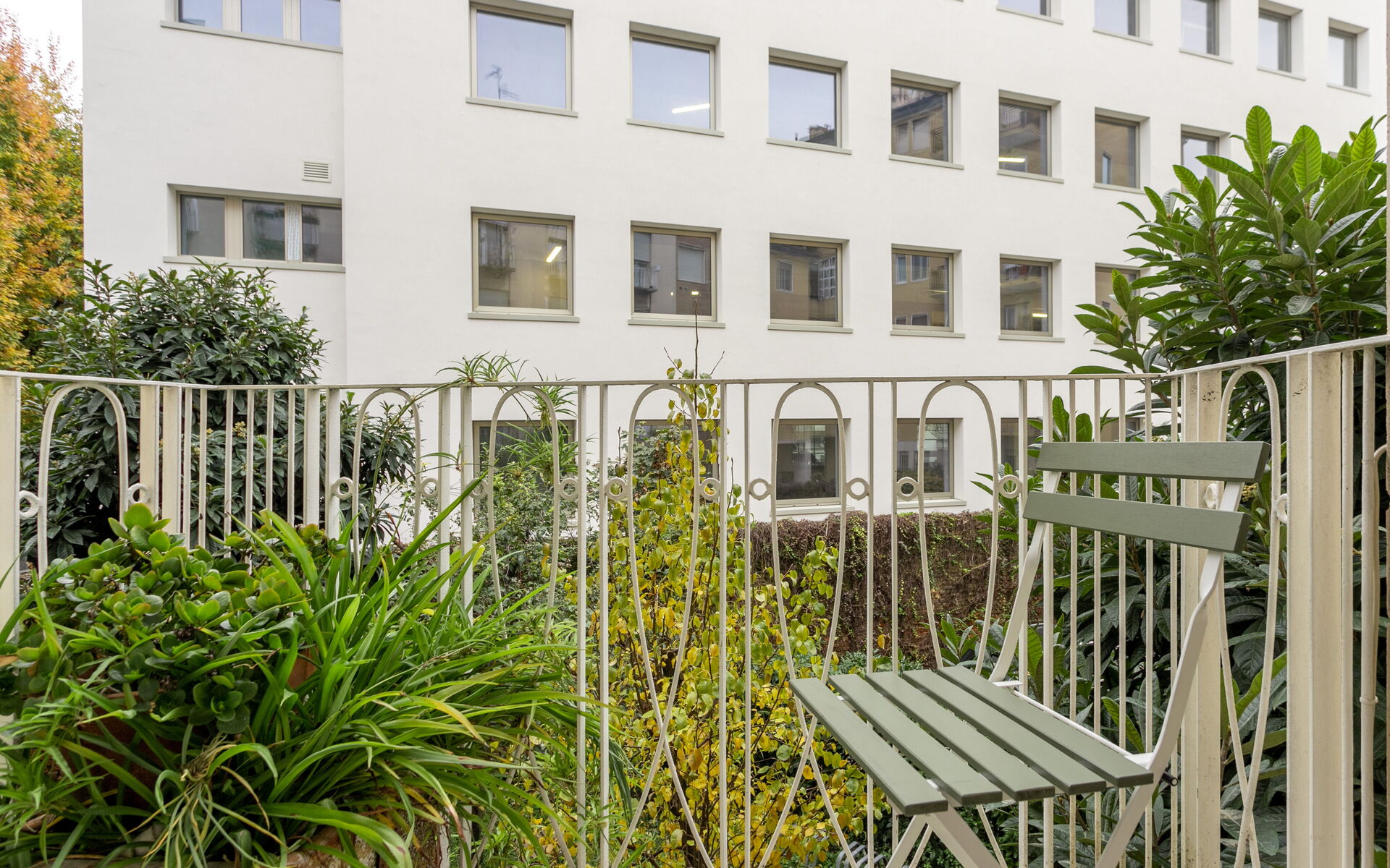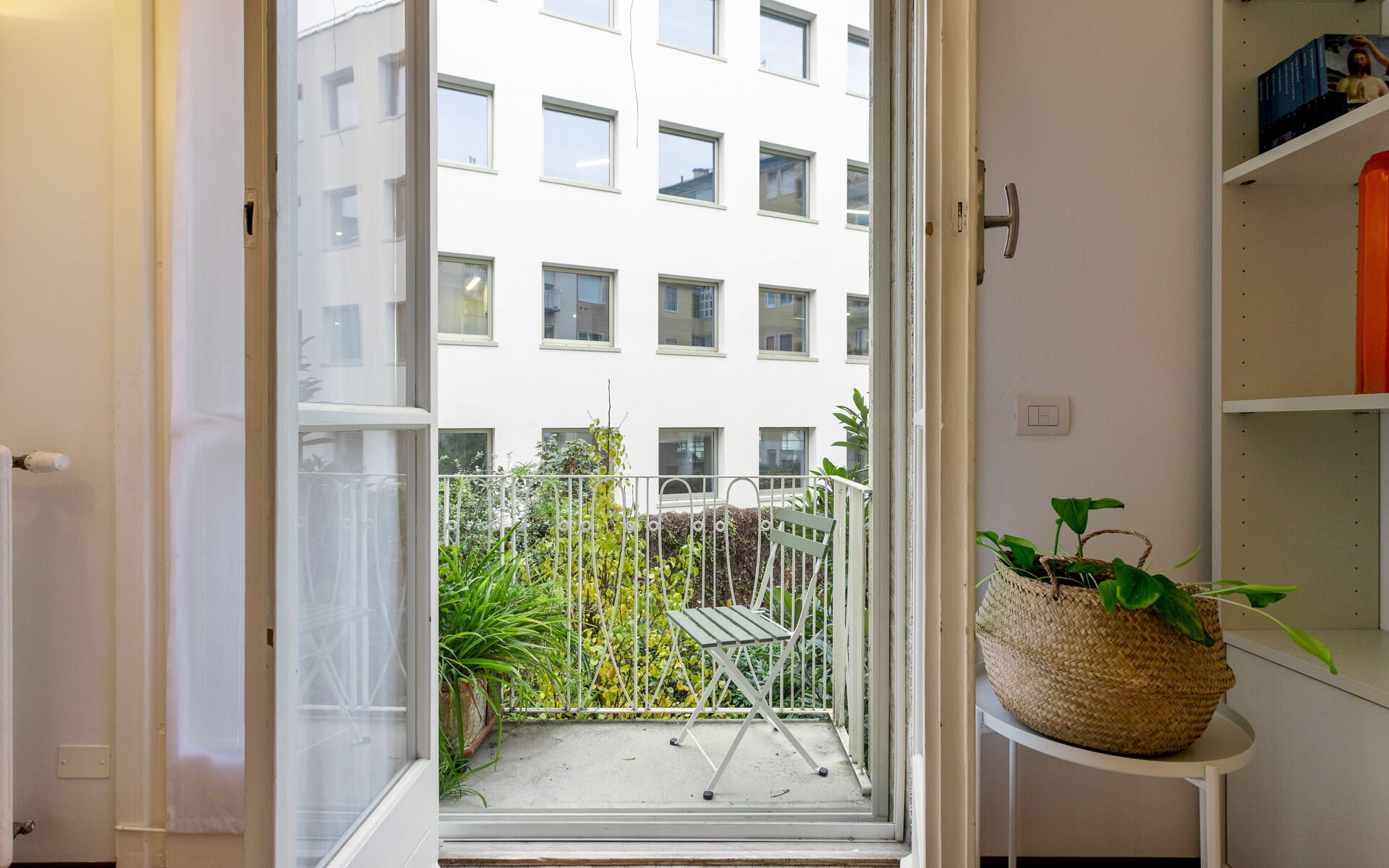 The window leads to the balcony with a pleasant view of the internal garden and a comfortable chair.