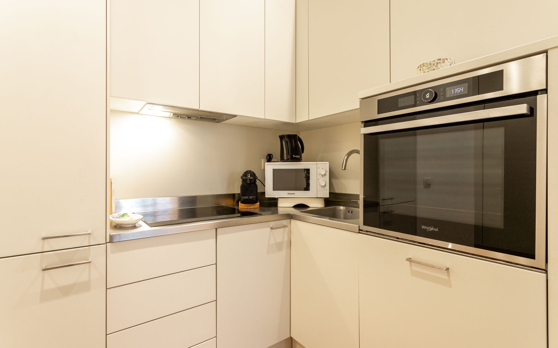 The kitchen is complete and equipped with an induction hob, fridge, freezer, coffee machine, traditional oven, microwave and dishwasher.