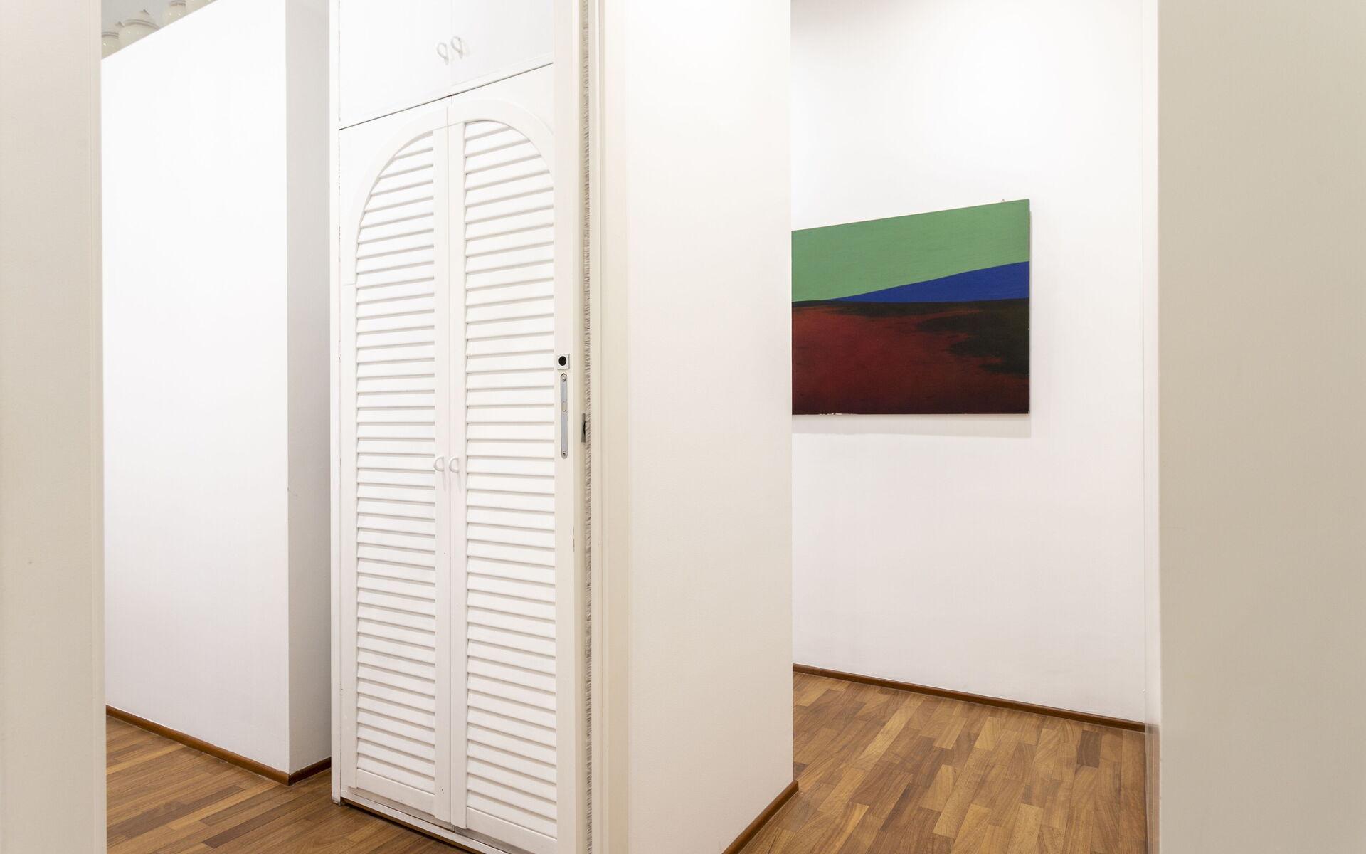 The first bedroom has a single bed, a two-door wardrobe, a desk with chair and a small service balcony, with a washing machine.
