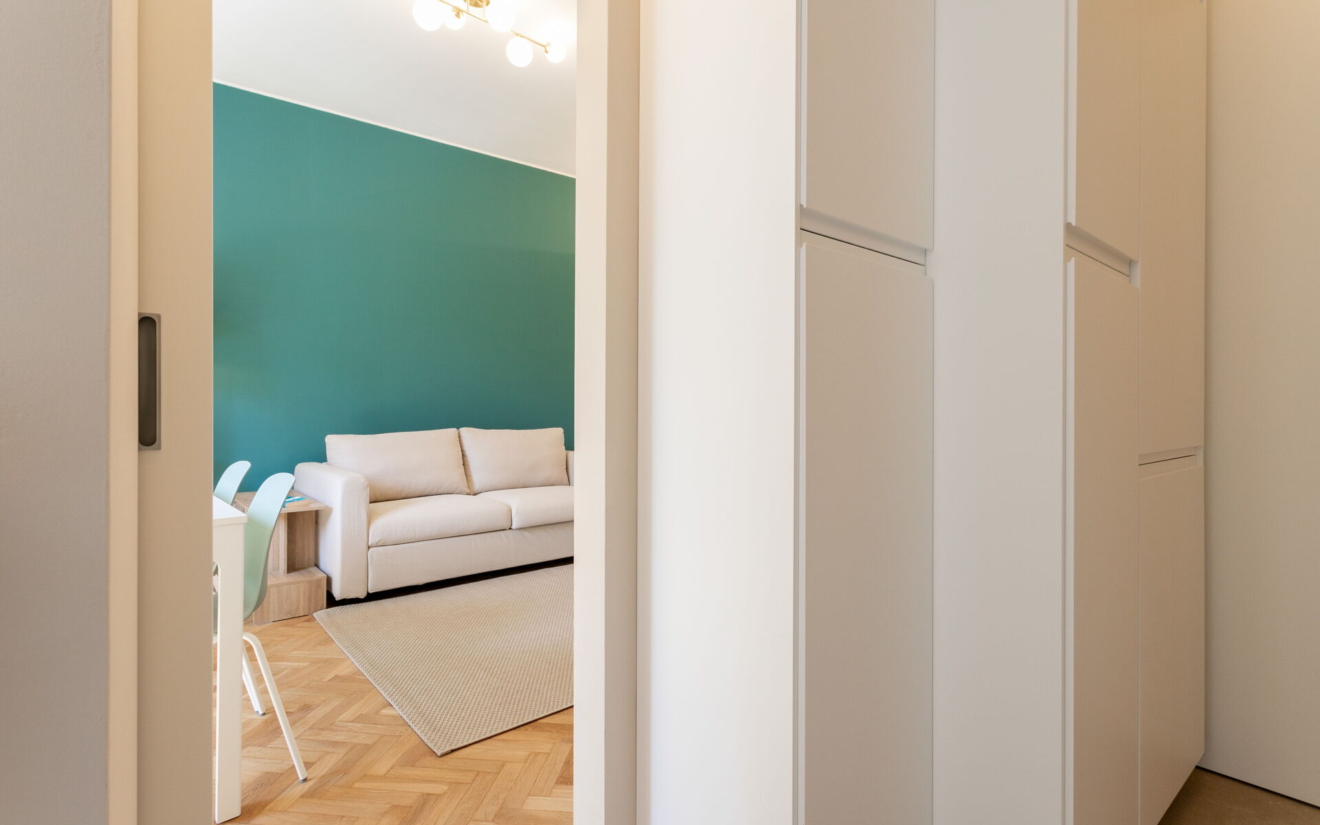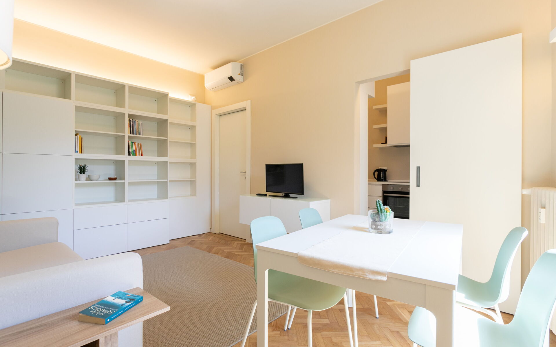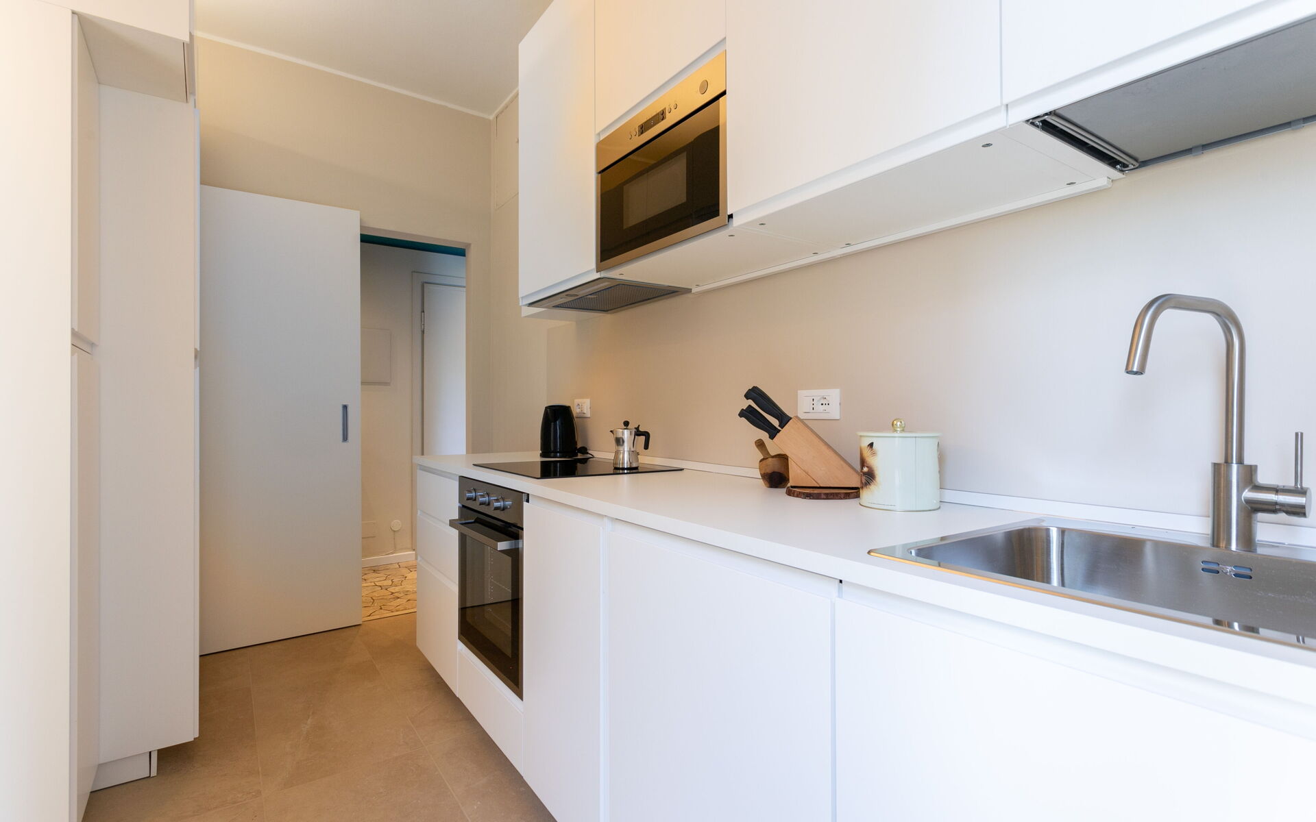 The separate kitchen is complete with a refrigerator, freezer, traditional oven, built-in microwave oven, 4-burner induction hob, dishwasher and washing machine.