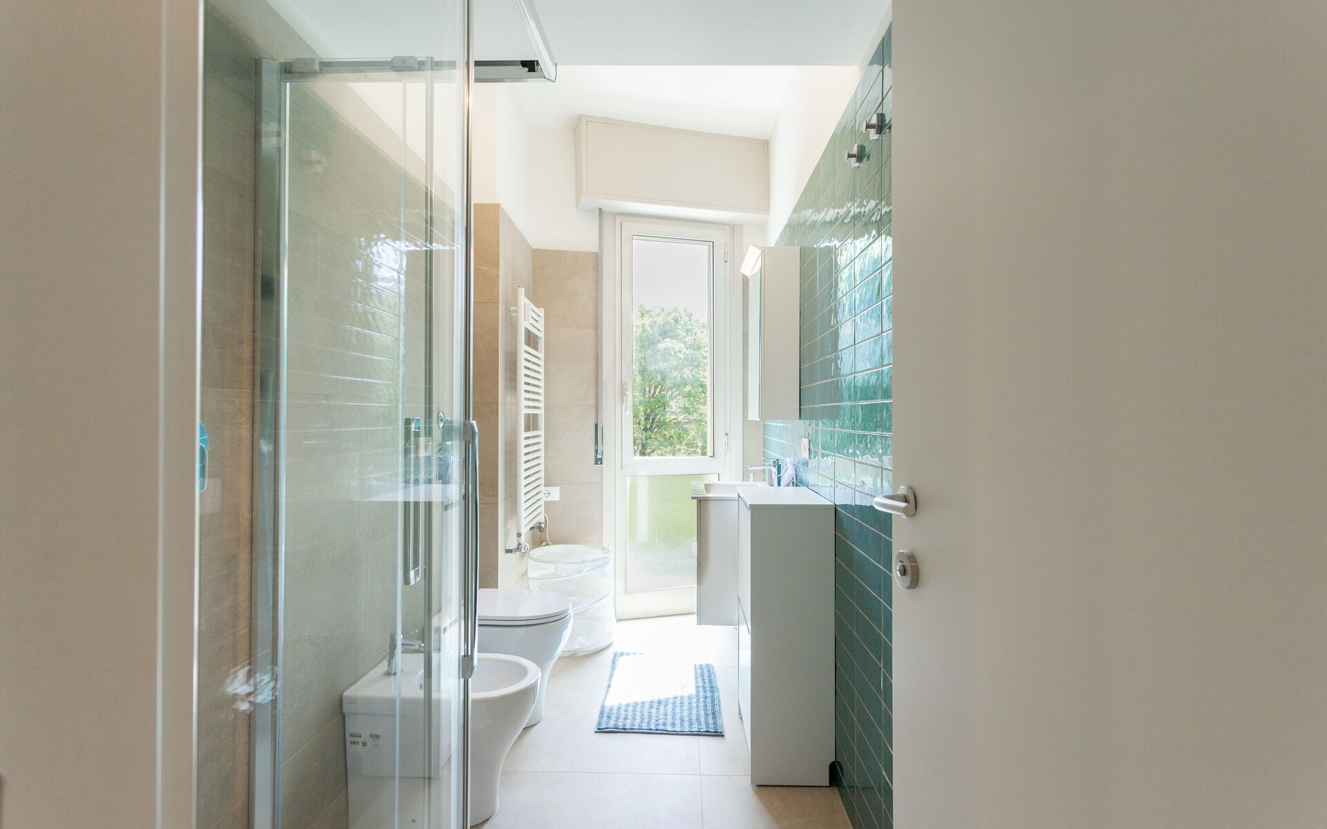 The bathroom with a window has a large shower, sink, toilet, and bidet.
