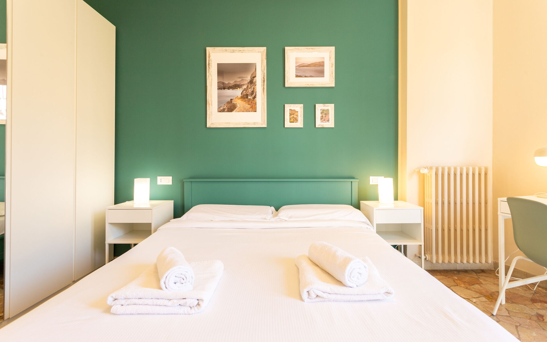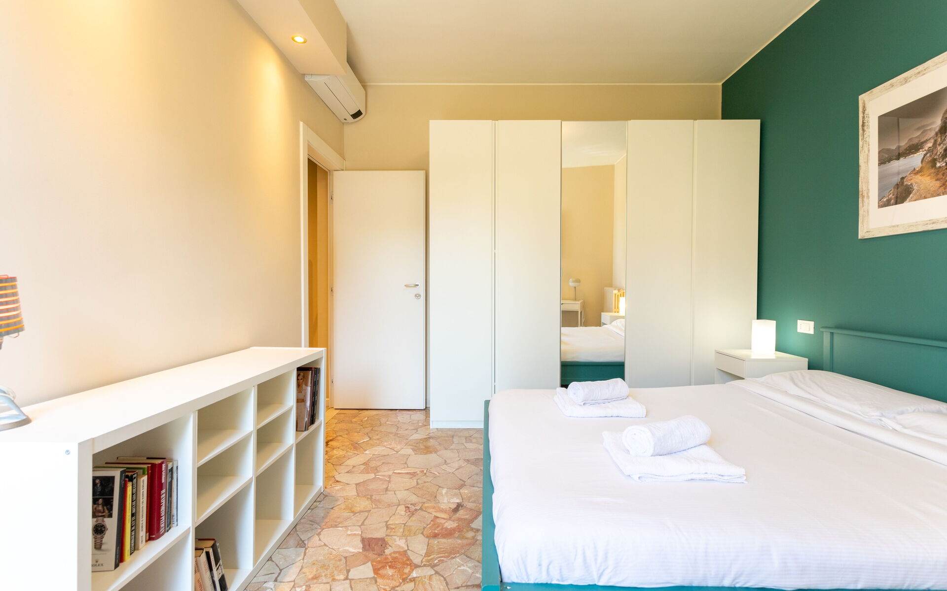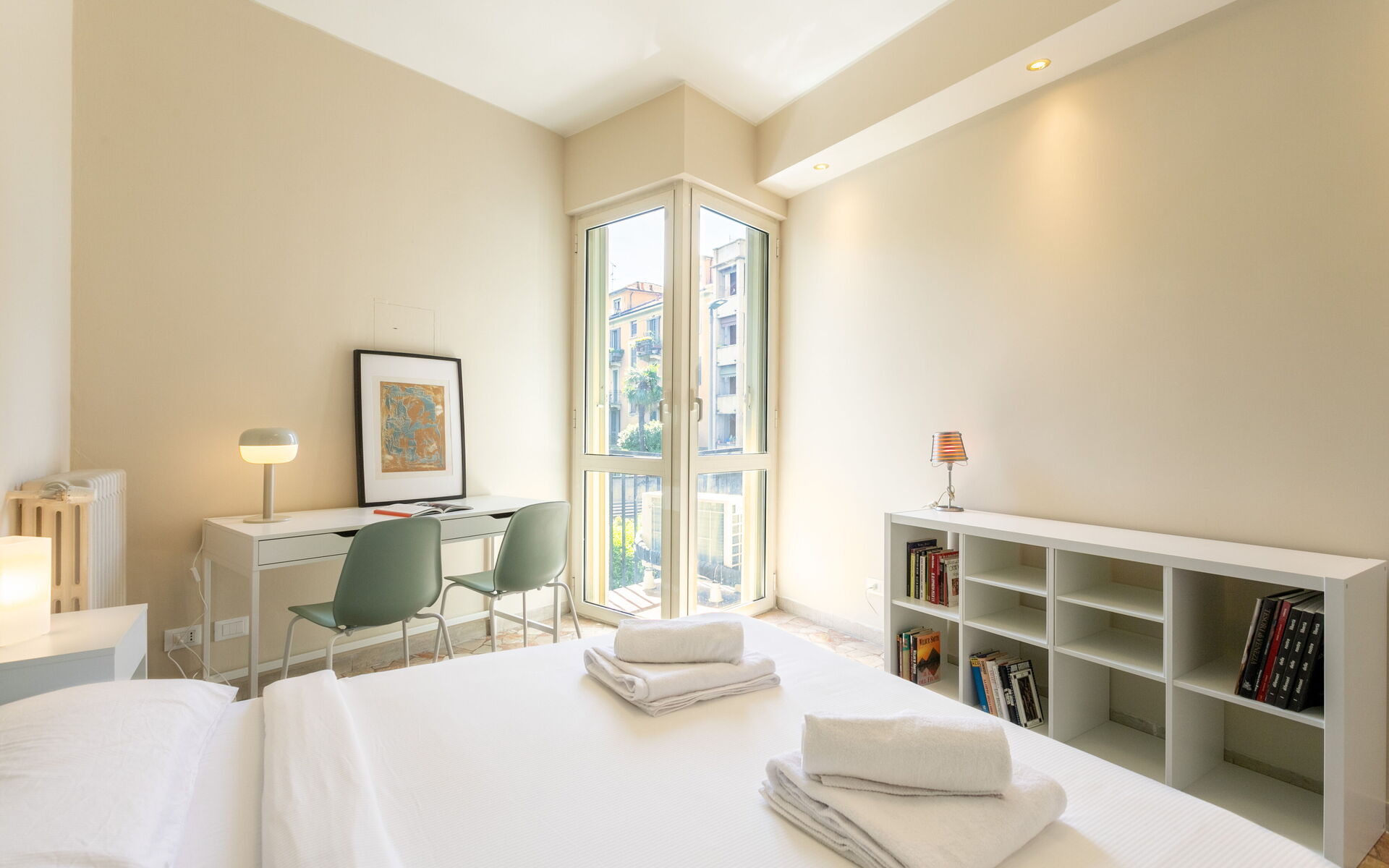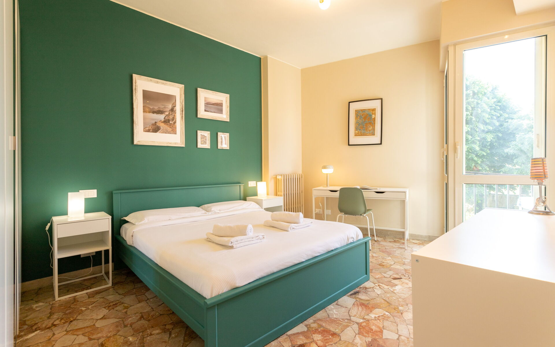 The master bedroom is equipped with a double bed, bedside tables with lamps, a desk, and a large 5-door wardrobe and overlooks a small balcony.
