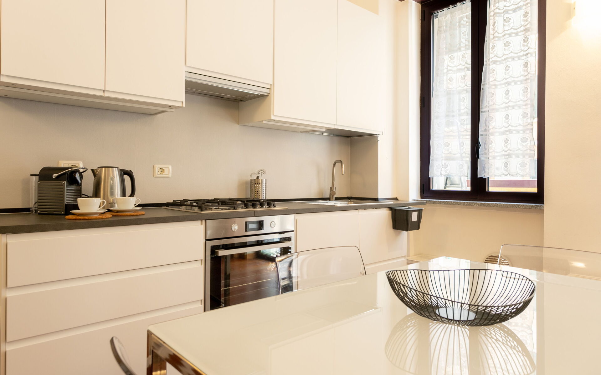 The open kitchen is complete with a refrigerator, freezer, traditional oven, dishwasher, microwave and coffee machine and gives access to the balcony.
