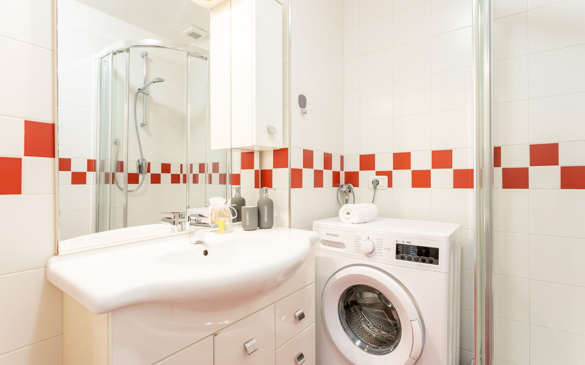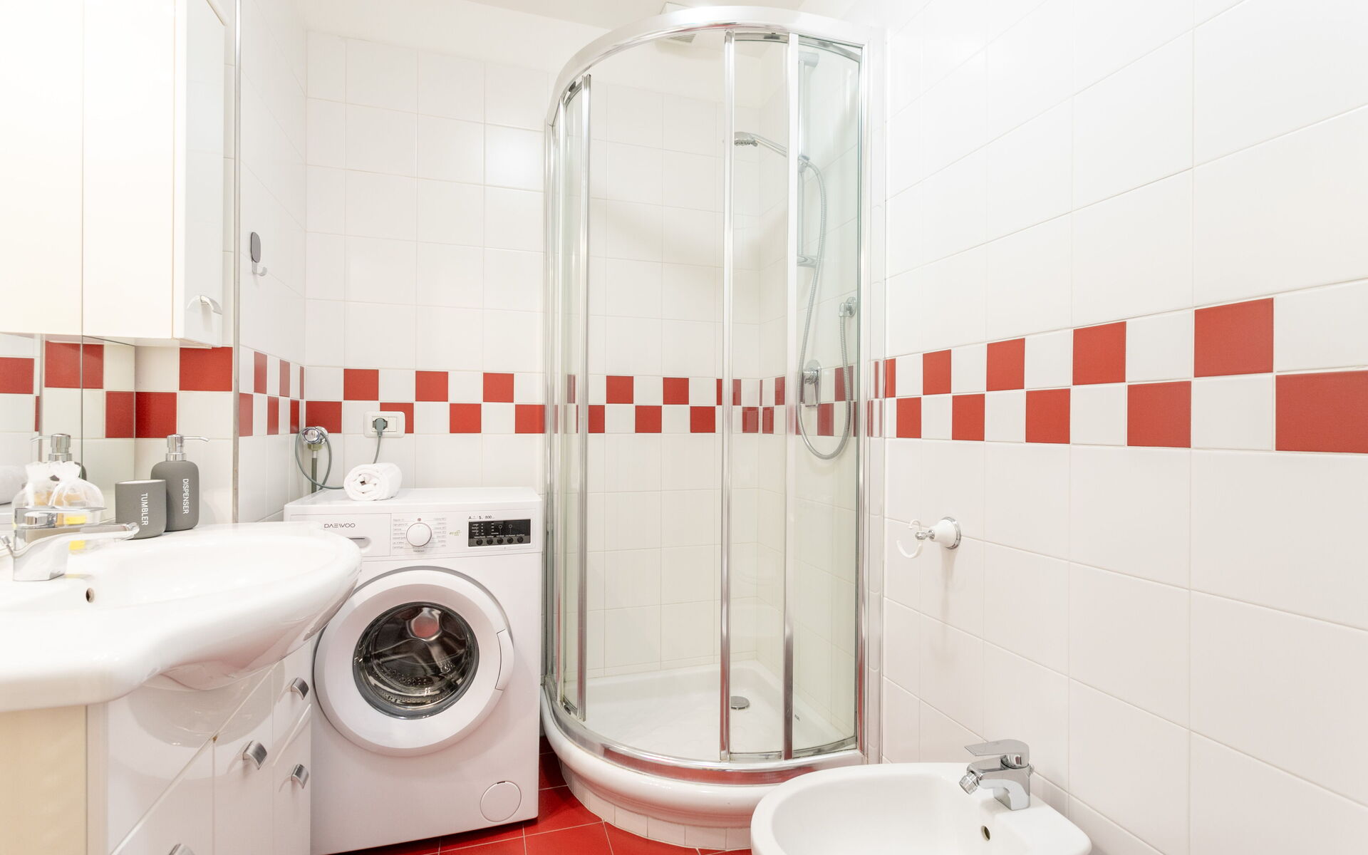 The large bathroom is complete with a large shower, sink, bidet, toilet and washing machine.
