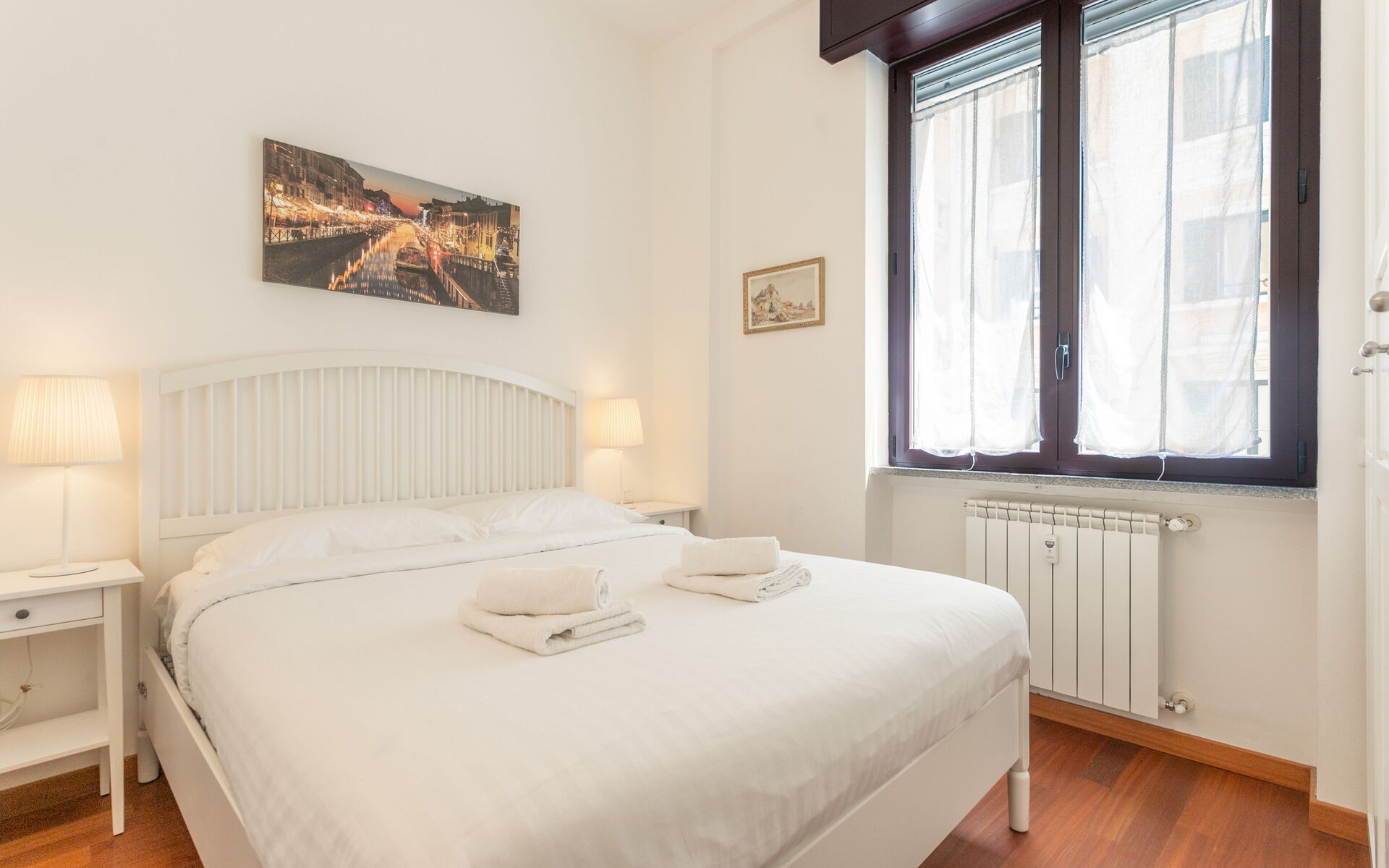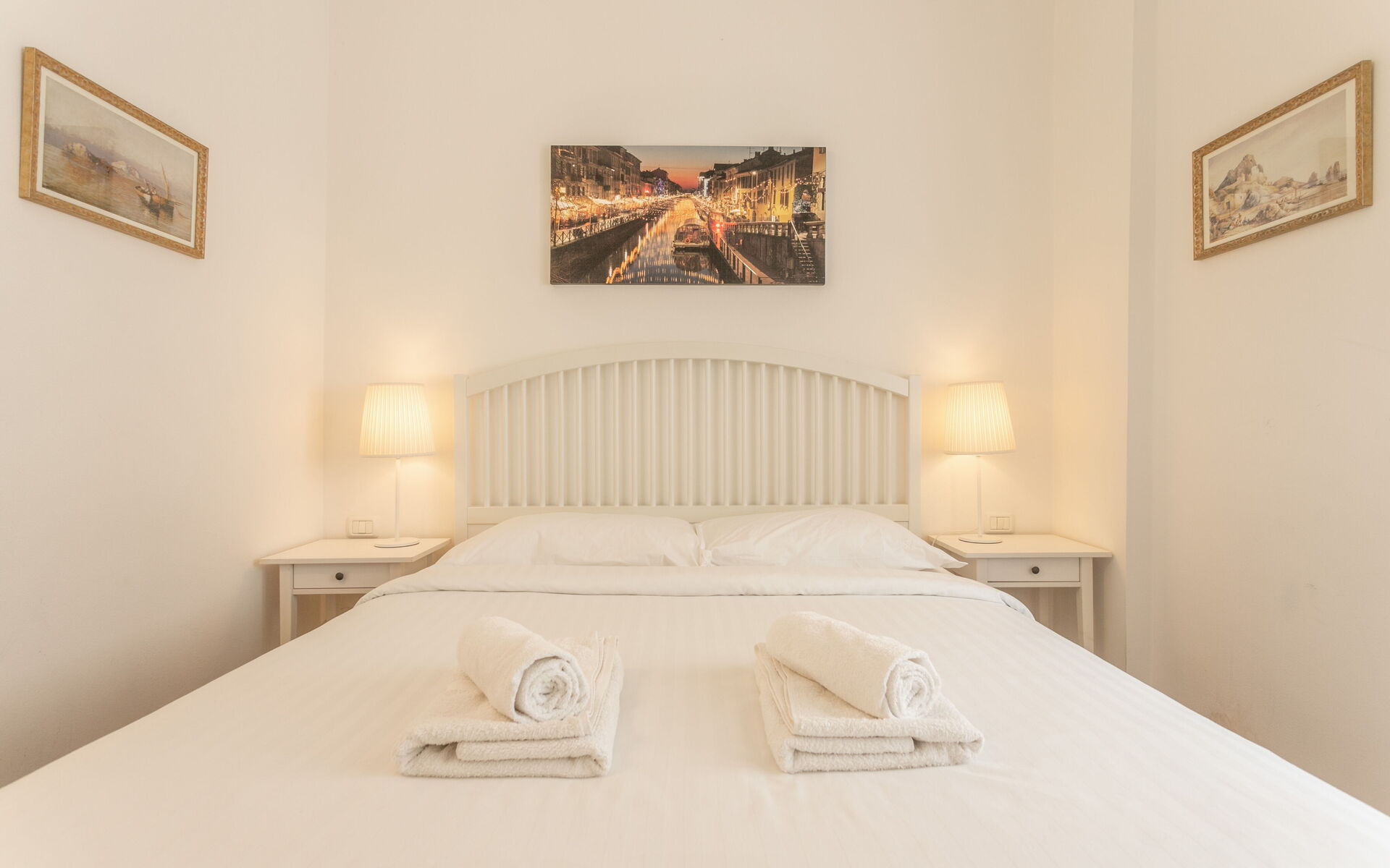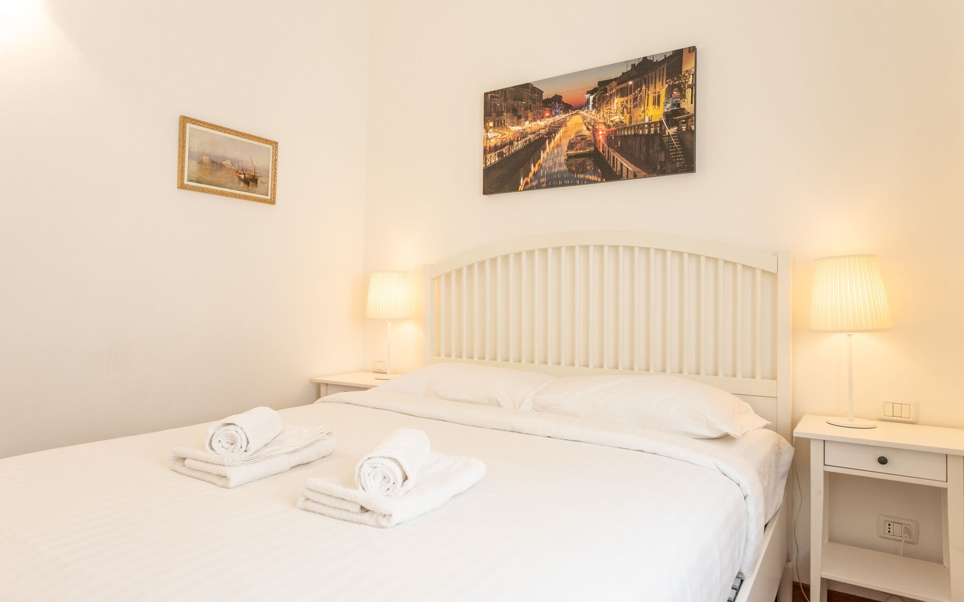 The bedroom has a double bed, bedside tables with lamps and a large 4-door wardrobe.