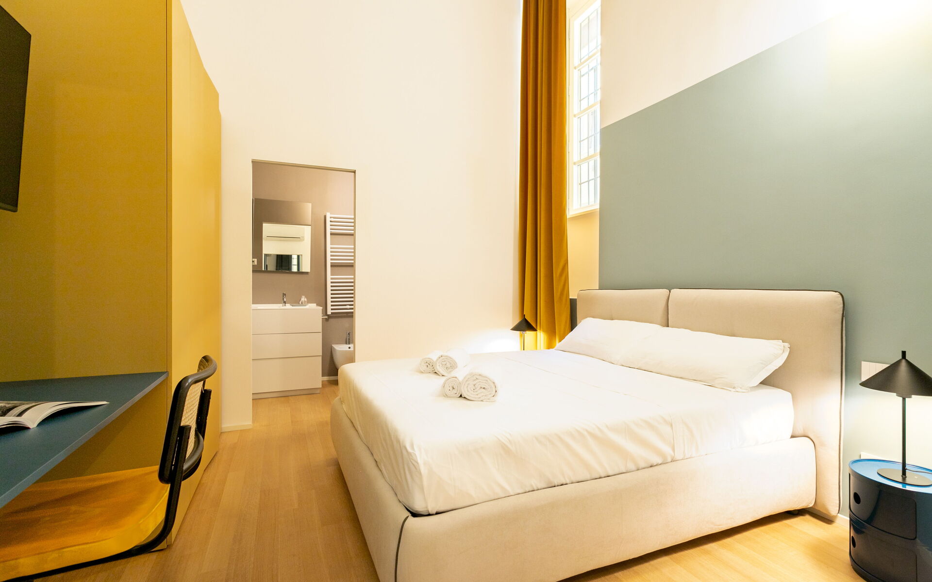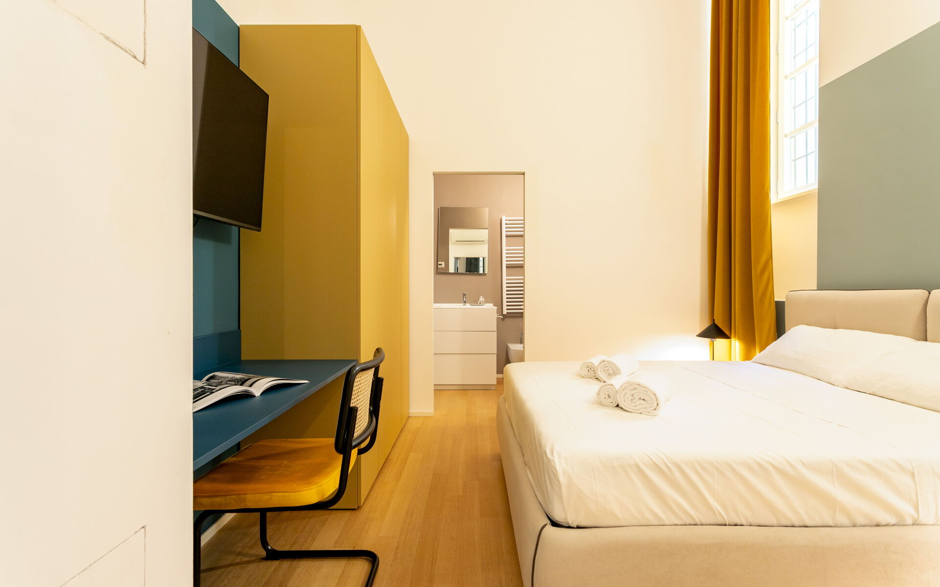 Continuing we find the bedroom with a double bed, a 6-door wardrobe and a work station with a desk.