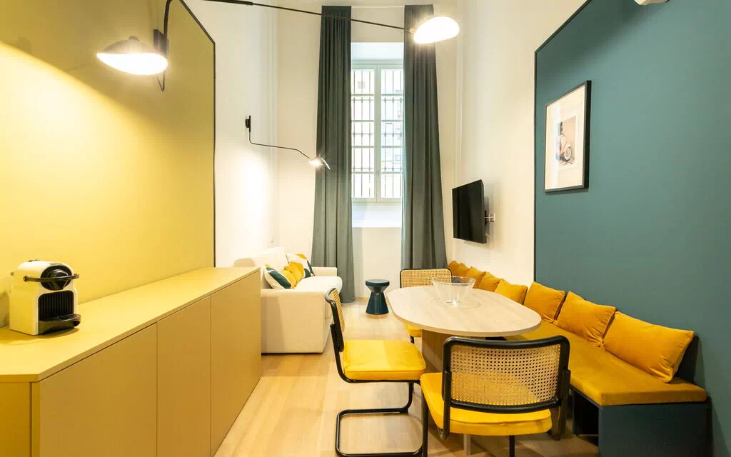 Upon entering, we find the living area with a table for 4 people, a French sofa bed with two seats, a 53-inch smart TV, and an open kitchen.