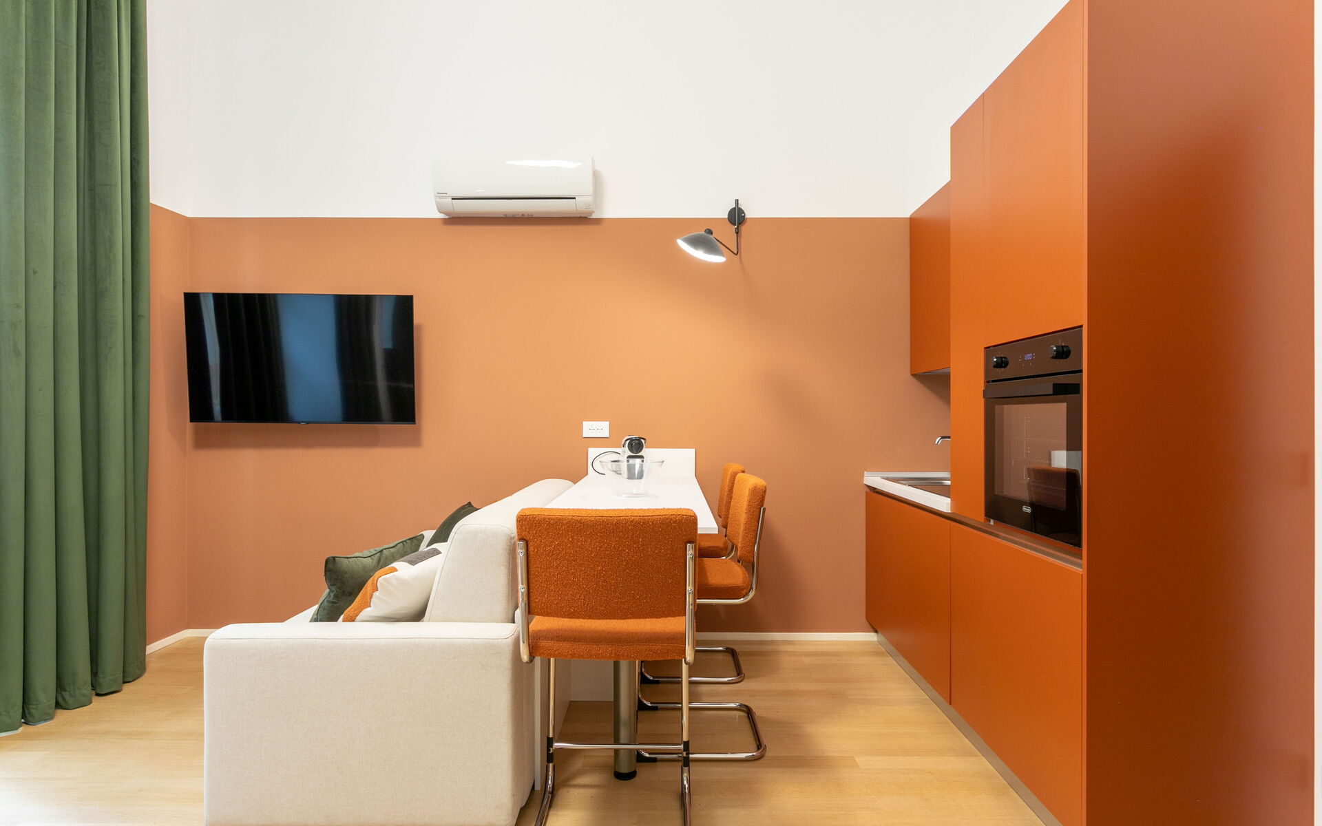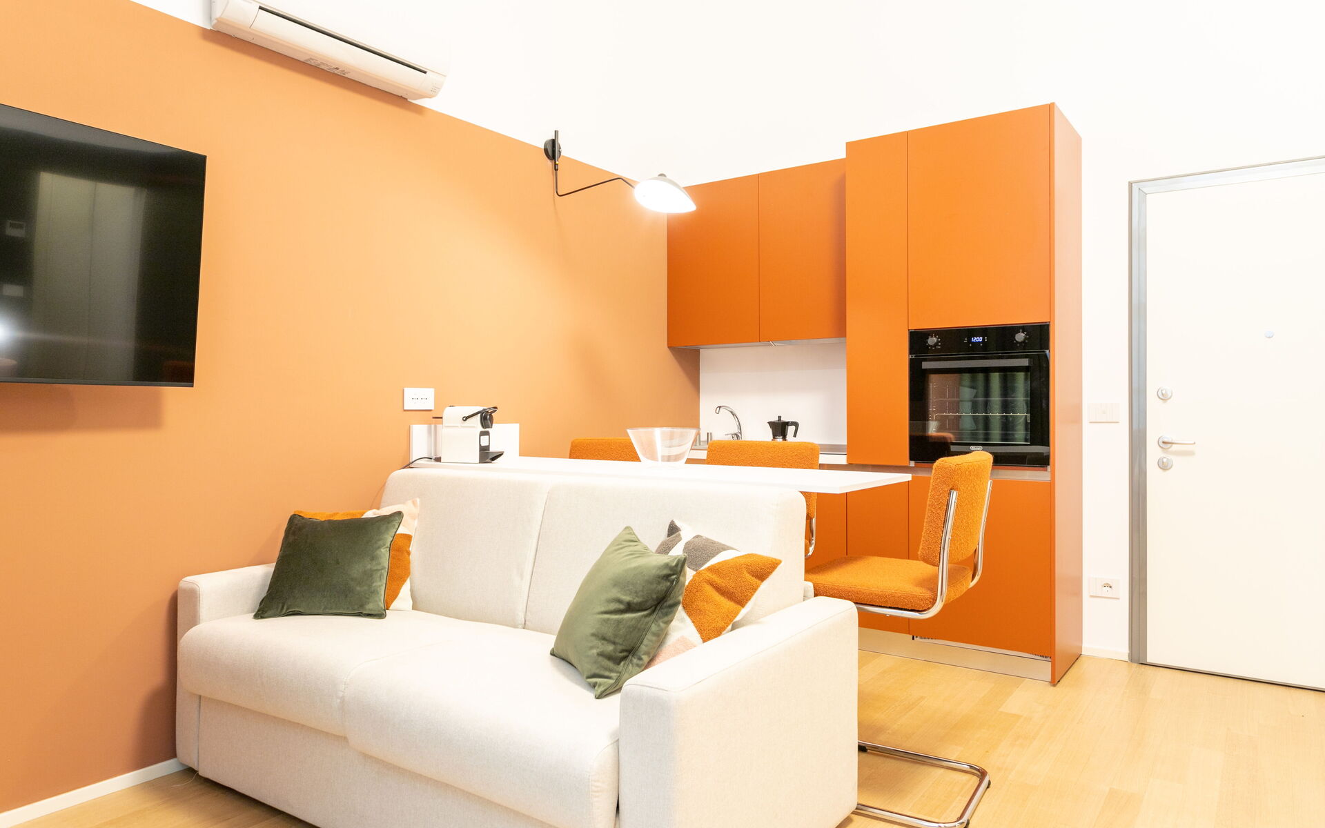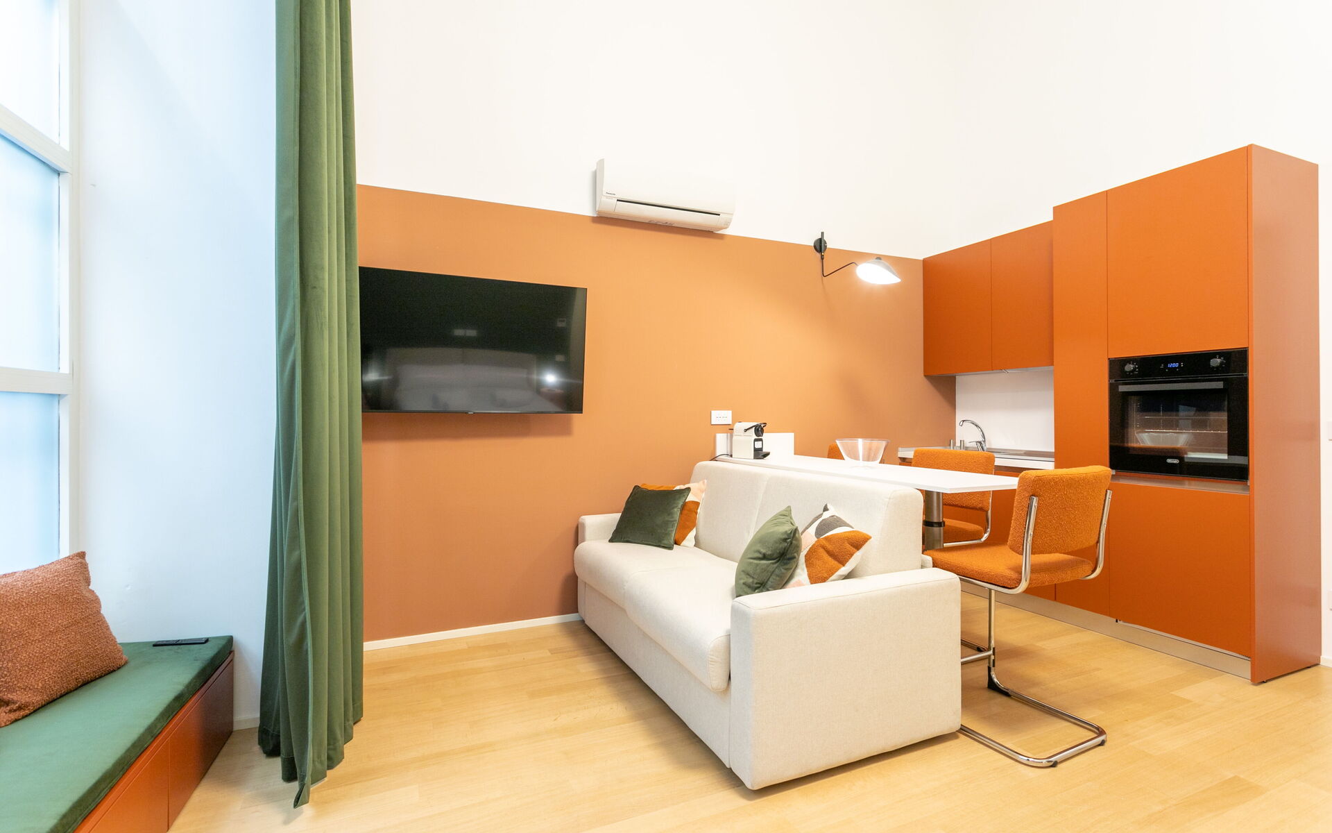 Upon entering we find the living area with a table for 3 people, a French sofa bed with two seats, a 53-inch smart TV and an open kitchen.
