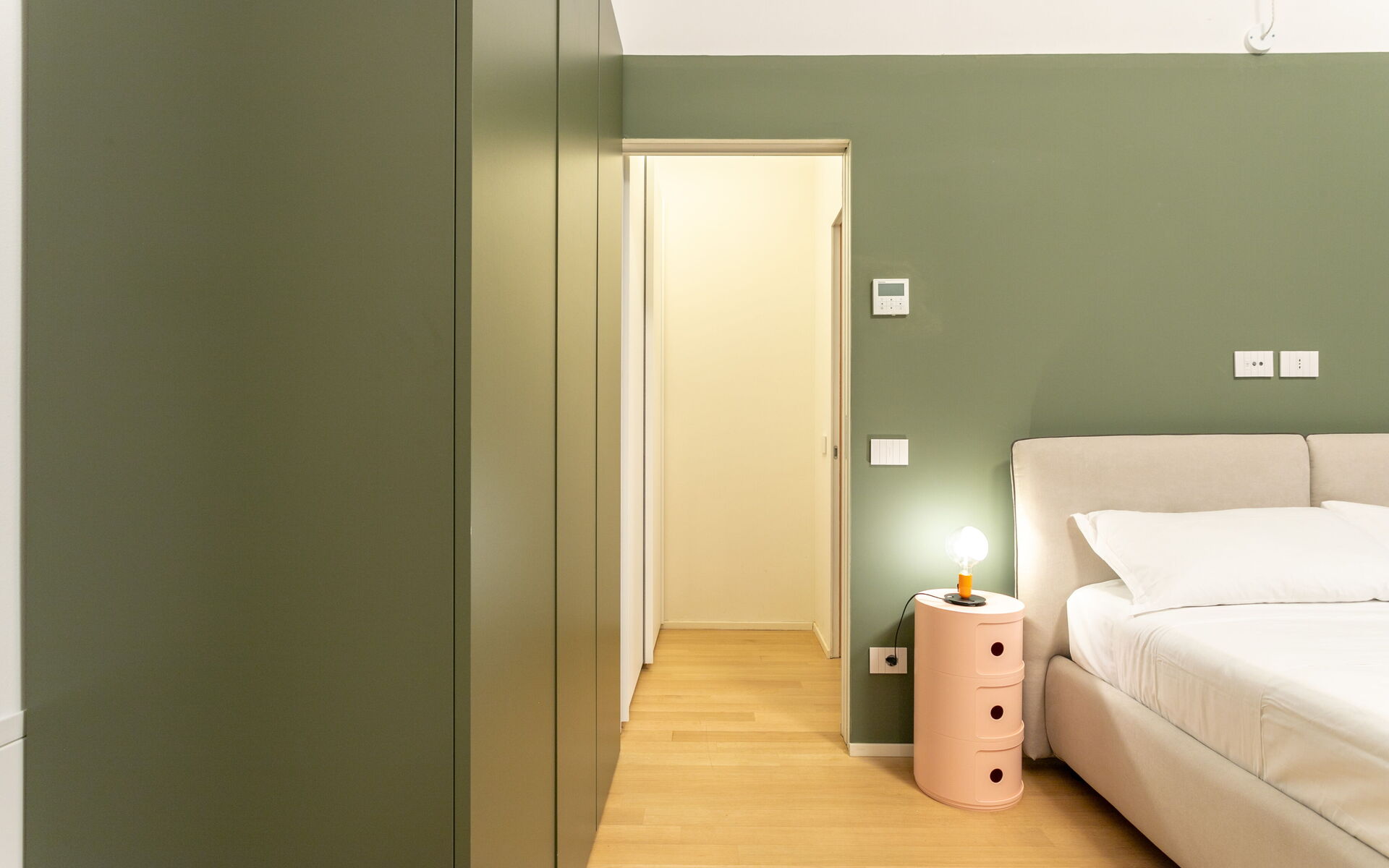 The sleeping area is equipped with a double bed and a 4-door wardrobe.
