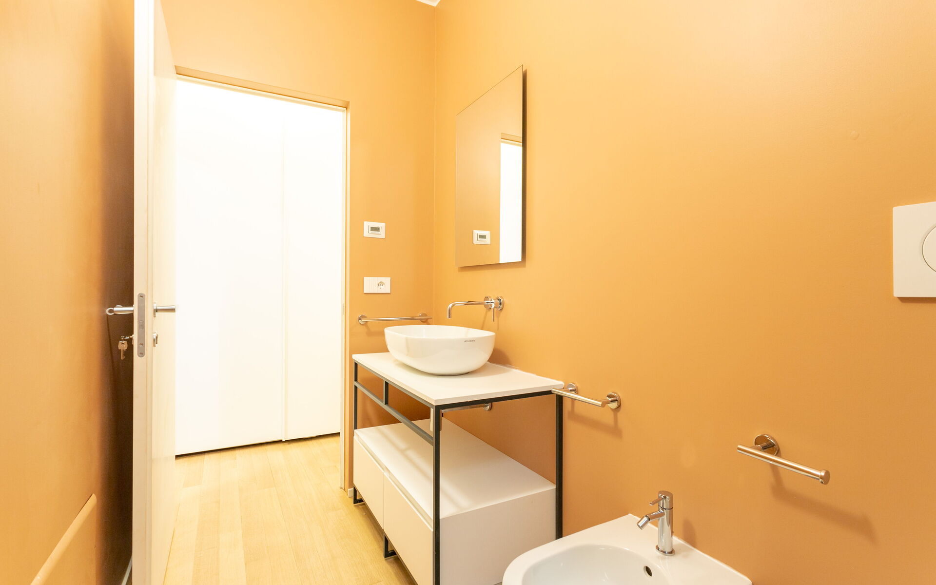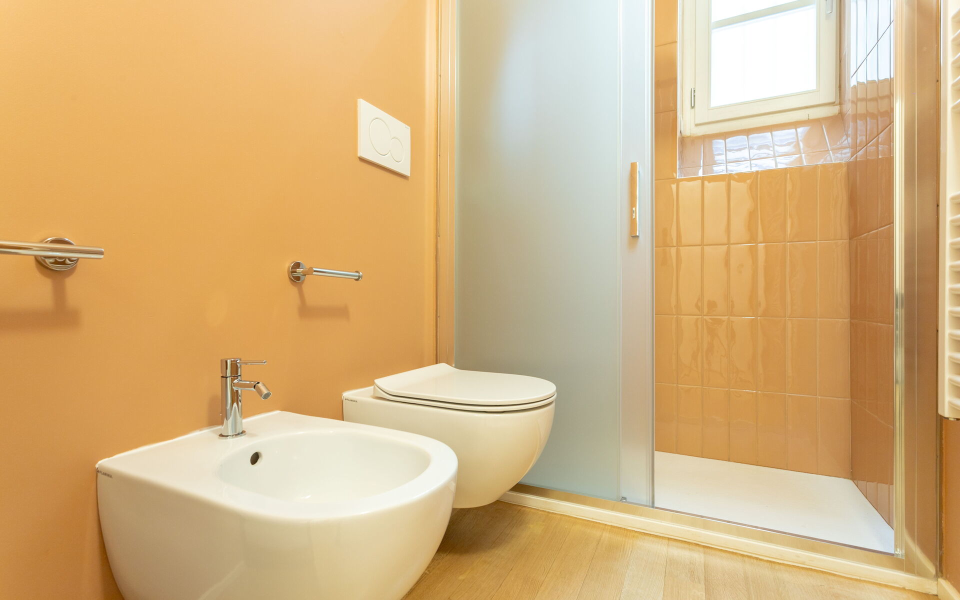 The apartment is completed by a bathroom with window, a large shower, bidet, toilet and sink.